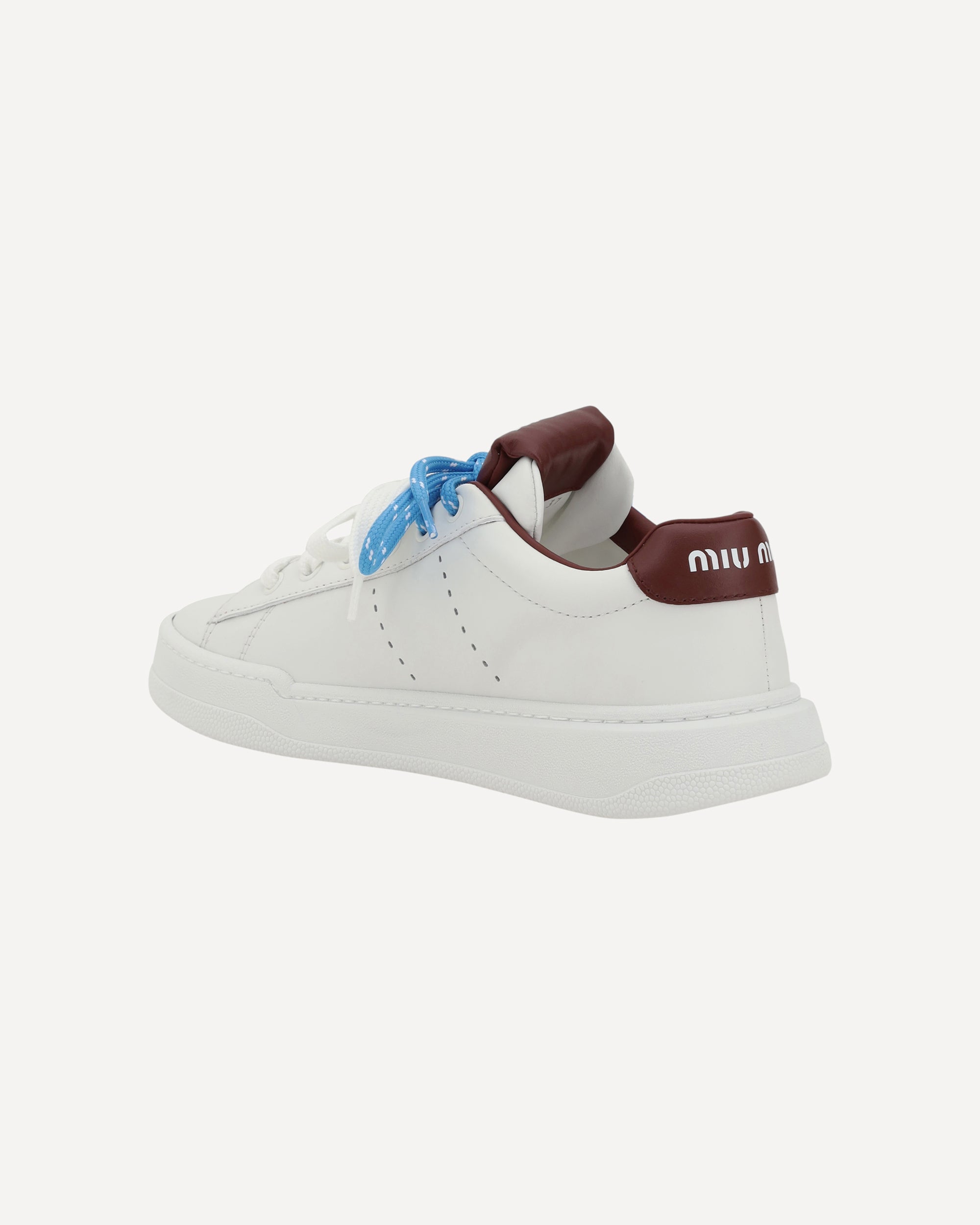 The Miu Miu leather Sneakers you describe are a sophisticated and distinctive design. The two-tone double lace-up closure on the front lends a touch of originality, while the round toe ensures comfort and style. The iconic monogram detail on the heel and sole represents the brand in an elegant and recognizable way. Stitching on the side panels adds a design accent, and the contrasting insole lends an additional element of uniqueness to the model.