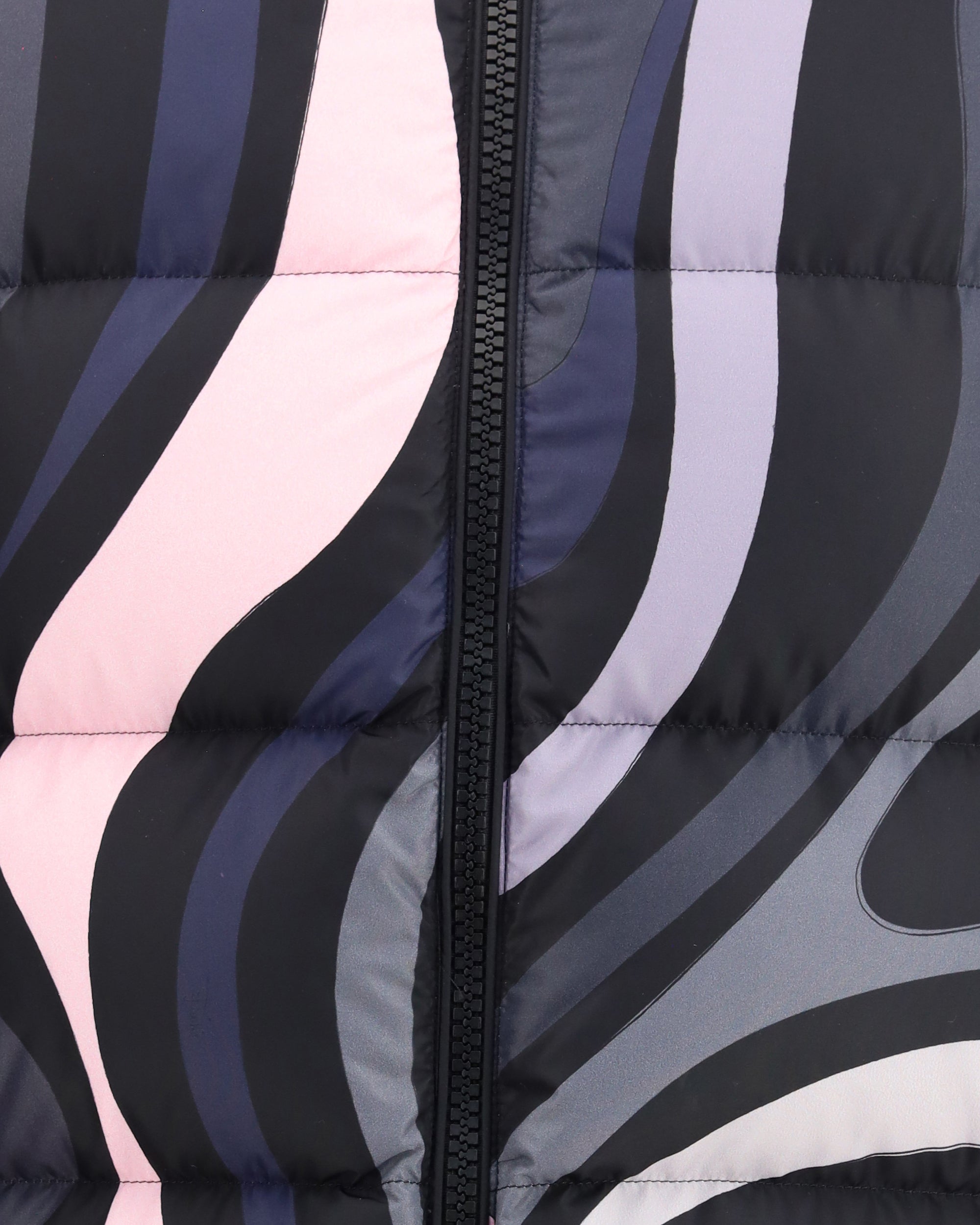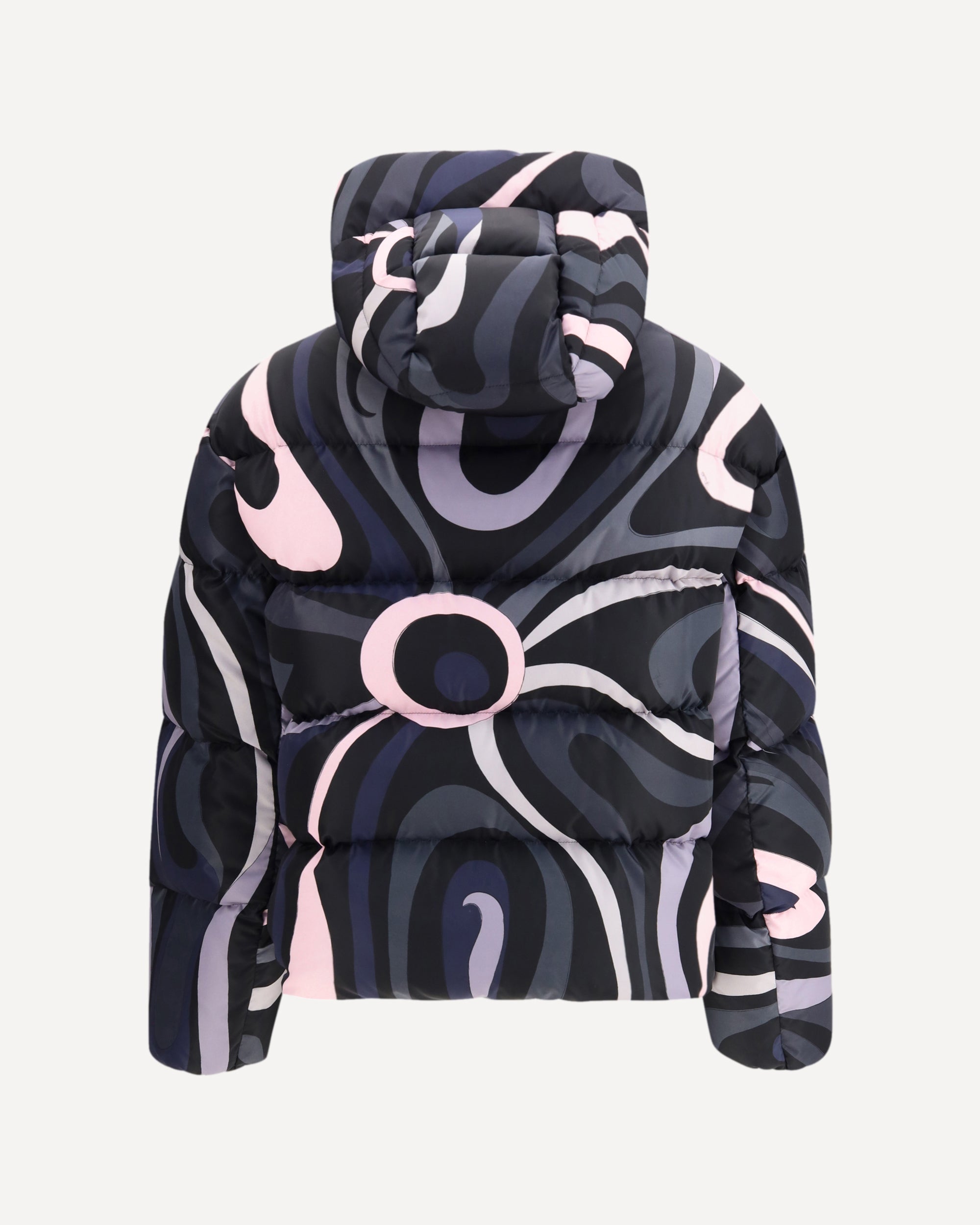 The Iride Down Jacket by Pucci is crafted from quilted fabric with duck down padding and an all-over print that makes each piece unique. The design features an adjustable hood, high collar, and front zip closure, completed by side pockets, long sleeves with elastic cuffs, and dropped shoulders. A drawstring at the hem allows for a customizable fit, while the slightly cropped cut brings a contemporary balance of comfort and style. Reflecting the Maison’s vibrant aesthetic, this jacket combines practicality and graphic creativity in an urban yet refined silhouette.
