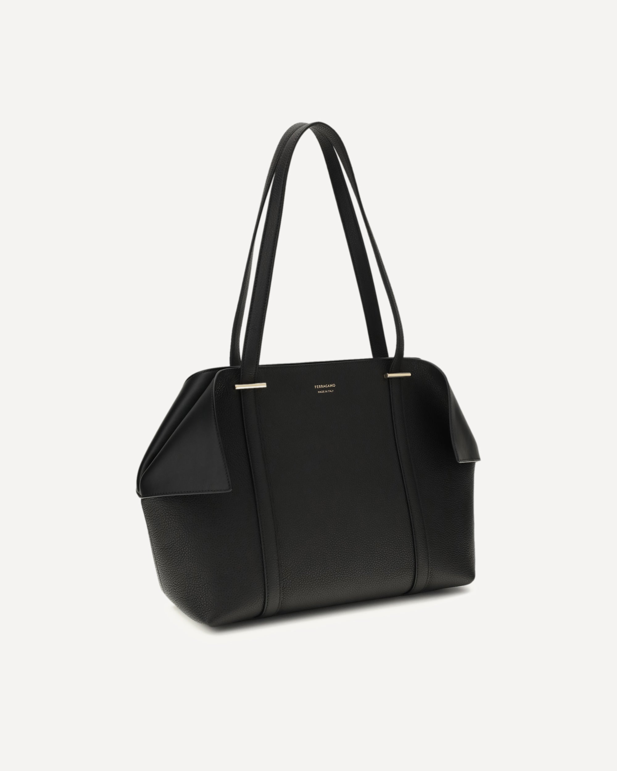The leather Tote Bag by Ferragamo is a sophisticated and versatile accessory, perfect as an everyday carryall. The soft shape and folded sides recall the fluidity of fabric, creating an elegant and dynamic effect. The leather handles, with a line that continues on the sides, and the metal details with Gancini profile add a distinctive touch of luxury. Lightweight and practical, this tote adapts to the body and offers an immediate refined allure, ideal for completing everyday looks with style and class.