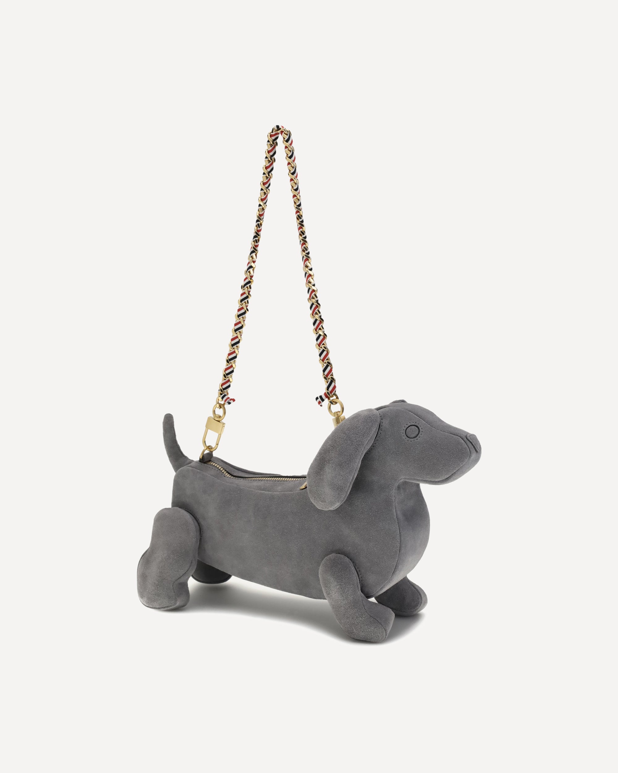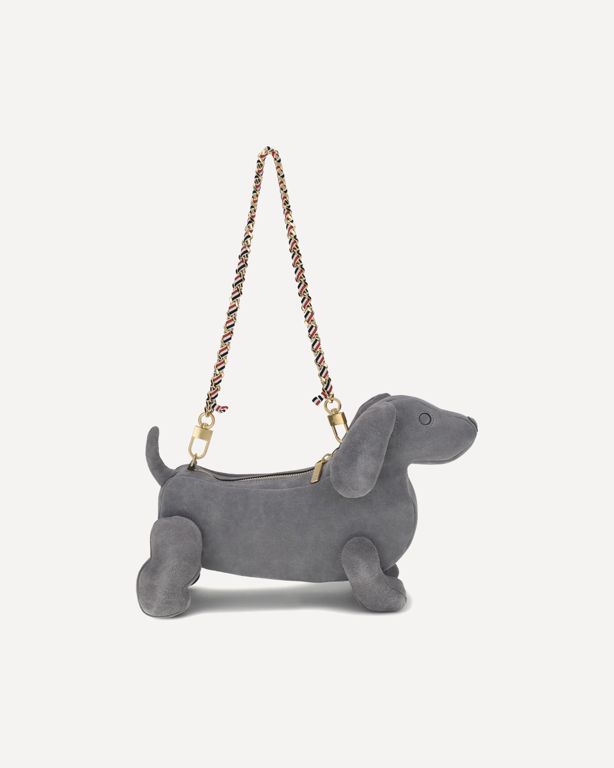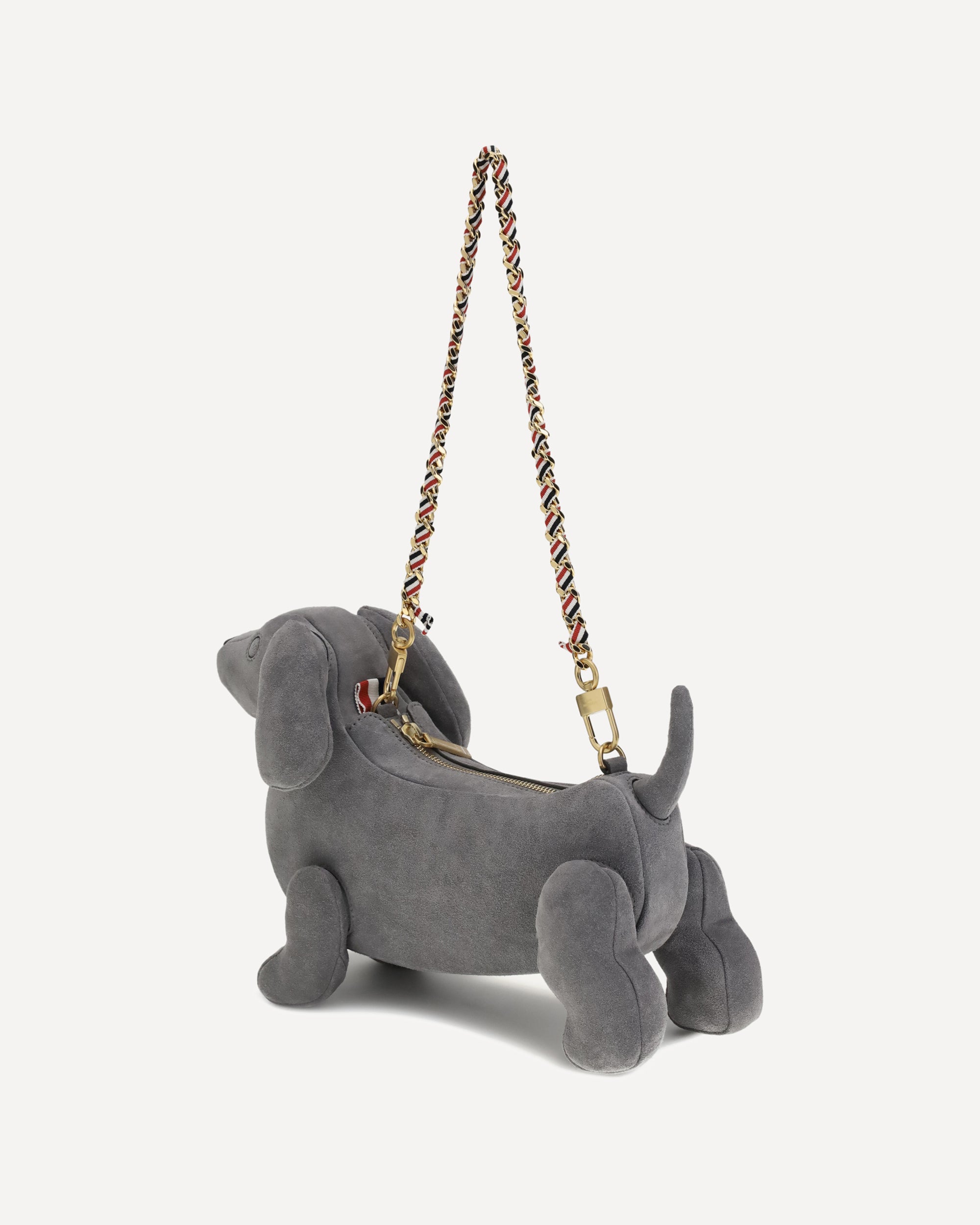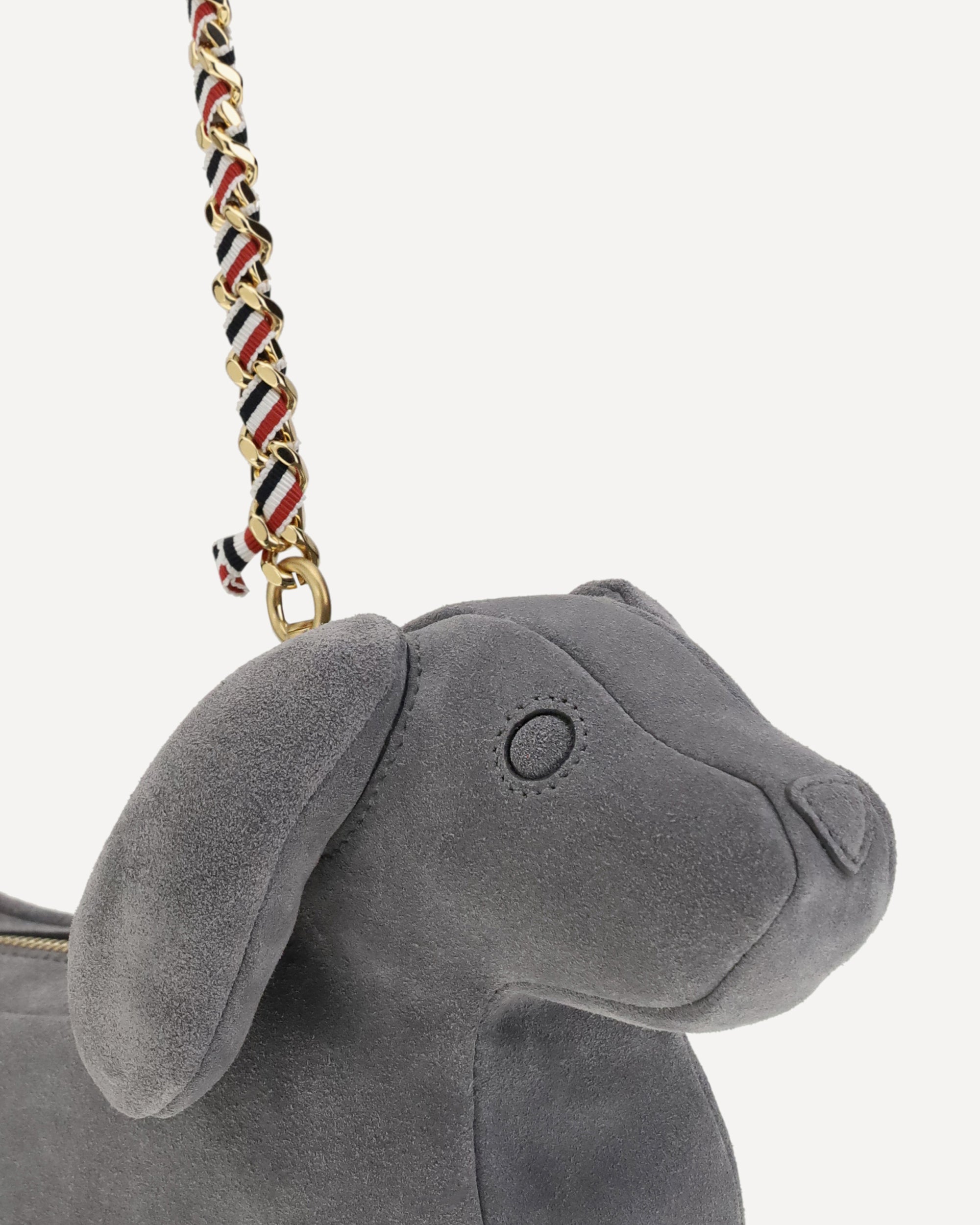 Hector suede Shoulder Bag by Thom Browne is an elegant and original accessory inspired by the iconic Hector dachshund silhouette. Featuring a removable chain strap with tricolor ribbon, it combines playful design with the brand's signature sophistication. The single compartment interior provides essential space for personal items, making this bag a perfect balance of style and functionality.