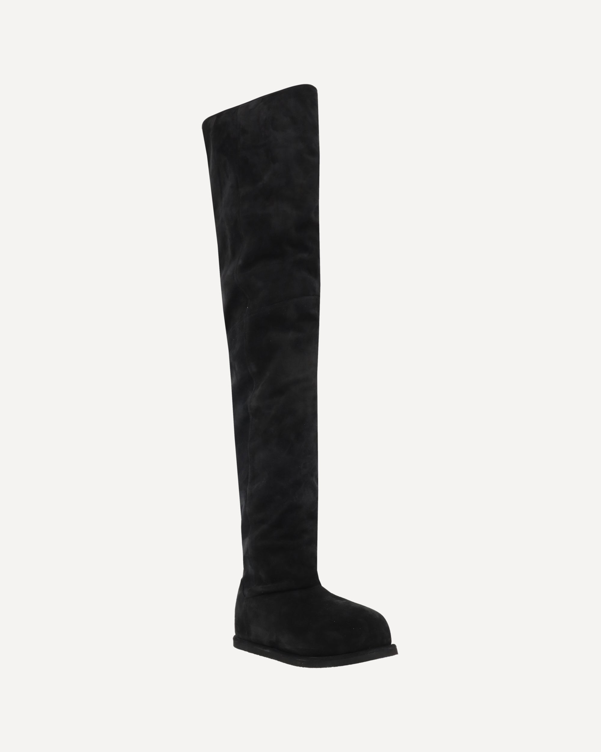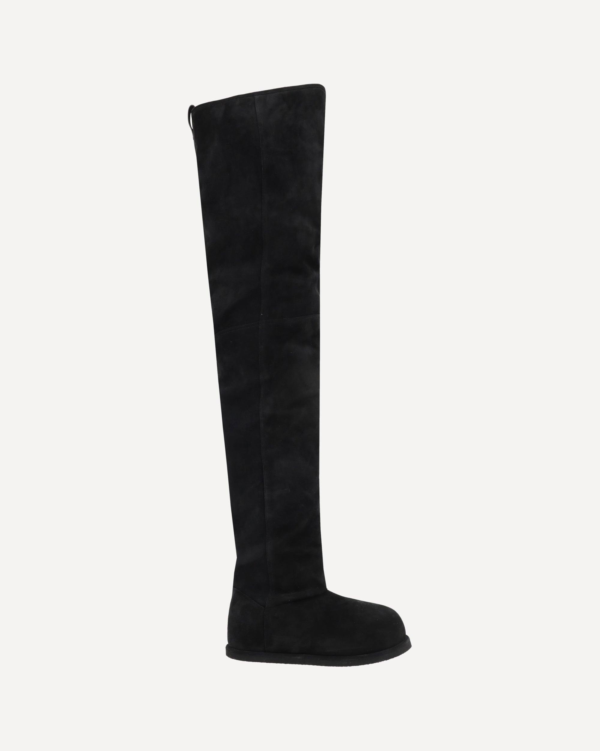 Amina Muaddi's Heidi suede Boots are a tall style with a round toe and flat sole. An elegant and sophisticated design, perfect for any occasion, combining comfort and style.