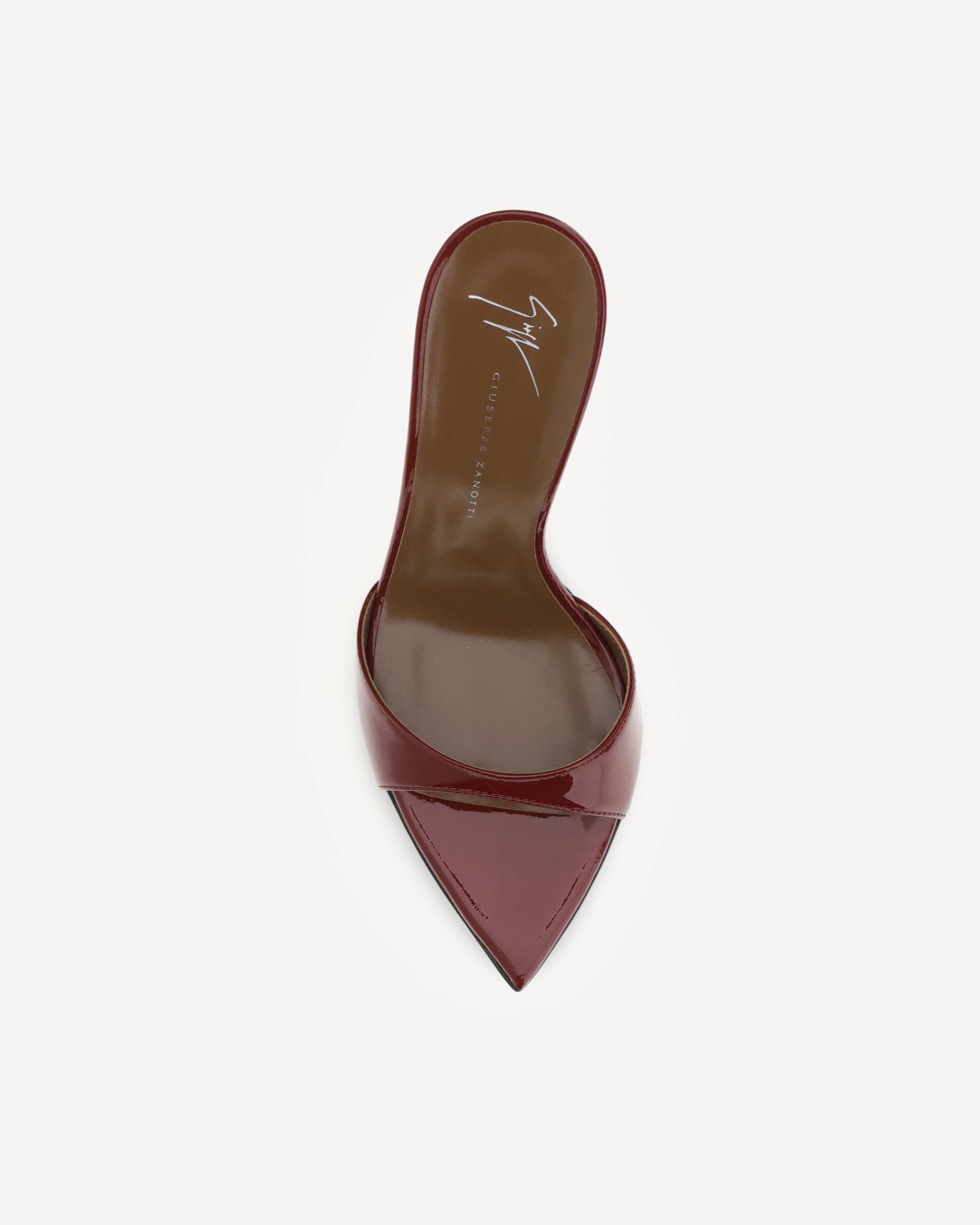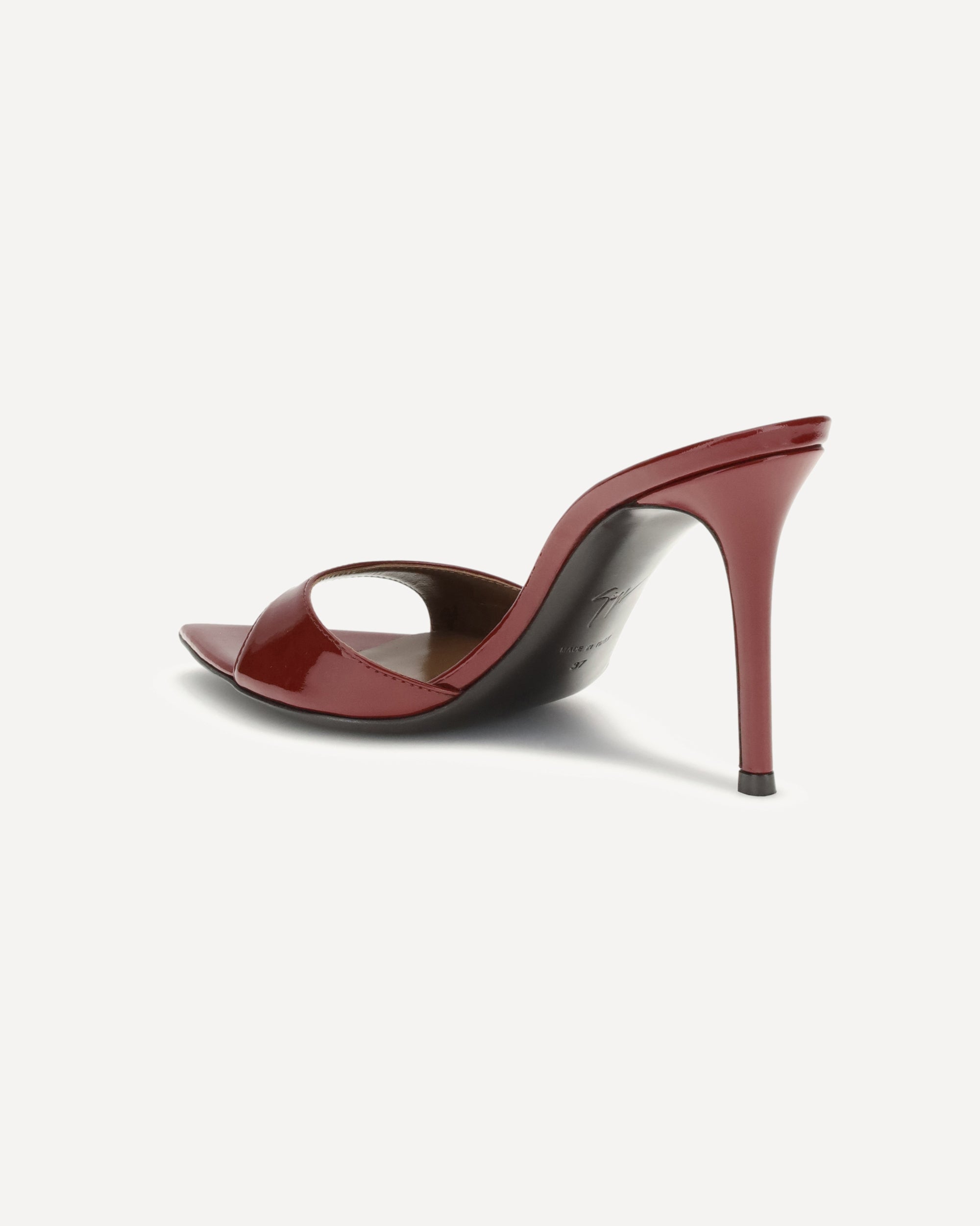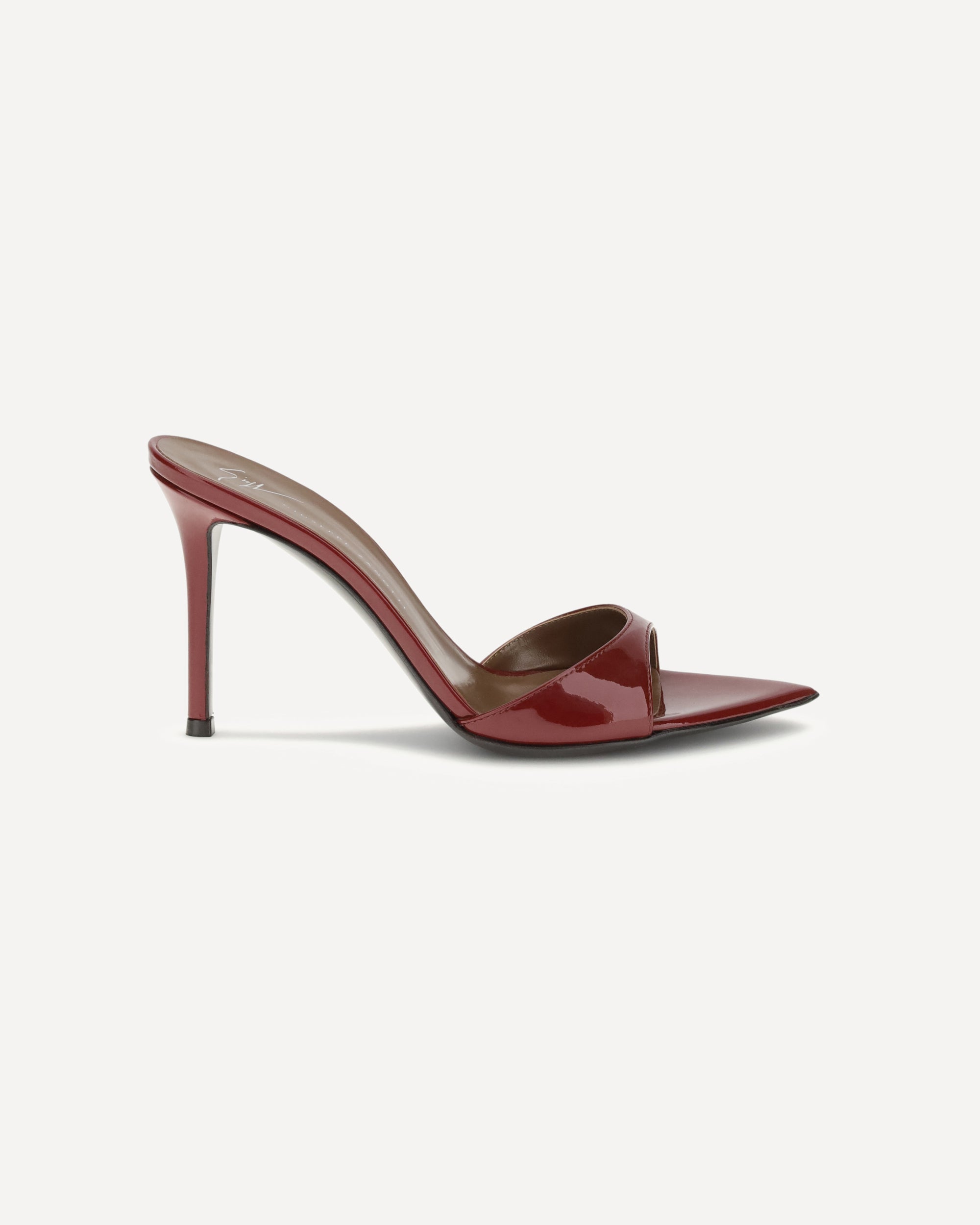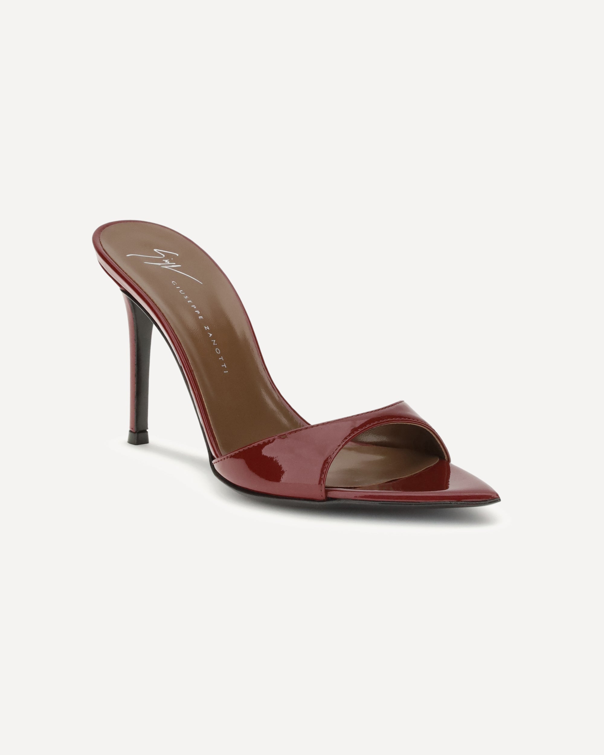 Giuseppe Zanotti's Intriigo Mule Sandals express elegance and sensuality in an essential form. Made of glossy patent leather, they feature a pointed open-toe design that slims the foot with sophistication. The stiletto heel completes the silhouette, adding a bold and feminine touch, perfect for special evenings or sophisticated looks.