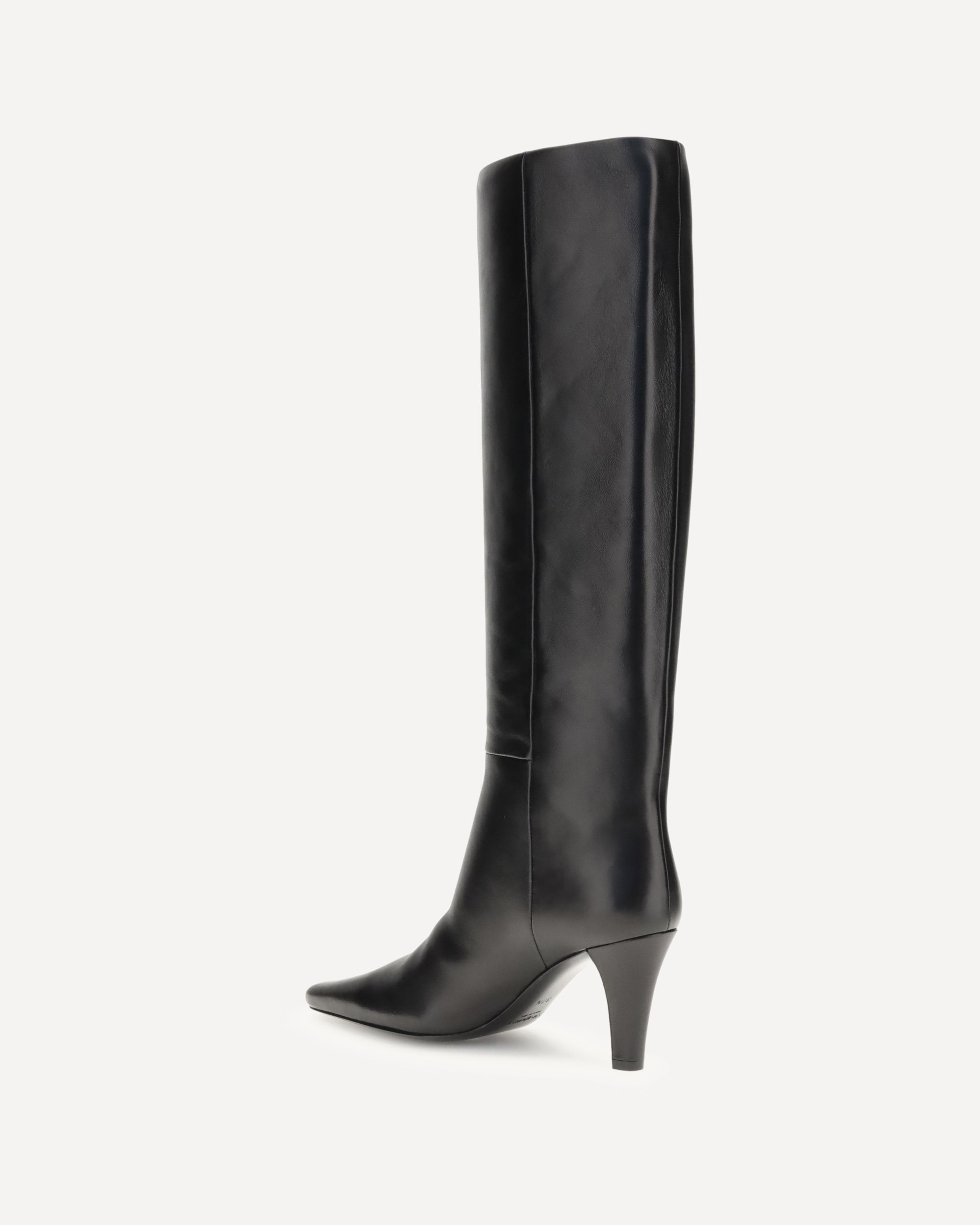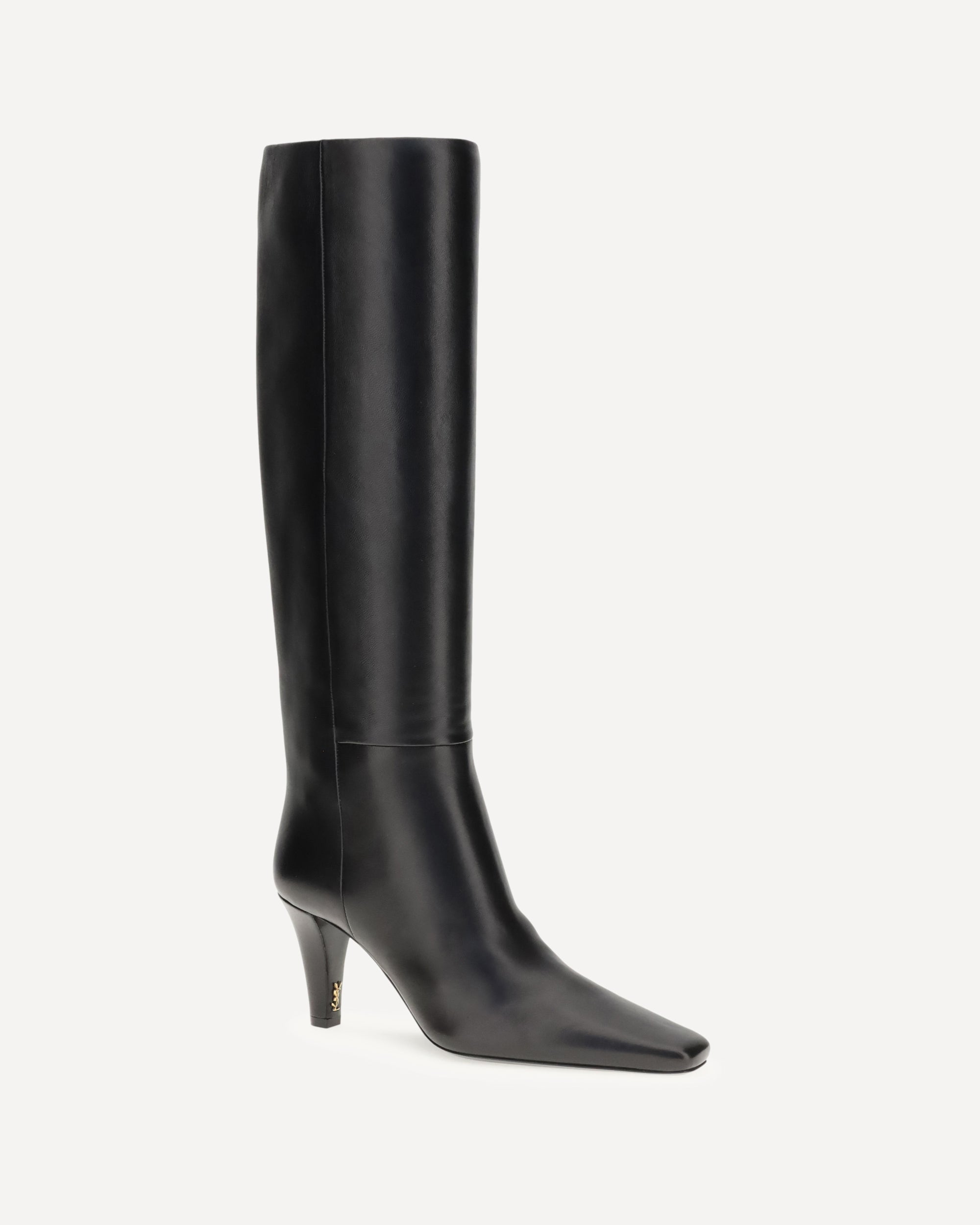 Saint Laurent's High Leather Boots embody a bold and refined style. With knee-high height and a slightly squared toe, they stand out for their modern, minimalist design. The cone heel adds a touch of character, while the no-lock, slip-on construction ensures clean lines and effortless elegance.
