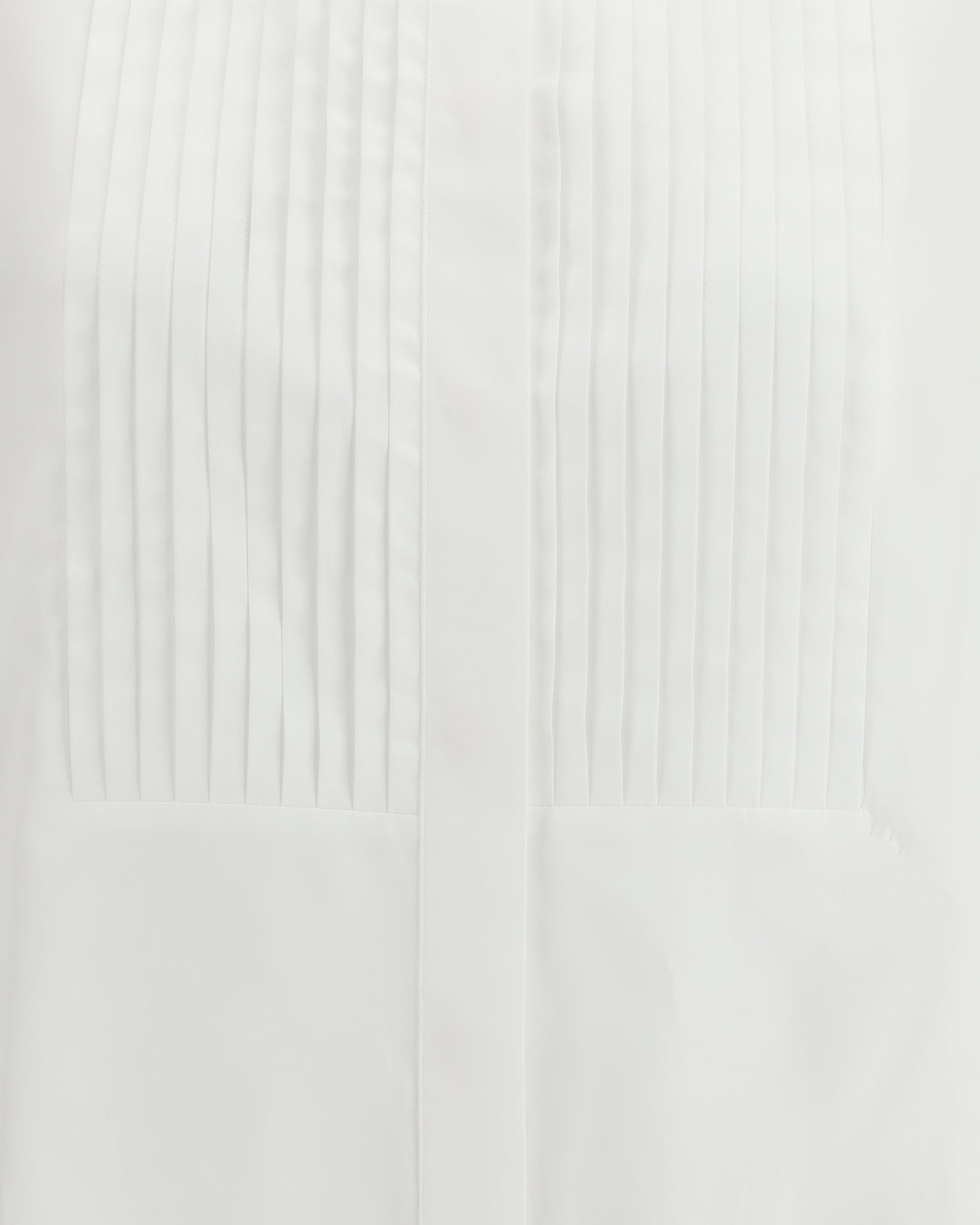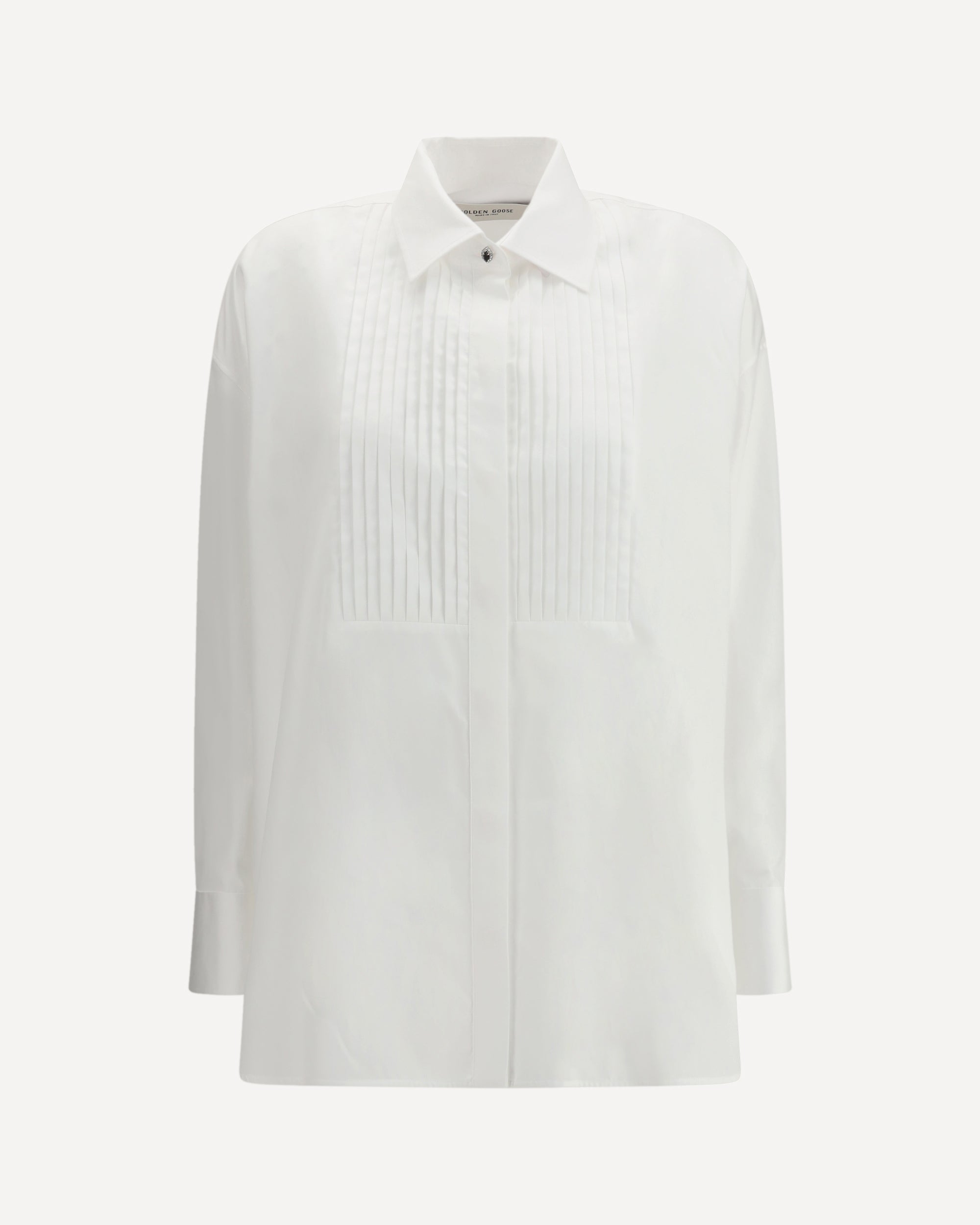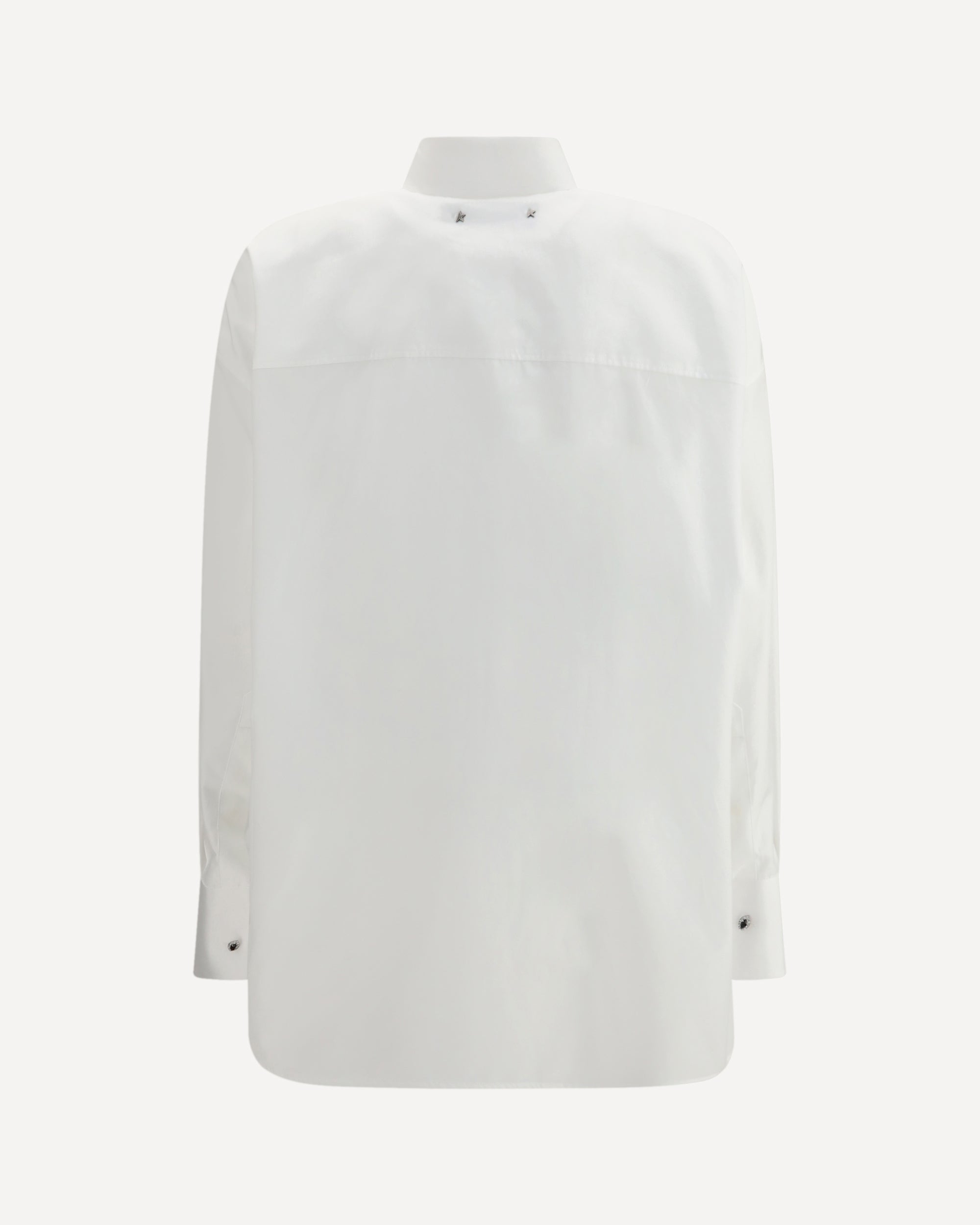 The oversized cotton poplin Shirt by Golden Goose elevates a wardrobe essential with luminous refinement. Its generous, structured silhouette is defined by a back yoke, a concealed placket with mother-of-pearl buttons, and the signature jewel button at the collar. A pleated front bib adds tailored sophistication, while jewel-embellished cuffs bring a touch of shine. The iconic double star at the back completes the shirt with Golden Goose’s unmistakable identity.