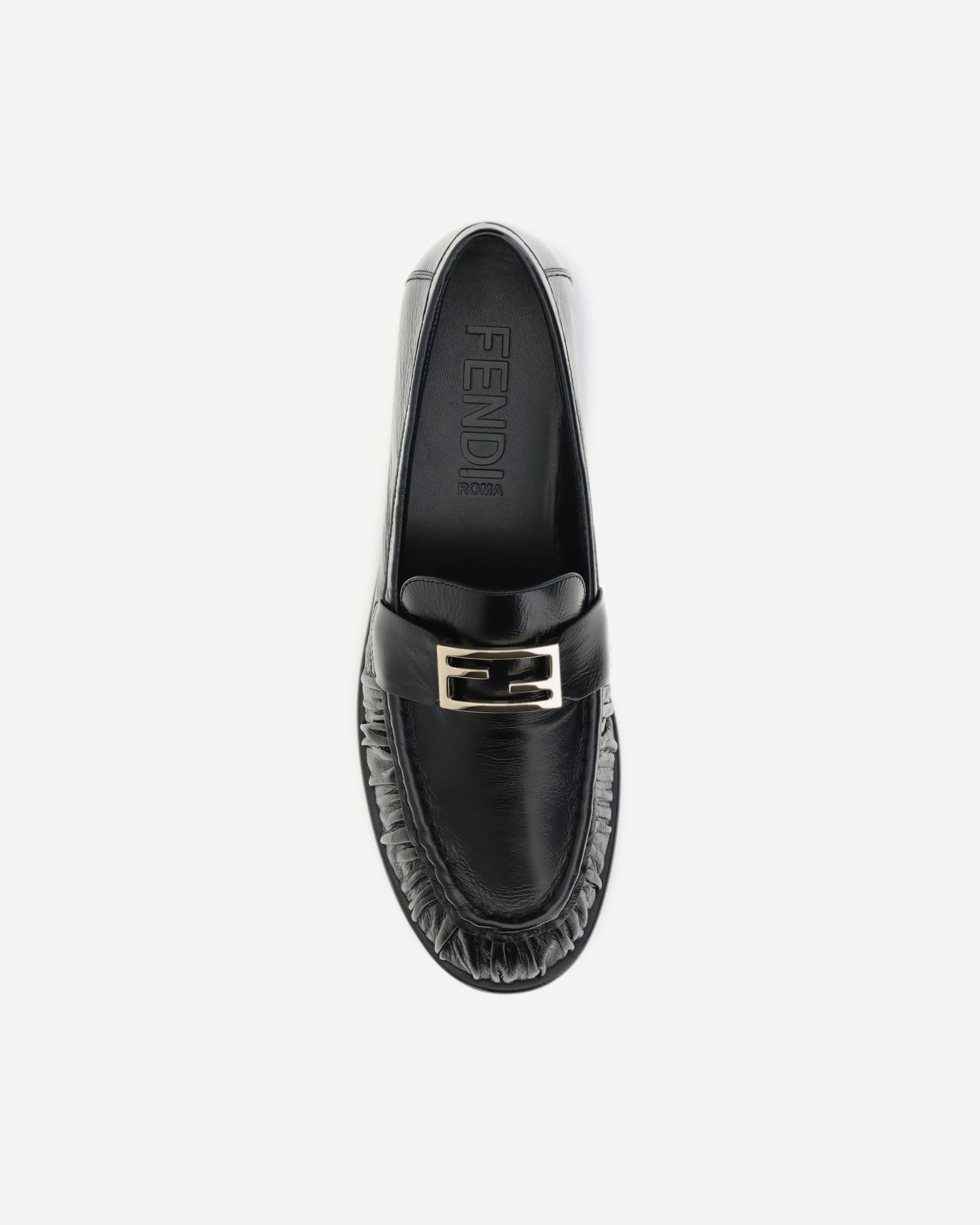 The nappa Baguette Loafers by Fendi are a perfect example of timeless elegance and Italian craftsmanship. Crafted from soft nappa leather, they're embellished with the iconic FF metal detail on the vamp, the Maison's signature symbol. The round toe lends a classic, harmonious silhouette, while the logo print on the inside completes the design with a touch of exclusive sophistication.