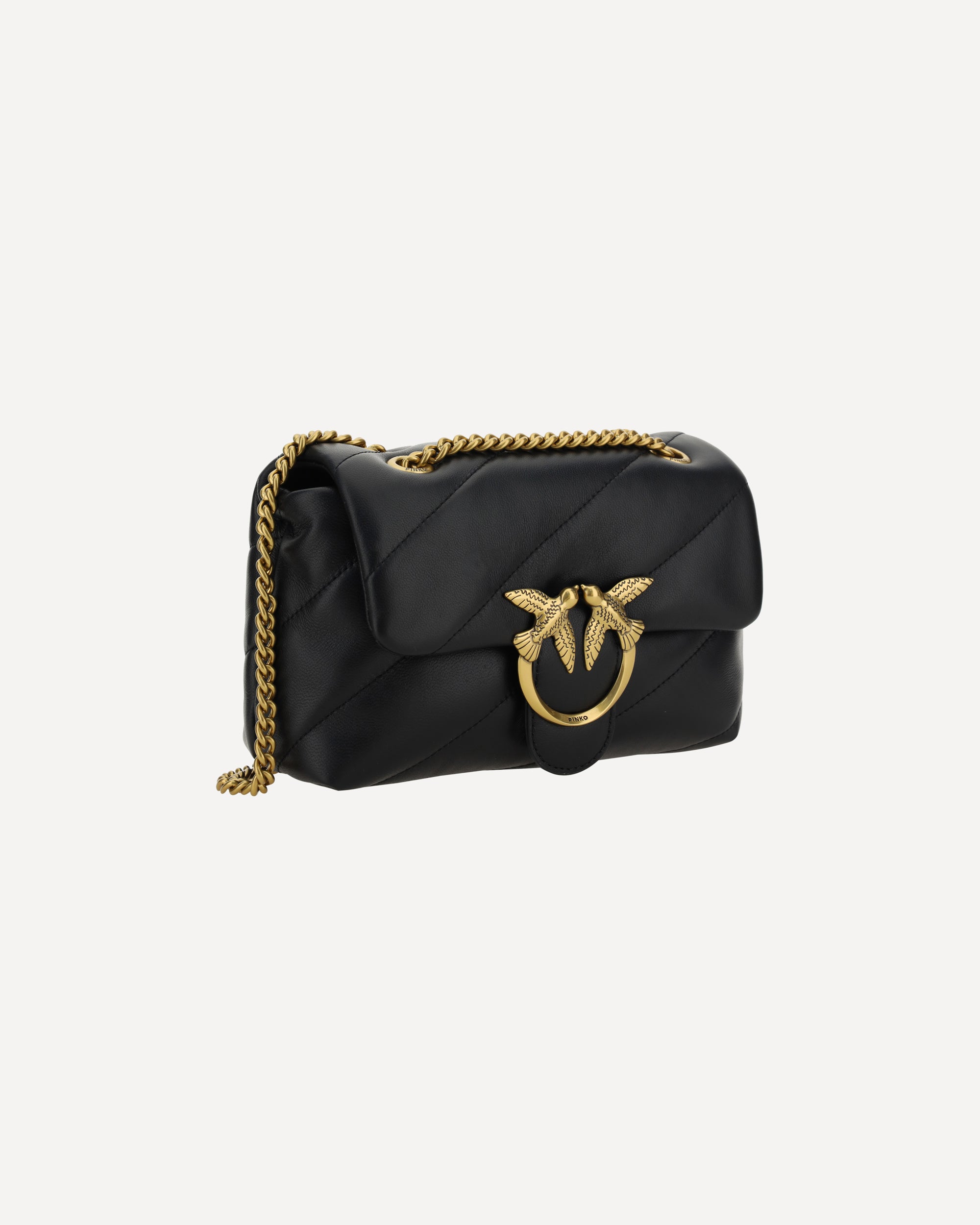 Pinko's Love Mini Puff leather Shoulder Bag is a stylish and fashionable accessory. The front closure with magnetic button ensures practicality and security, while the iconic Love Birds logo, gold-plated and embossed on the front, adds a touch of luxury. The quilted and padded design gives the bag a rich and sophisticated texture. Inside, there is single interior compartment for excellent organization. The sliding chain strap offers versatility, allowing it to be worn on the shoulder or crossbody. On the back, the brand's iconic tone-on-tone embroidered monogram adds a discreet and refined detail.