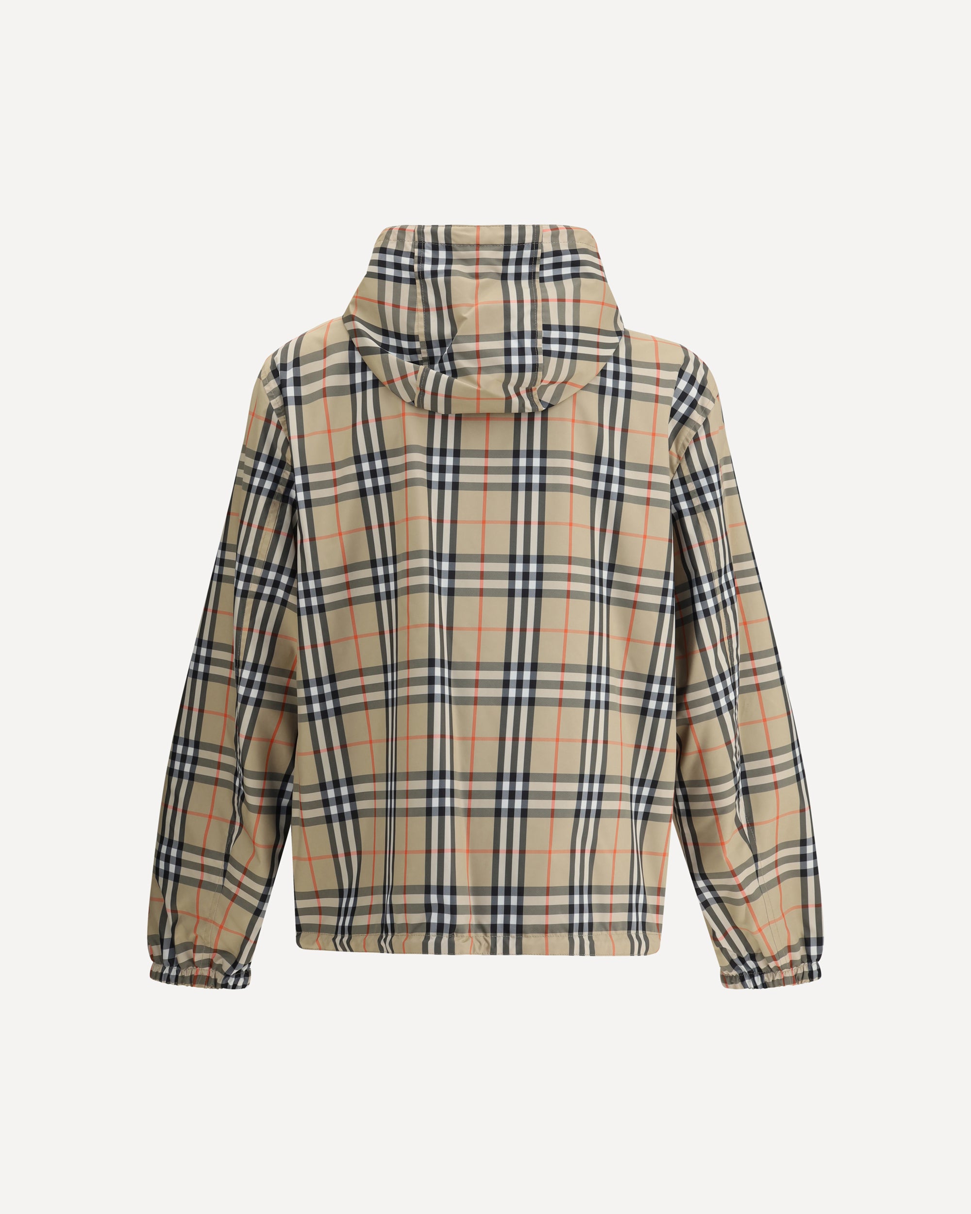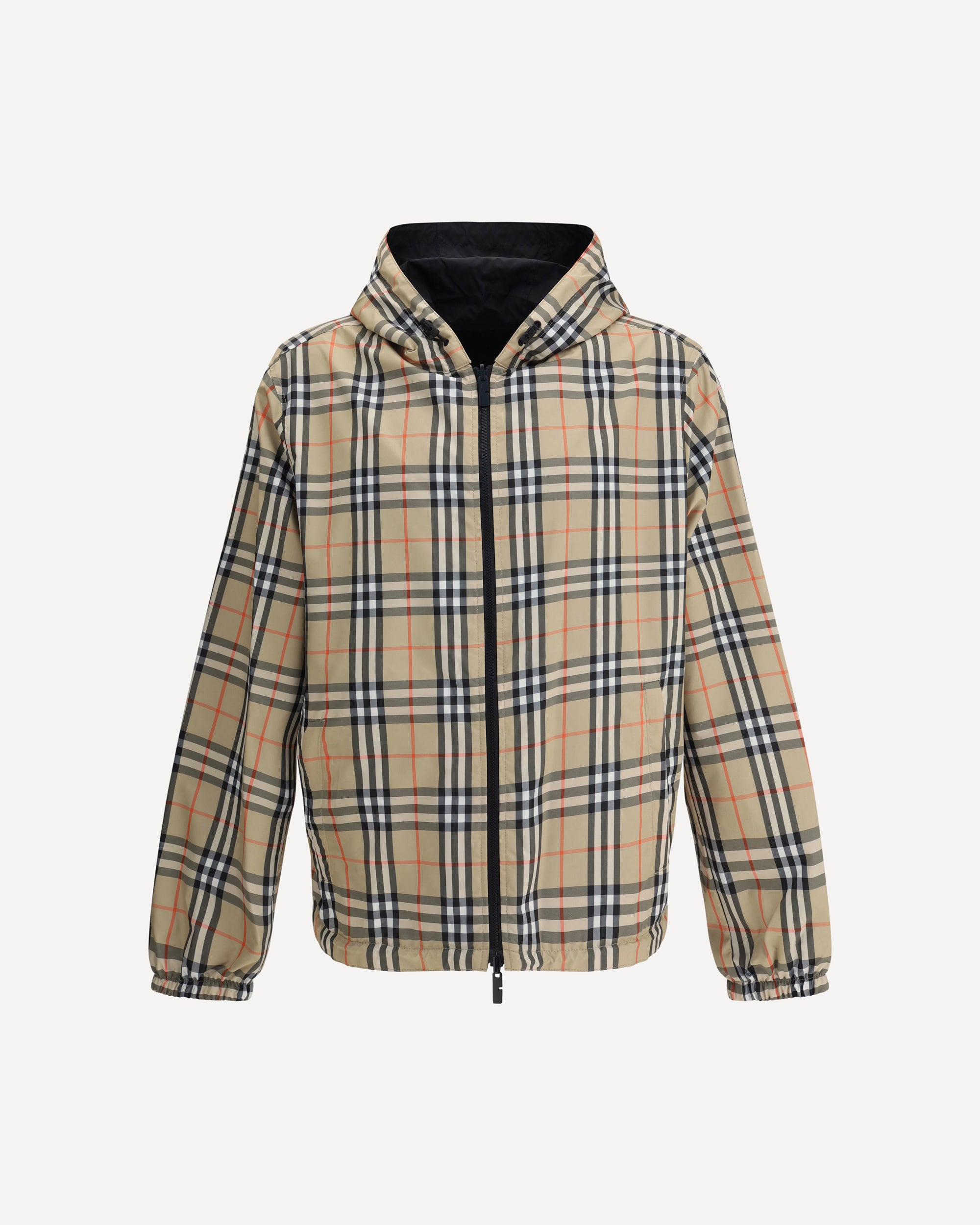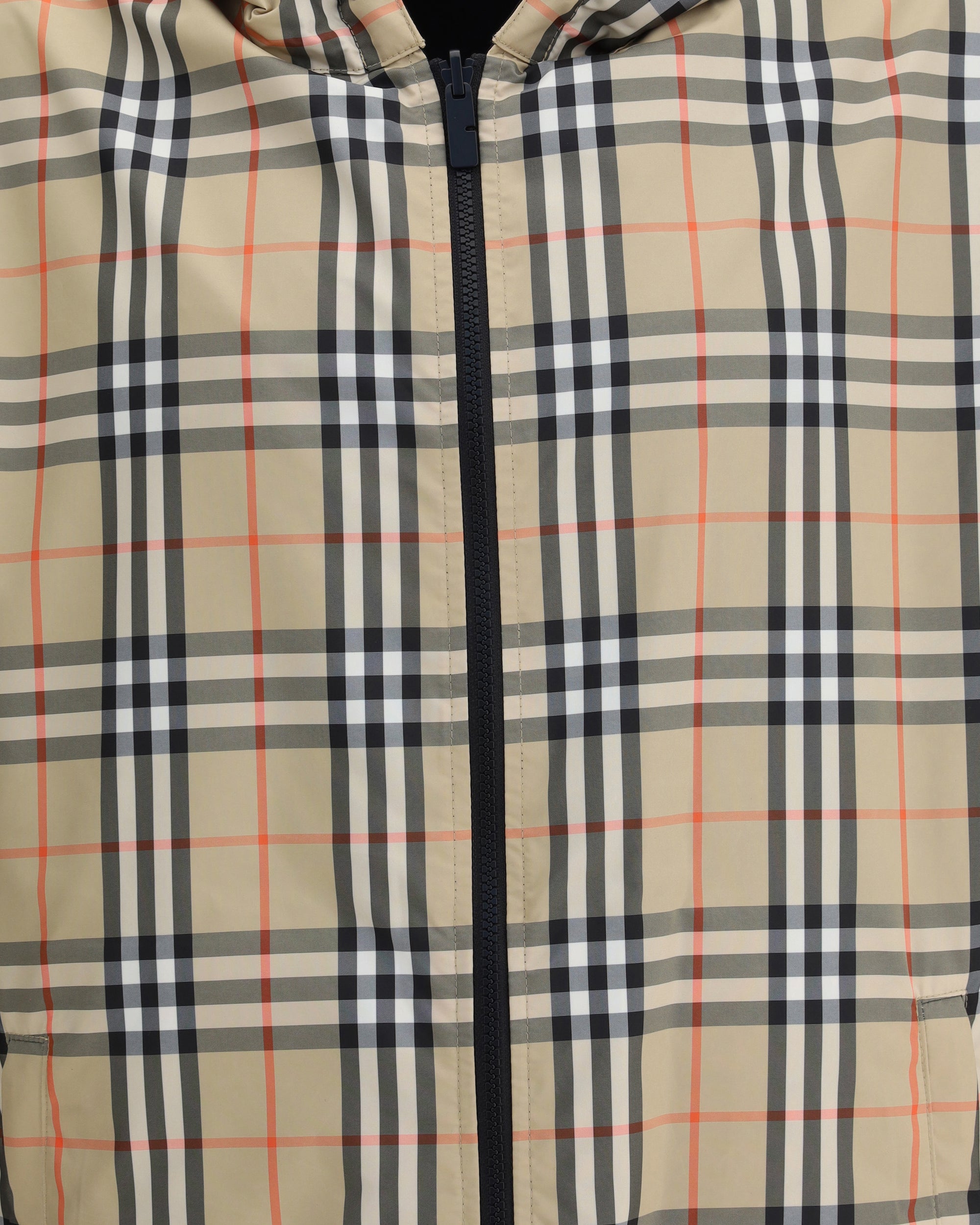 The Archive Check reversible Jacket by Burberry is a versatile and stylish garment that offers two looks in one. On one side, it sports the brand's iconic check pattern, while on the other it features a solid-color design with a silicone label on the chest, embossed with Burberry lettering. Complete with a hood, the design provides a comfortable and functional fit, with a double-slider zipper closure, drawstring-adjustable hem and hood, and zippered side pockets. Elasticized cuffs complete the design, making this jacket ideal for an urban and practical look.