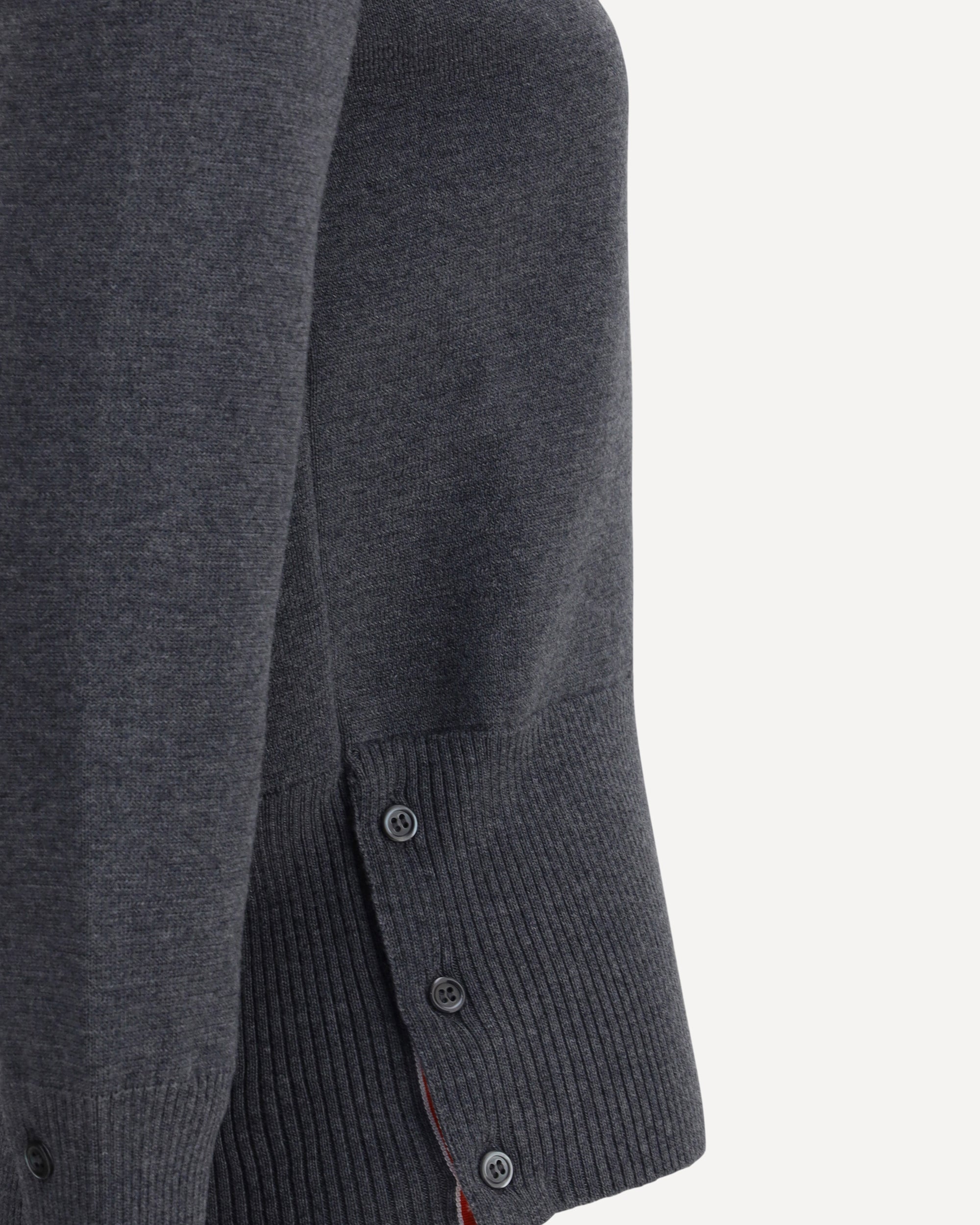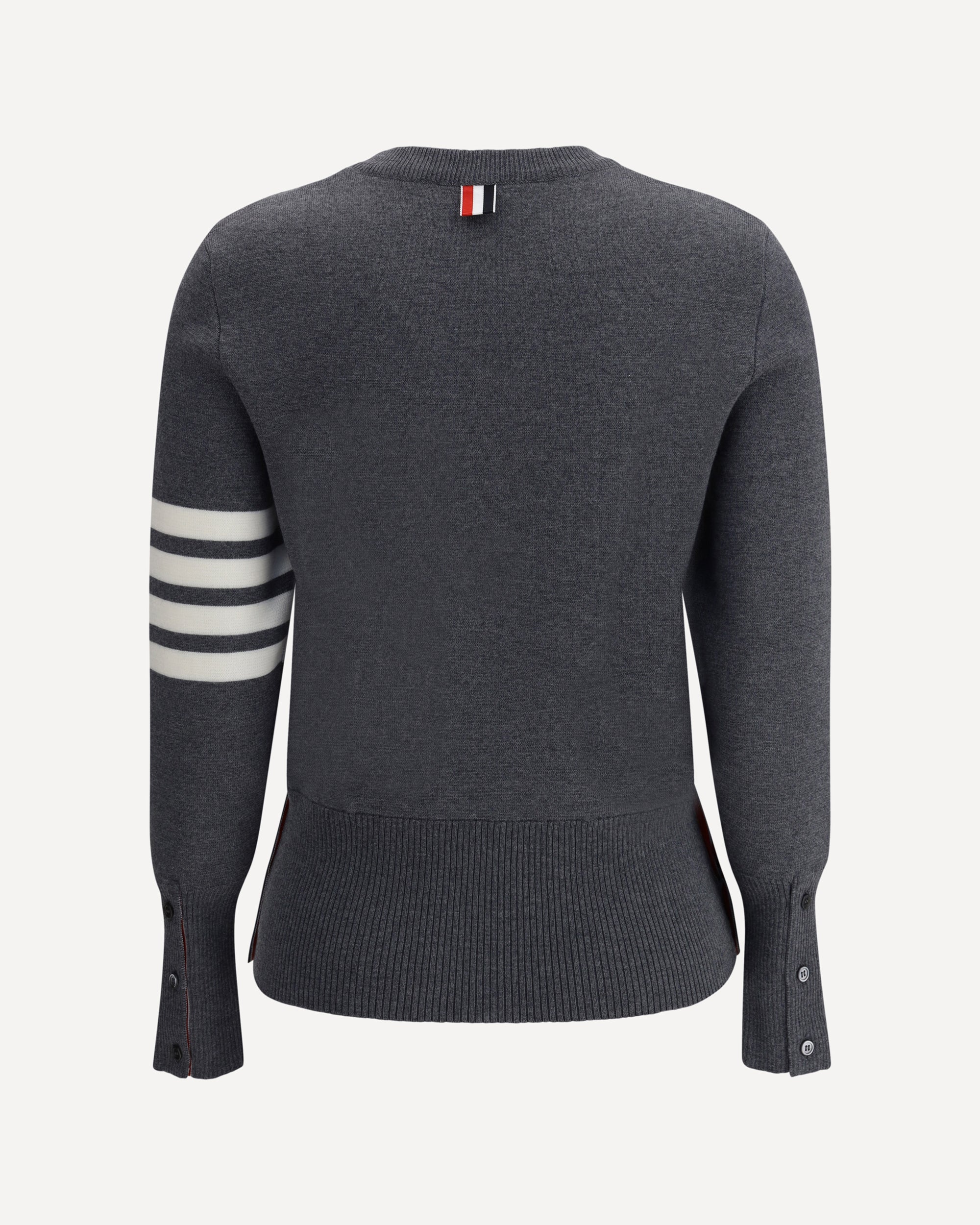 Thom Browne's virgin wool Sweater is an iconic piece with a clean yet richly tailored design. A classic crew neck combines with a ribbed high hem, featuring practical side buttons that allow you to adjust the slits with discretion and functionality. The cuffs, also ribbed and button-fastened, add a touch of structured elegance. Distinguishing the sweater are the brand's iconic horizontal bands, positioned on the left arm, which lend instant recognition and a graphic accent typical of the Thom Browne style.