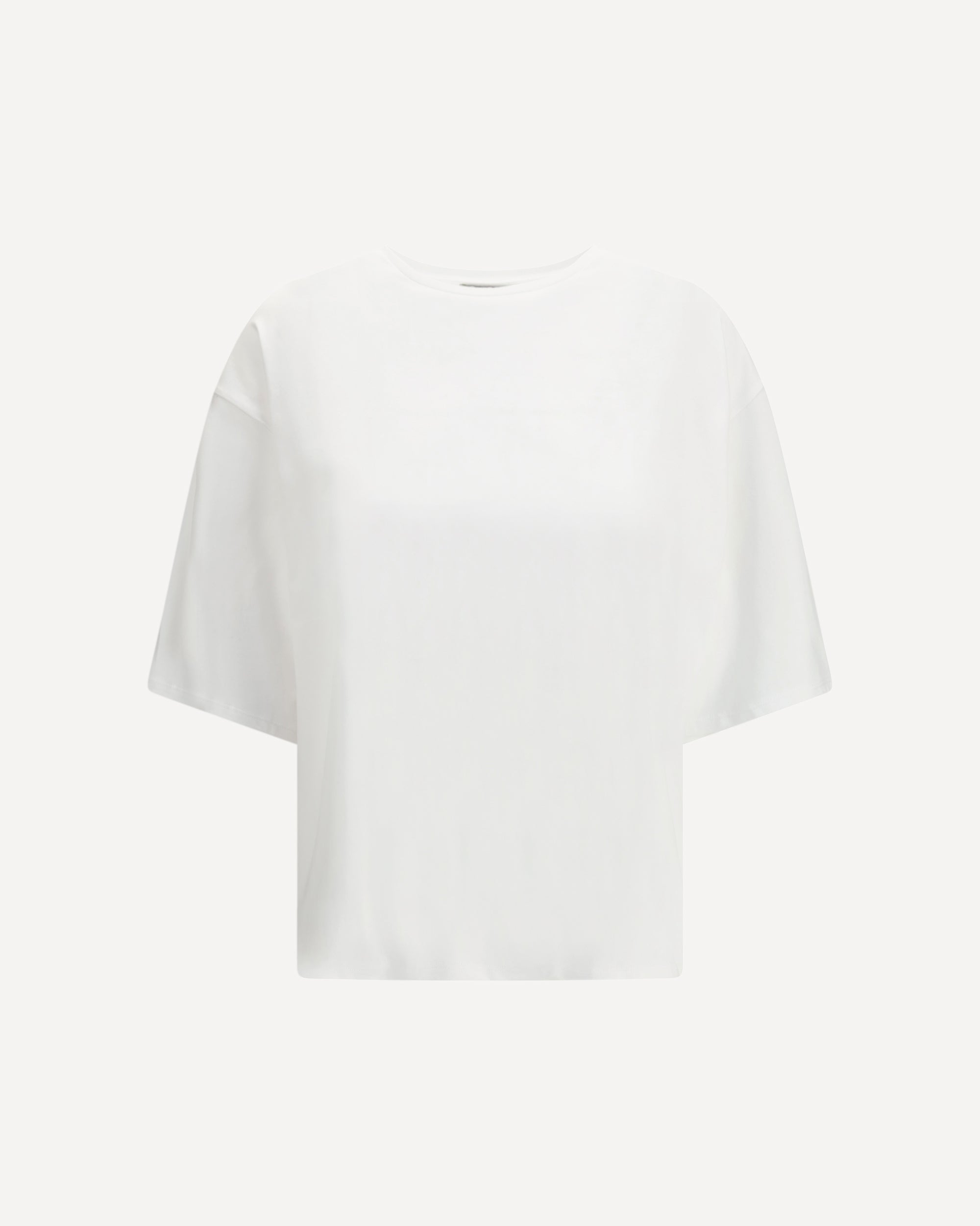 The Osis T-shirt by Loulou de Saison, clean and effortless, featuring a classic crew neckline and dropped shoulders that shape a relaxed silhouette. The short sleeves with slouched shoulders enhance its modern, easy-going appeal, making it a versatile everyday essential.