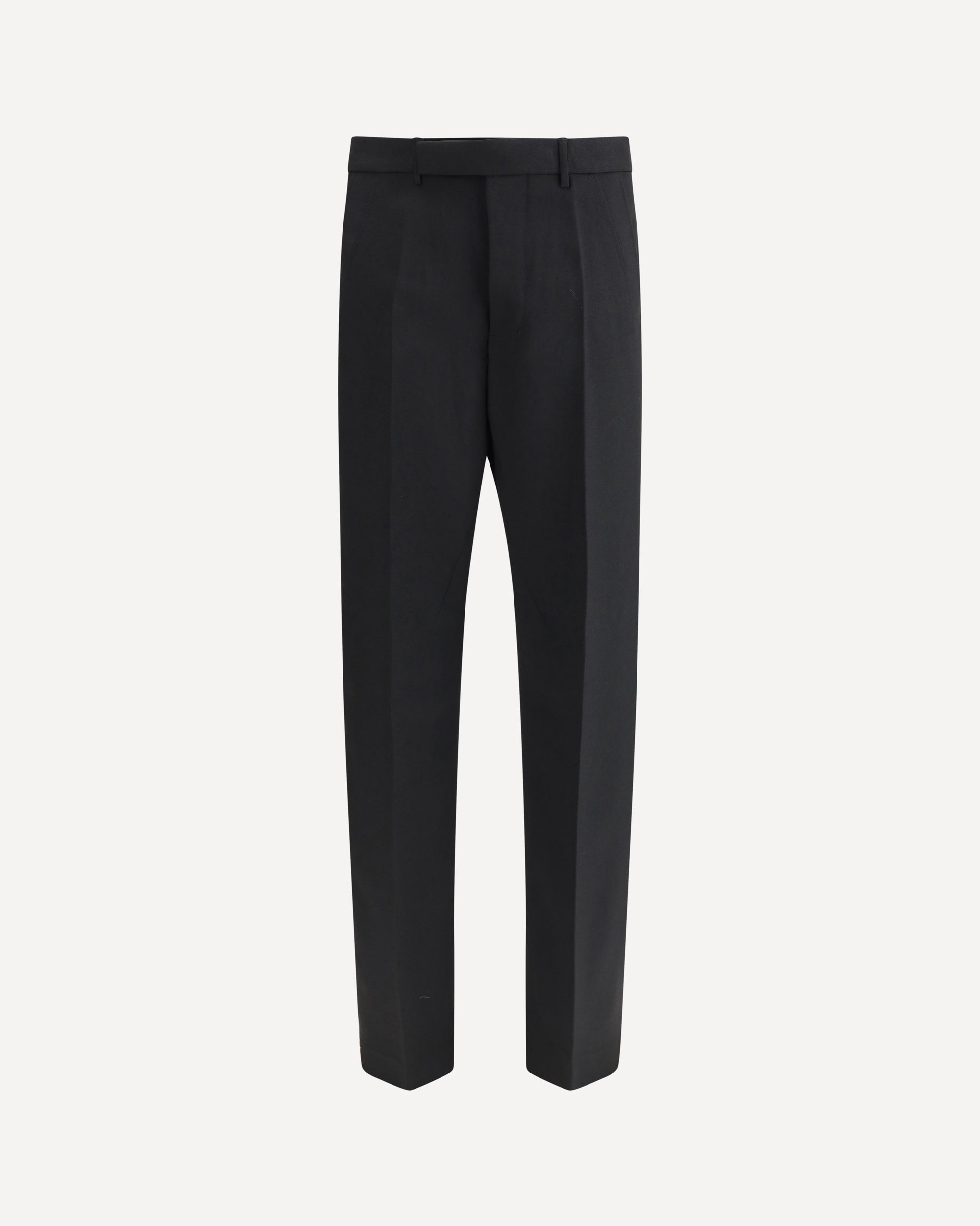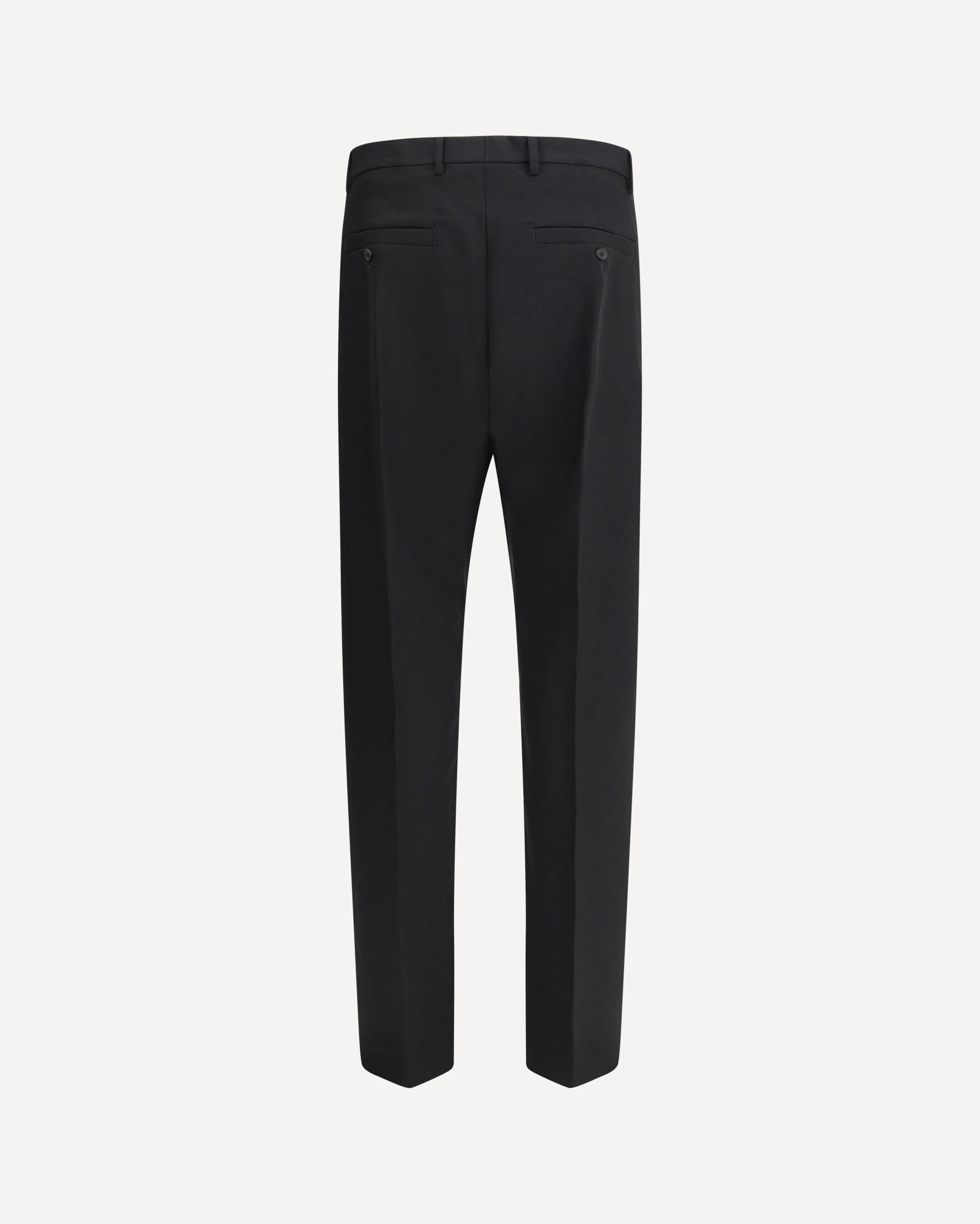 Rick Owens' Geth tailored Pants interpret the formal classic with the brand's bold aesthetic. Featuring a full length, mid-rise and loose fit, they feature a traditional tailored waistband with a concealed zipper closure and button wrap. Ironed pleats at the front and back of the leg enhance the structure, while back welt pockets with buttons complete the design with an elegant and functional touch. A garment that combines sartorial rigor and contemporary vision.