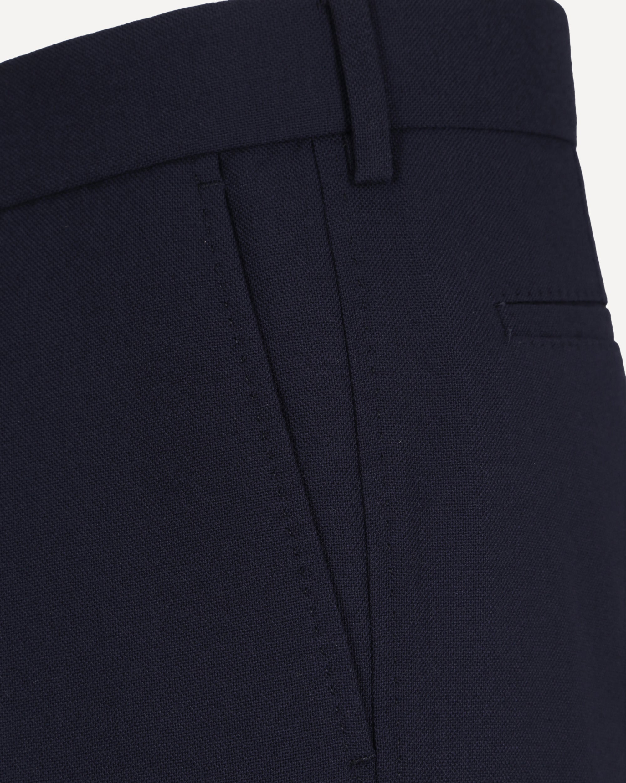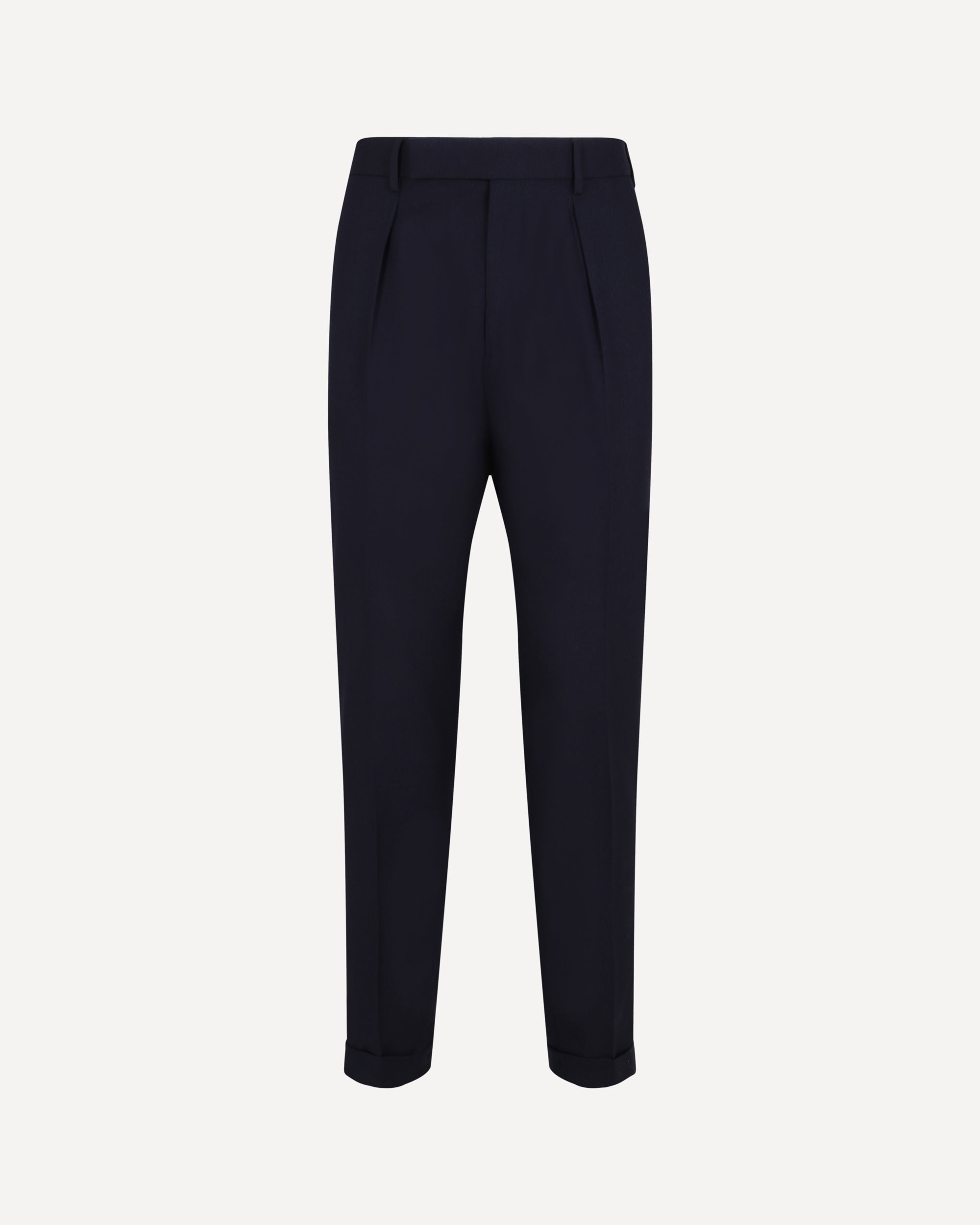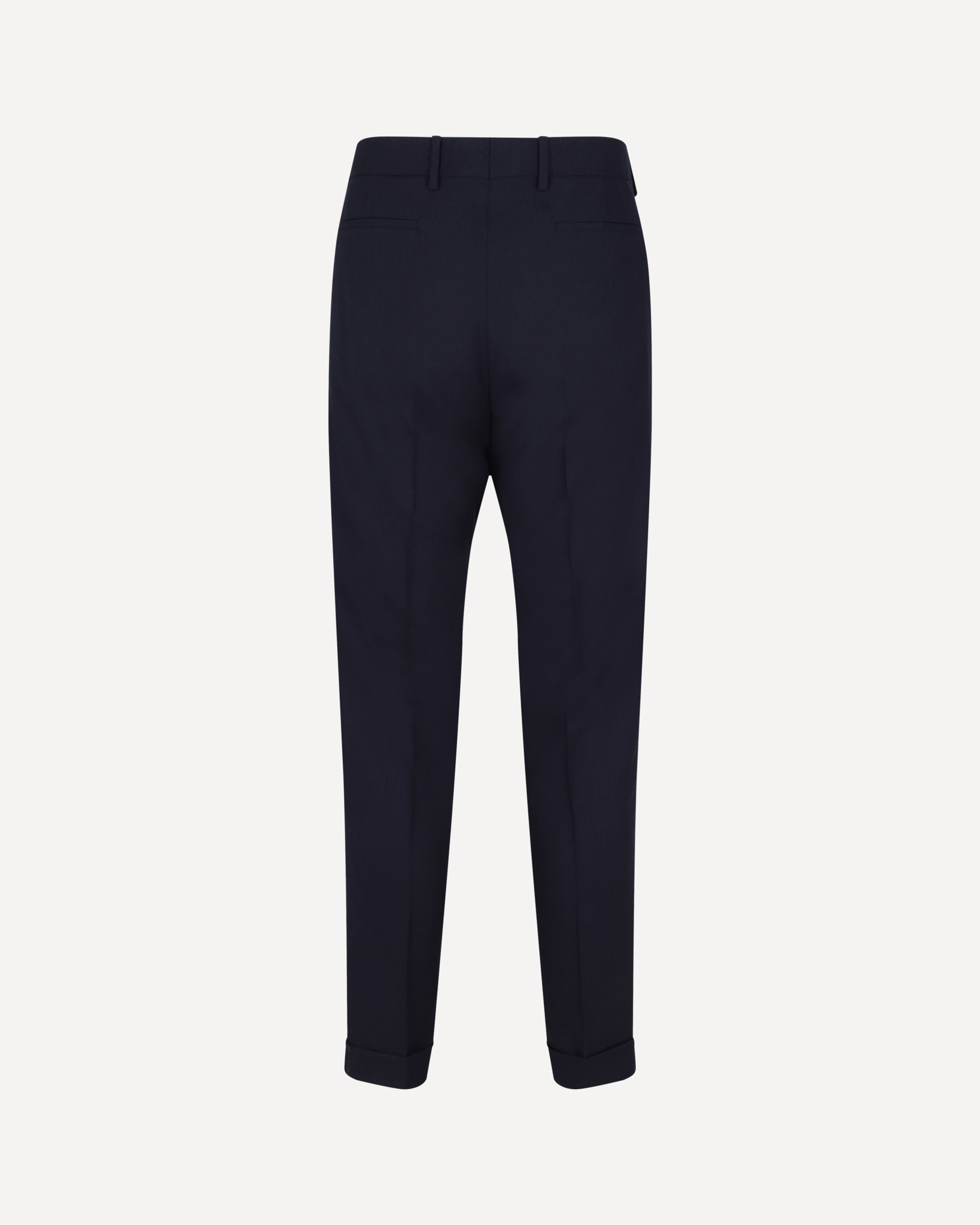 Wool Pants by Paul Smith, hook-and-eye front zipper closure, two side slash pockets, two welt pockets on back, waistband loops, monochrome pattern.