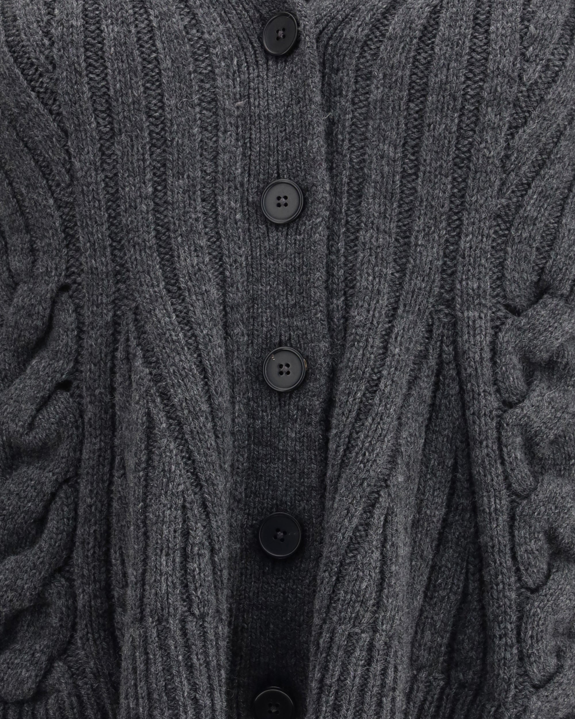 The Peplum Cable Cardigan by McQueen is crafted from a fine wool and cashmere blend, featuring a classic cable-knit design that enhances its rich texture. Designed with a slim fit at the waist that flares elegantly into a peplum hem, it includes a crew neckline, long sleeves with cuffs, and button fastening. A piece that merges timeless craftsmanship with modern sophistication.