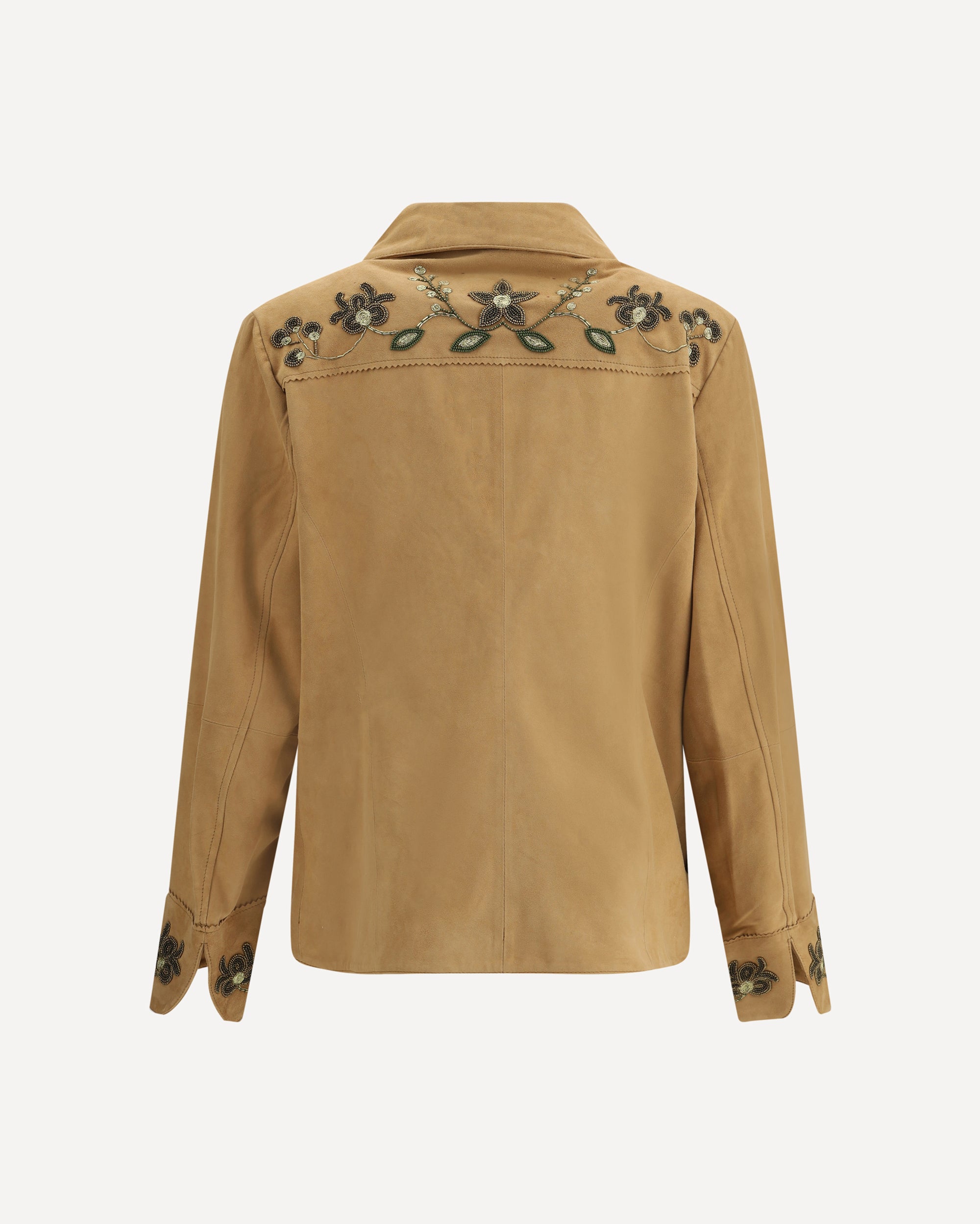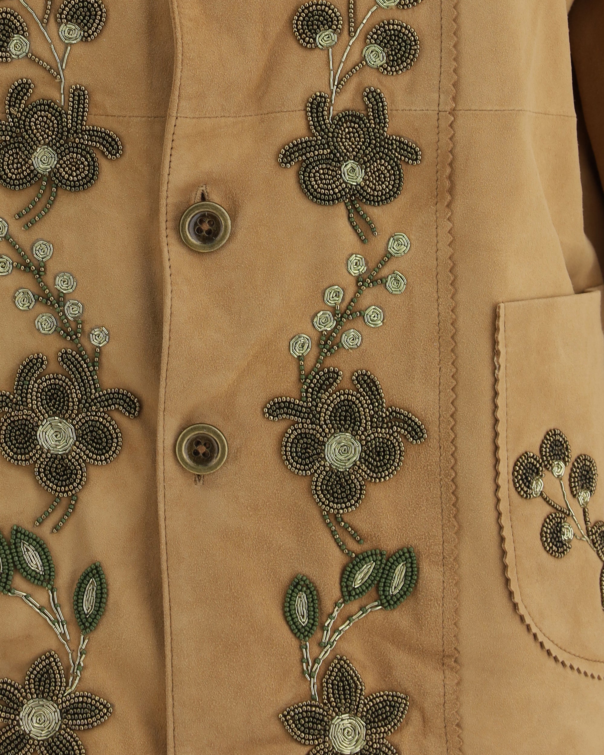 Baziszt's Jeep suede Jacket is a garment that blends elegance and handcrafted details with a touch of femininity. Featuring a classic collar and front button closure, it has two patch pockets on the front that add practicality to the design. Expertly embroidered beaded floral embellishments embellish the jacket, creating a sophisticated contrast between the soft texture of the suede and the delicate details. A unique piece that combines rustic charm with contemporary elegance.