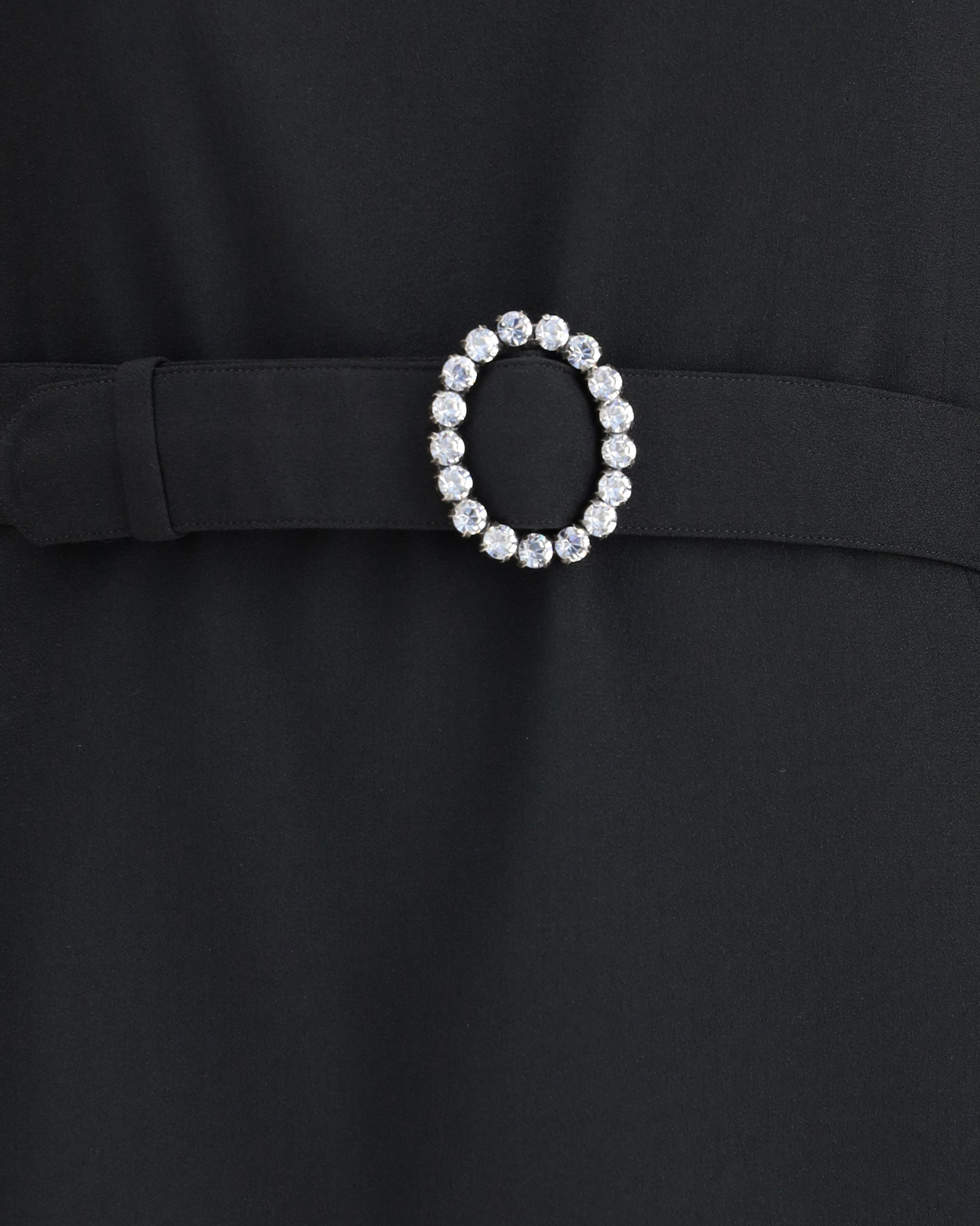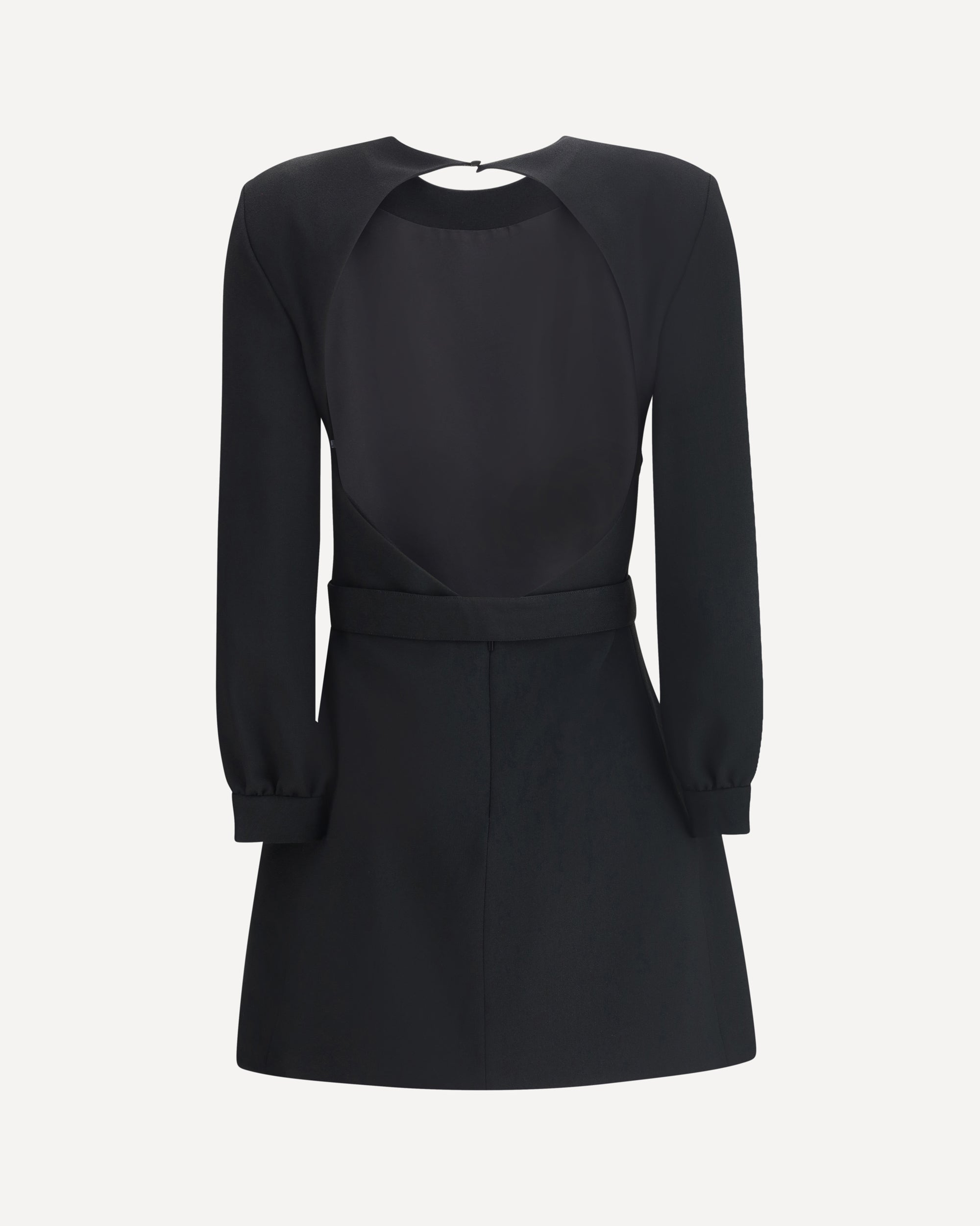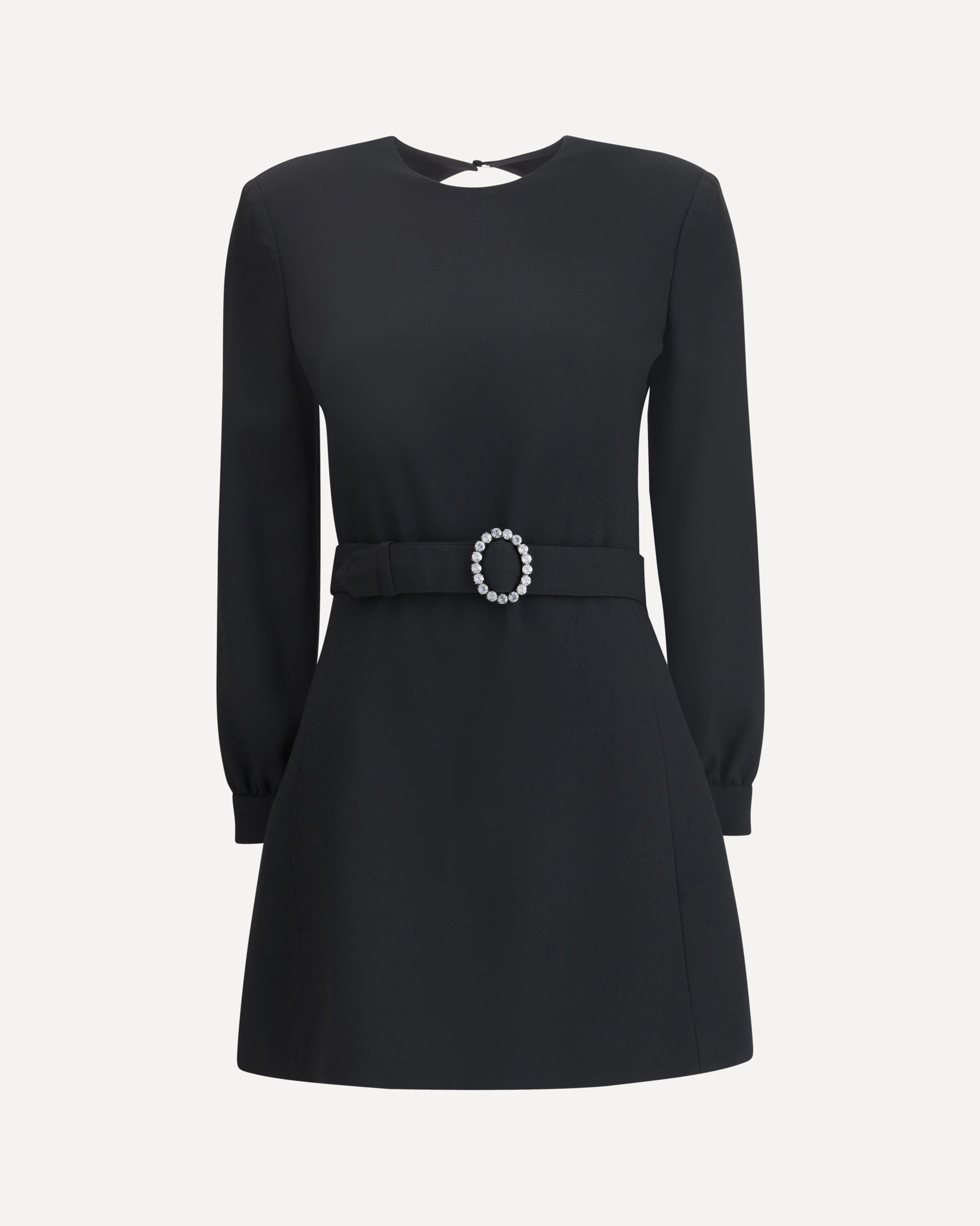 Saint Laurent's mini Dress is an elegant and structured design perfect for special occasions. Made with long sleeves and a round neckline, it features a refined button closure at the back of the neck, as well as a hidden hook-and-eye zipper at the back of the skirt.The silhouette is enhanced by padded shoulders and a diamond-cut nude back for a sensual and sophisticated effect. Completing the look is an adjustable, removable belt embellished with a crystal-encrusted oval buckle, which adds a bright and iconic touch.