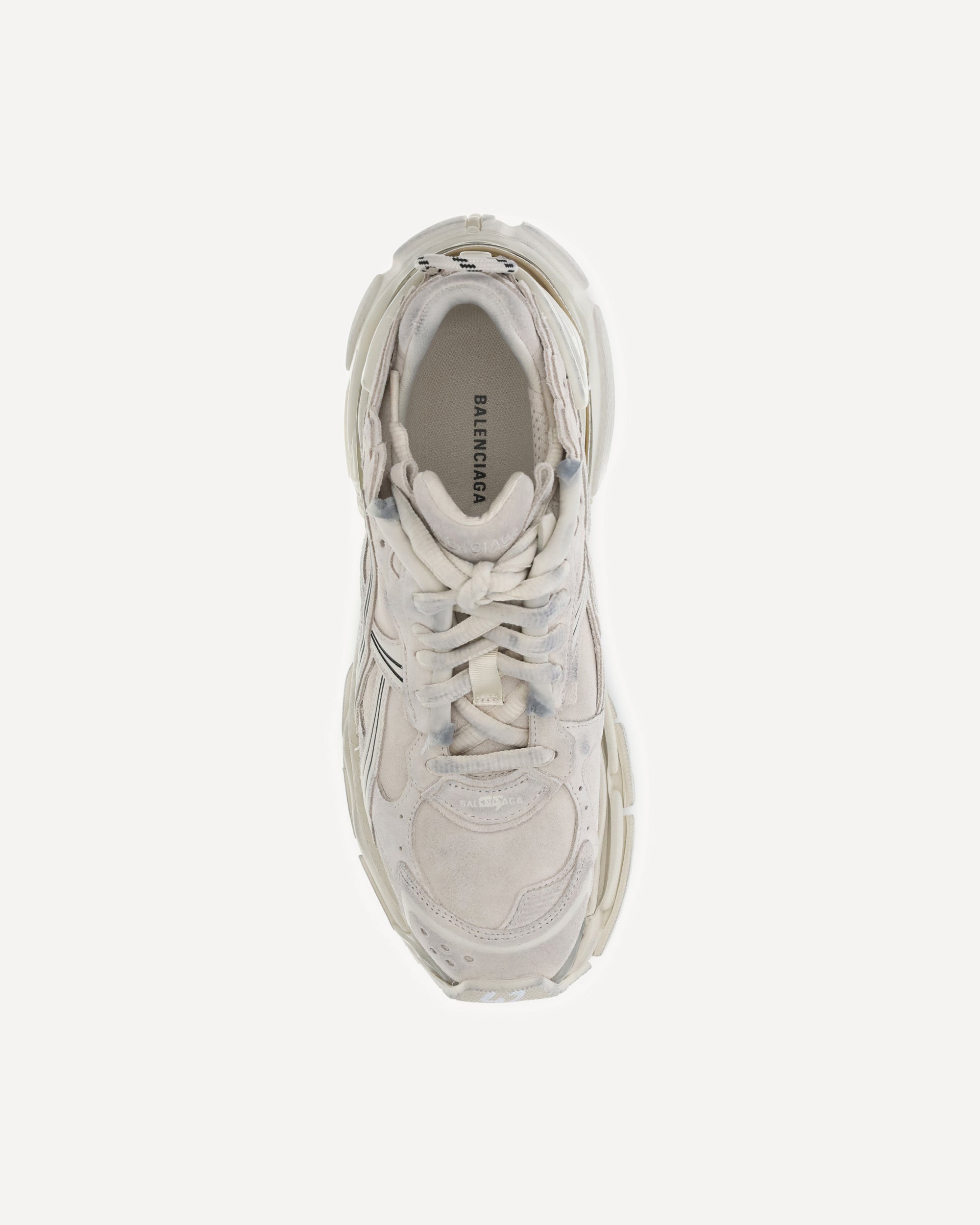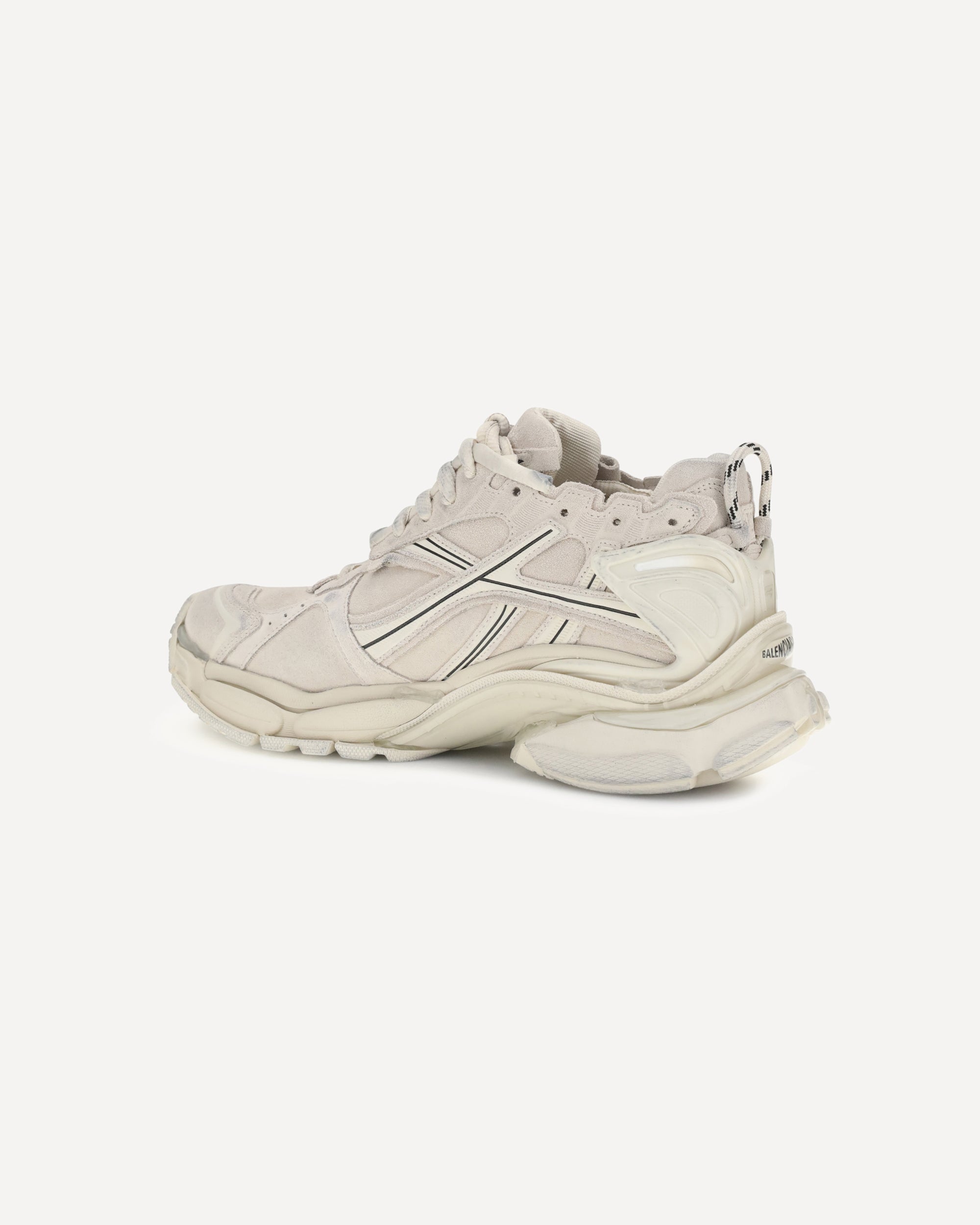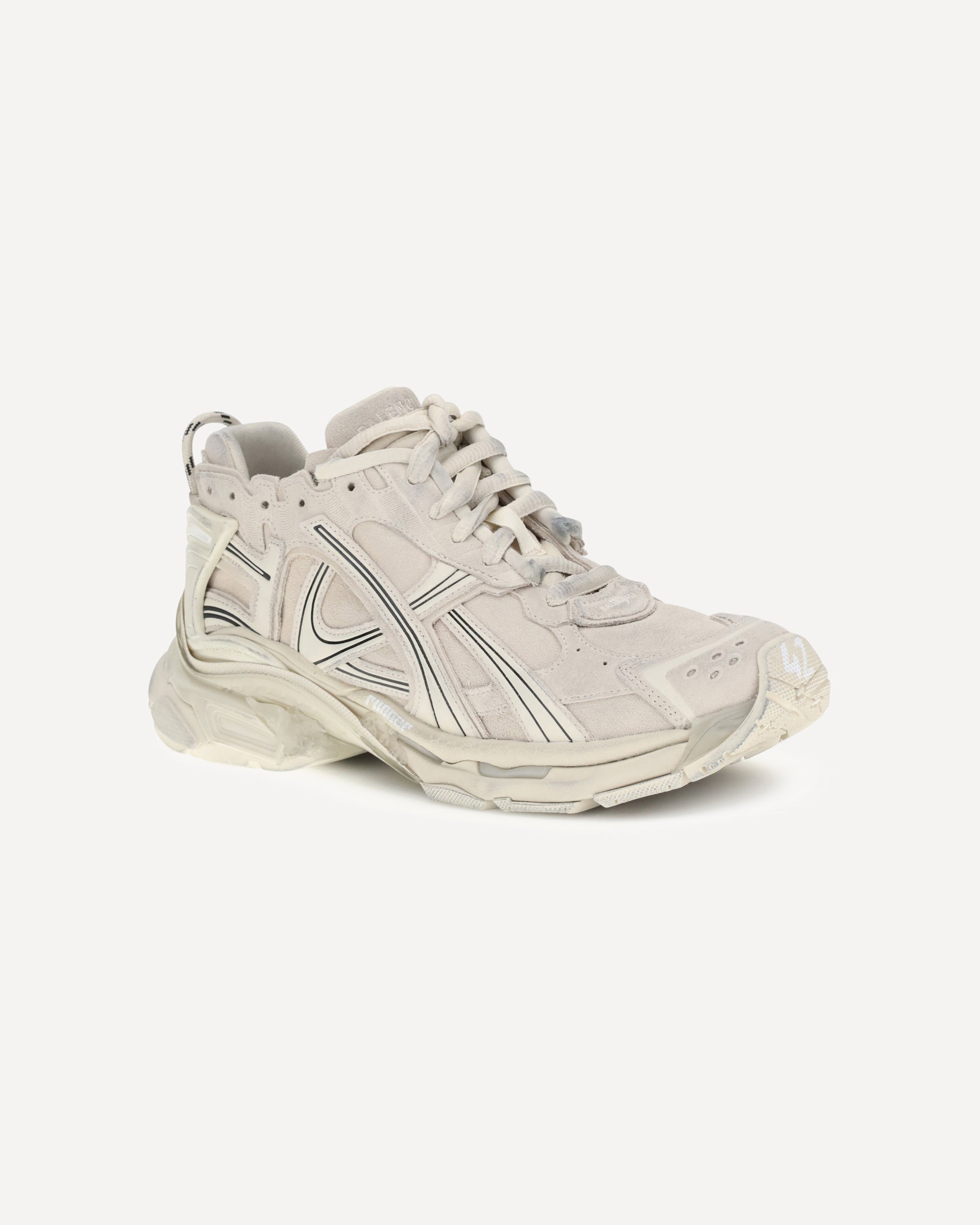 Runner Sneakers by Balenciaga combine technical materials and cowhide leather in a bold design with a worn-in effect. Featuring intricate construction and contrasting details, they feature size printed on the toe and embossed on the heel, as well as three different Balenciaga logos: printed, embroidered and embossed. The loop on the back completes a sporty, assertive style designed for those who like to stand out.