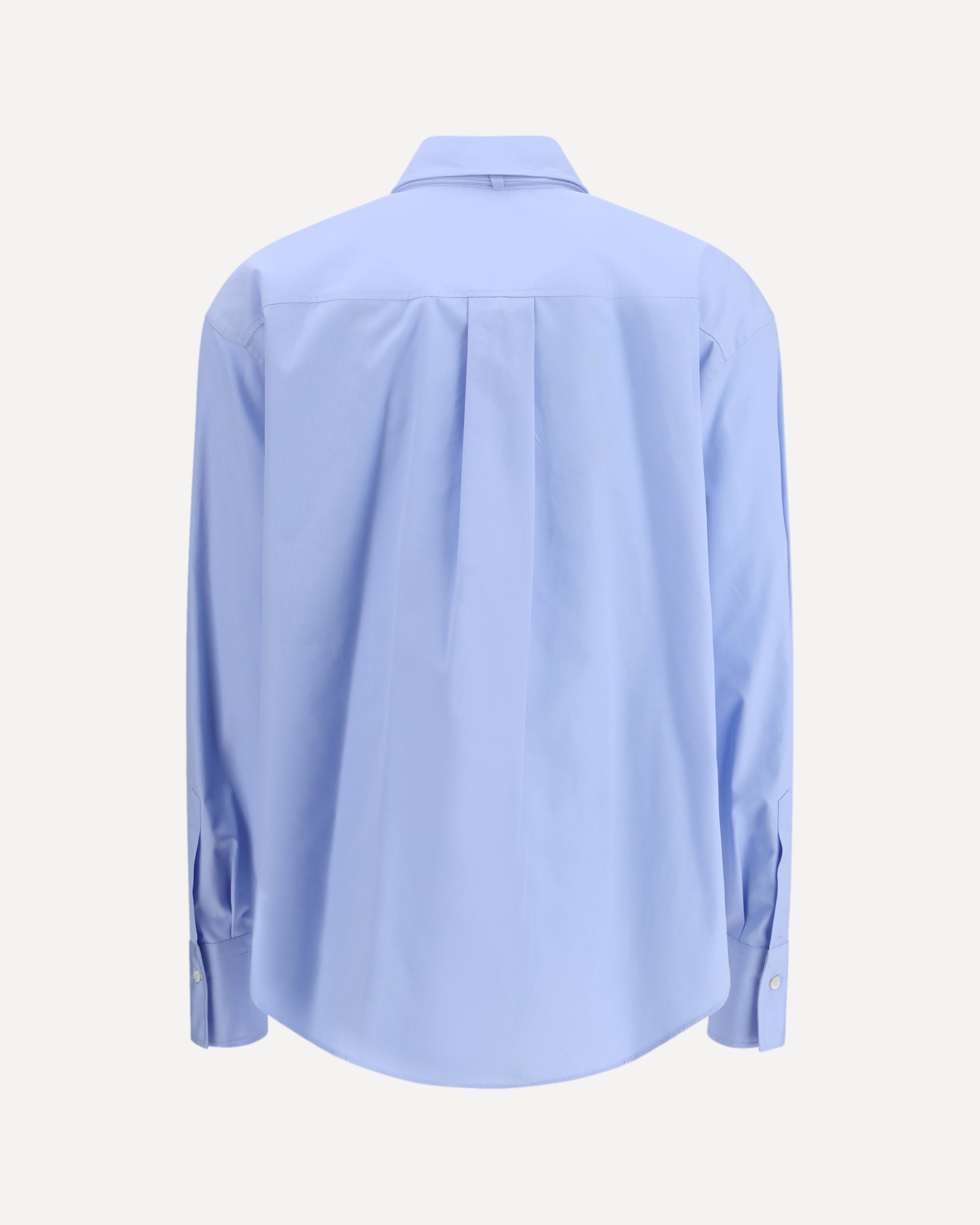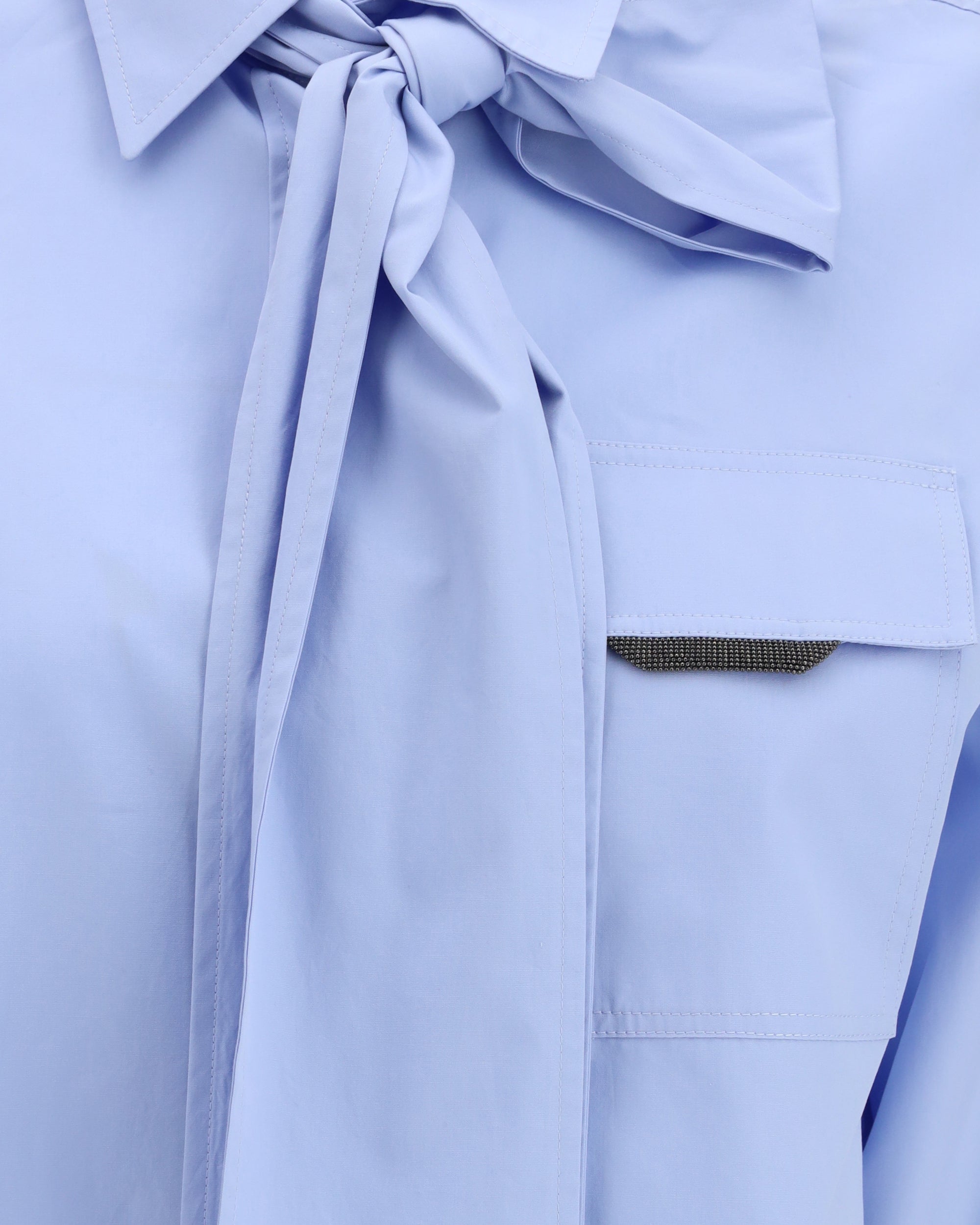 The Shirt by Brunello Cucinelli enhances pure cotton poplin with a refined jewel detail on the chest, adding a subtle yet distinctive touch. The Italian collar, paired with a removable tie-style ribbon, offers elegant versatility, while the button fastening preserves a clean and balanced design. The chest pocket, angular cuffs and rounded hem integrate seamlessly into the silhouette, complemented by the back yoke and back placket that shape the garment with tailored precision.