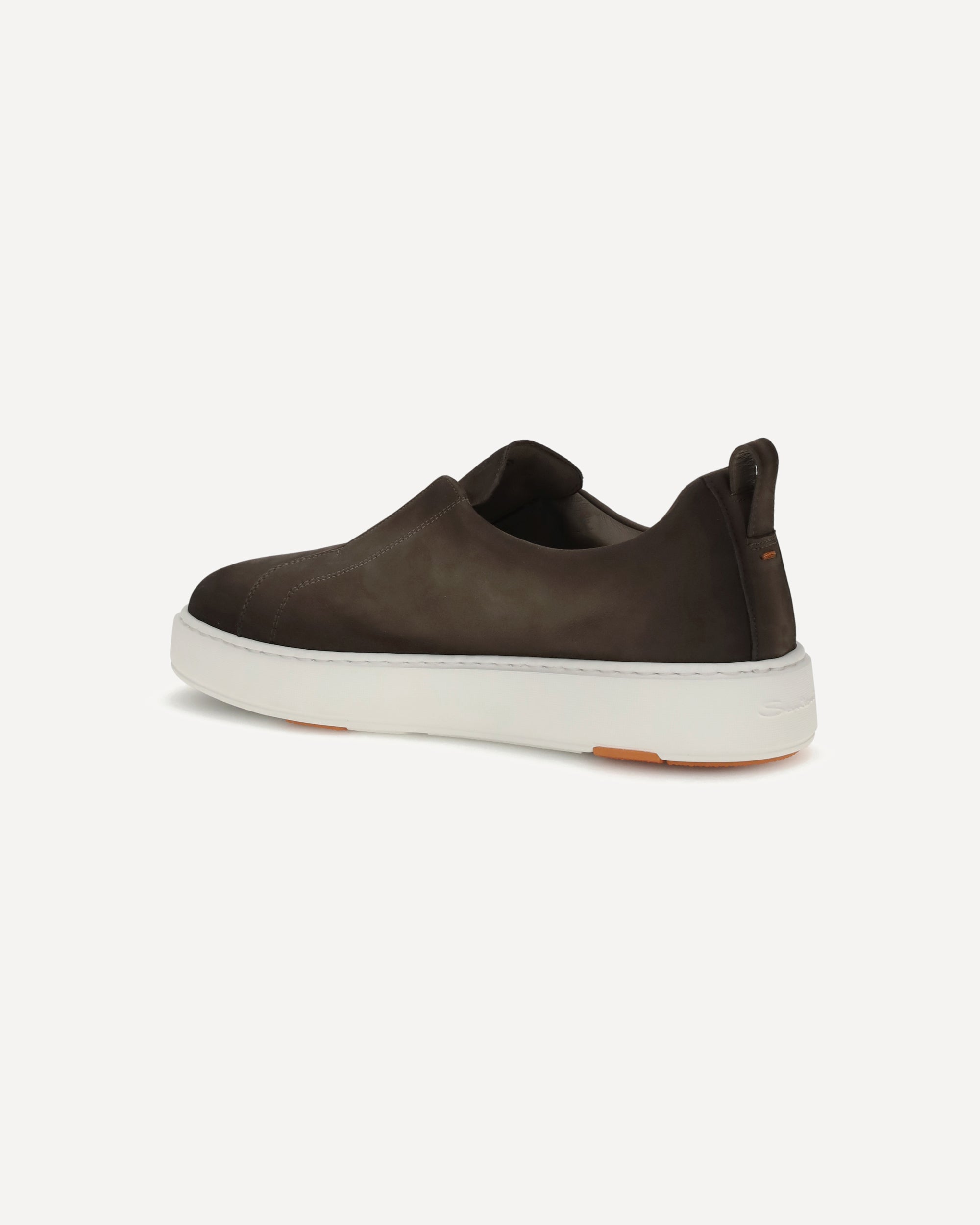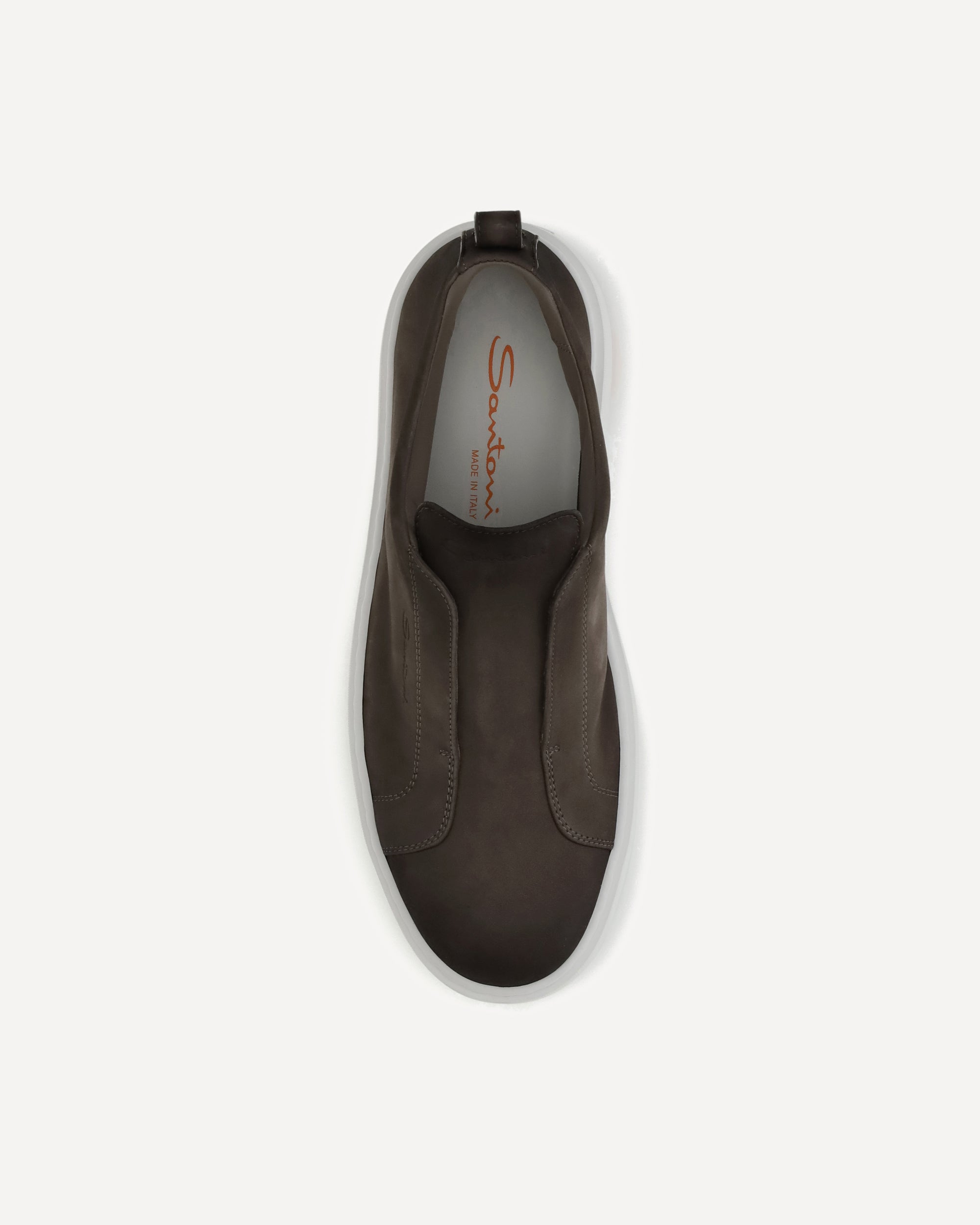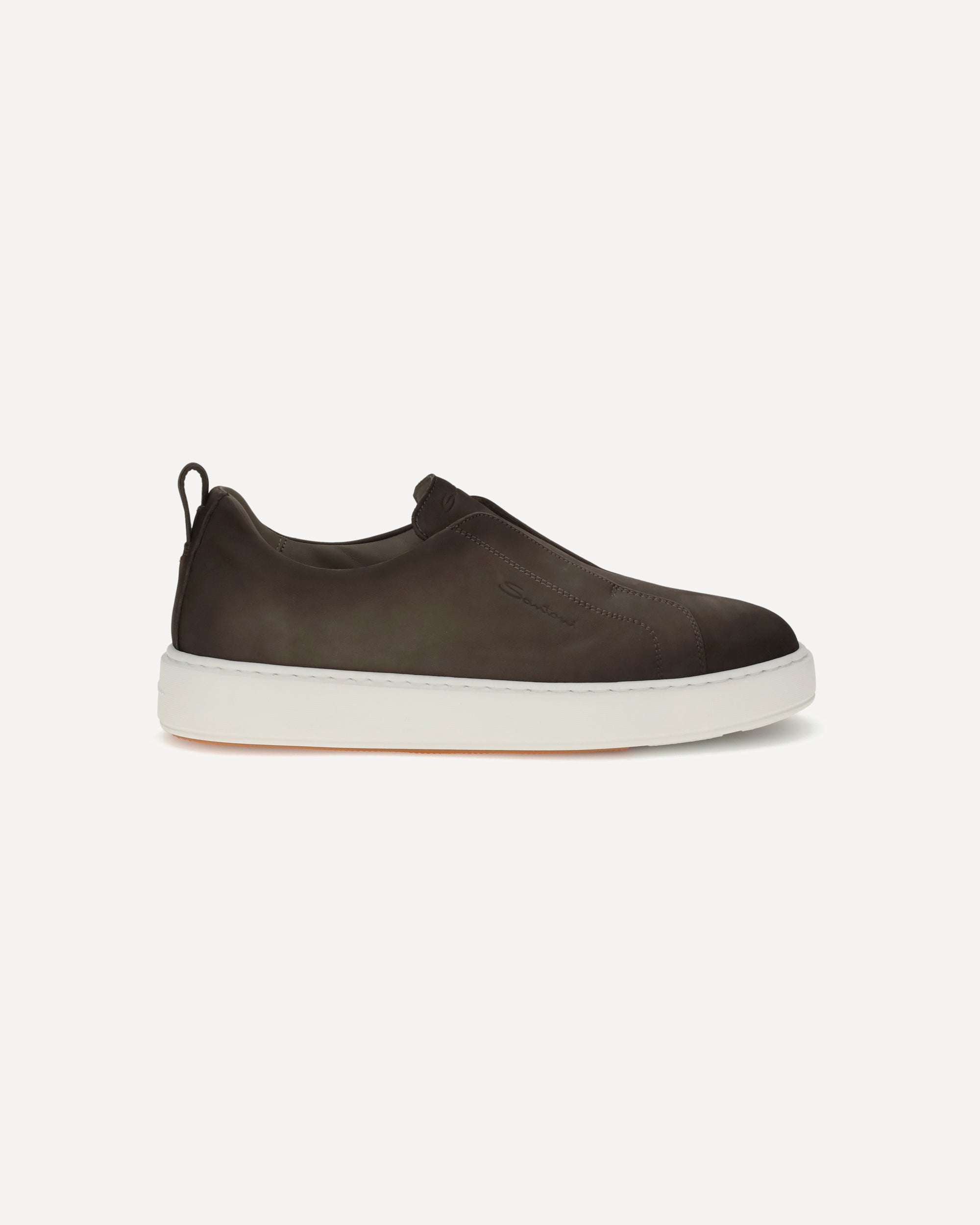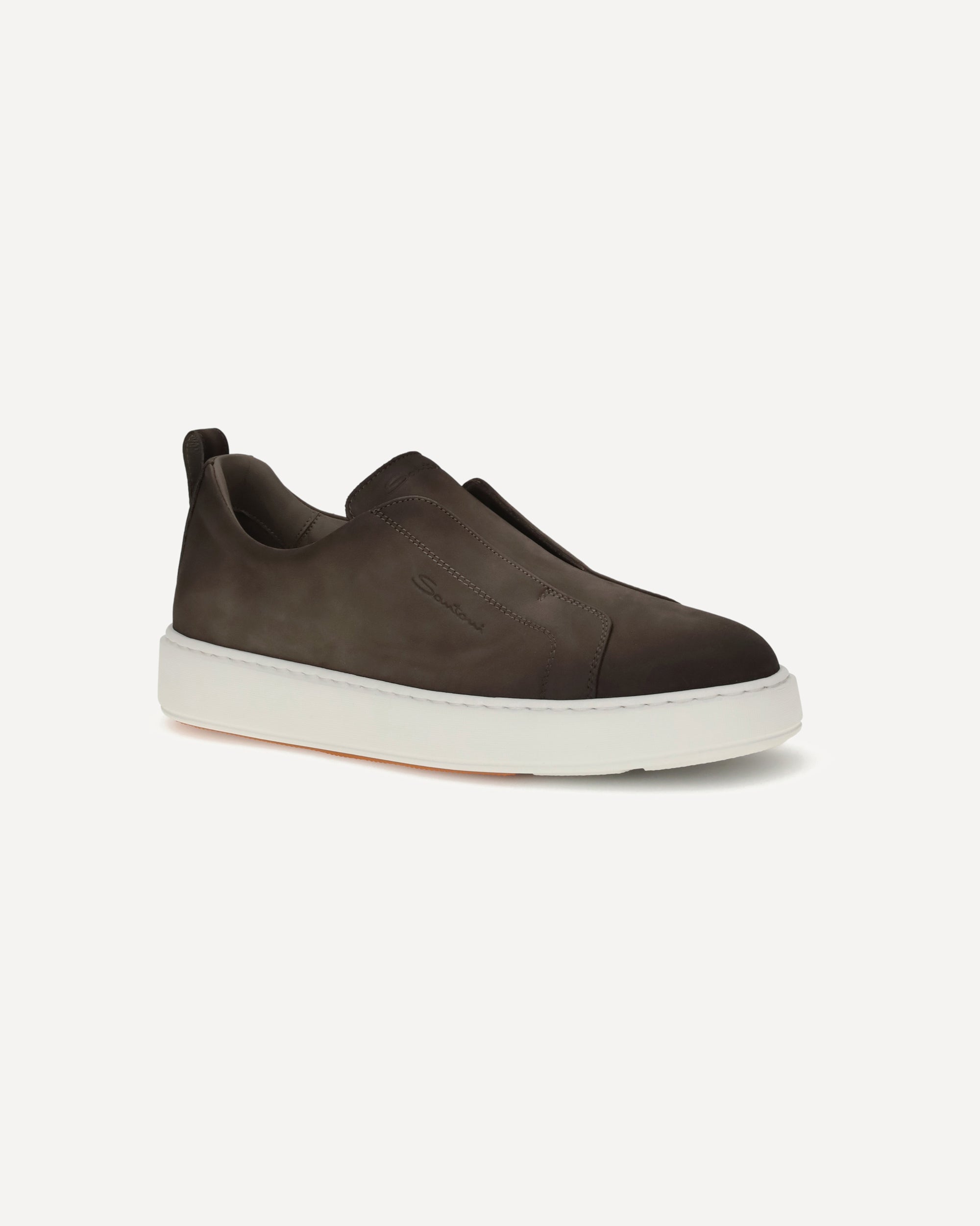 The Slip-on Sneakers by Santoni combine practicality and style in a sleek, essential design. Featuring a rounded toe and a loop at the heel for a quick and easy fit, they are fully unlined to ensure lightness. The rubber crate sole ensures durability and comfort, while the tread with Santoni's Orange double buckle decoration lends a distinctive touch of character to this versatile and contemporary model.