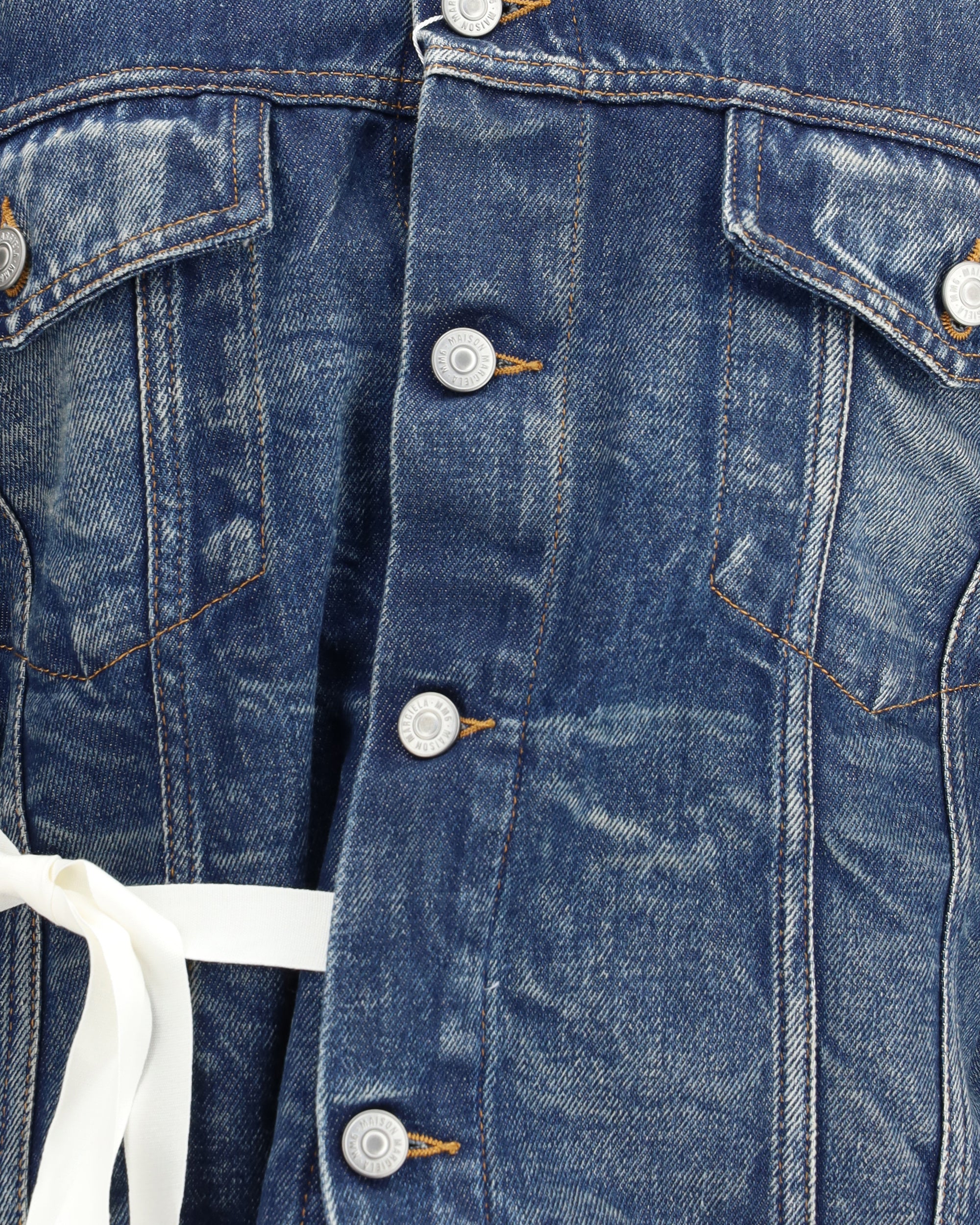 MM6 Maison Margiela's denim Jacket reinterprets a classic with a contemporary twist. Featuring a classic collar and a front button closure, it has two flap patch pockets on the front. The raw-cut hem and knotted ribbon appliqué on the side add a distinctive unstructured touch typical of the brand's aesthetic language.