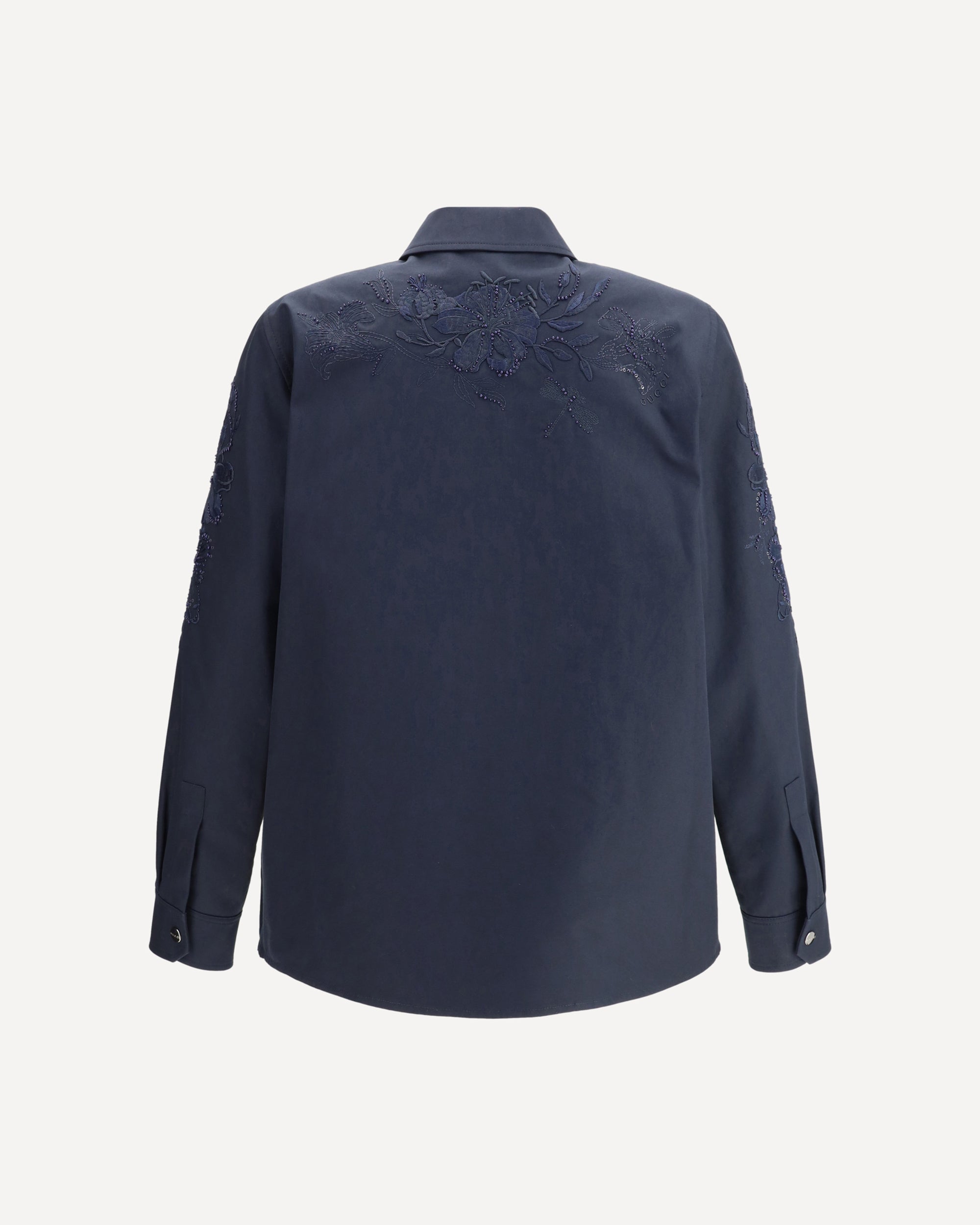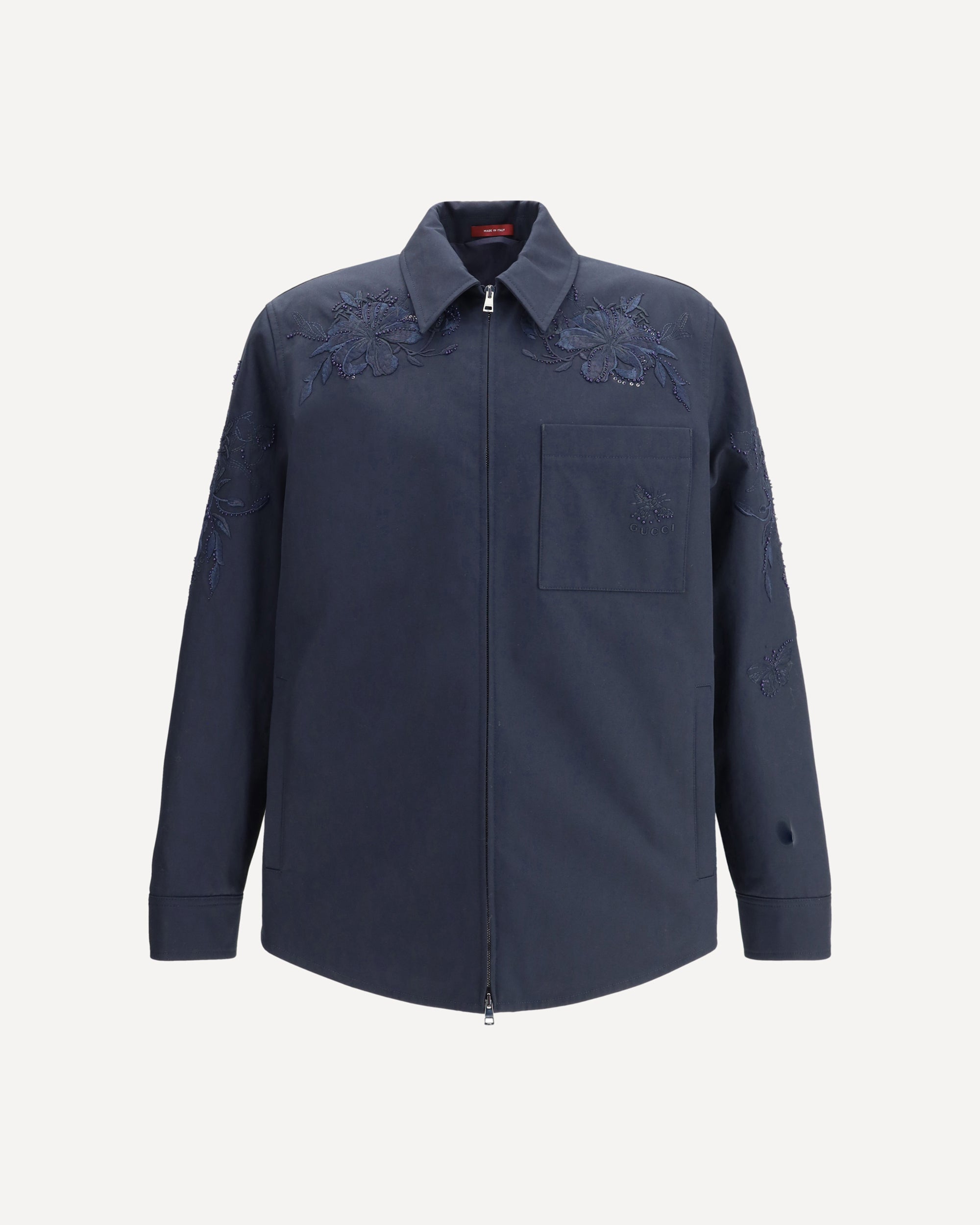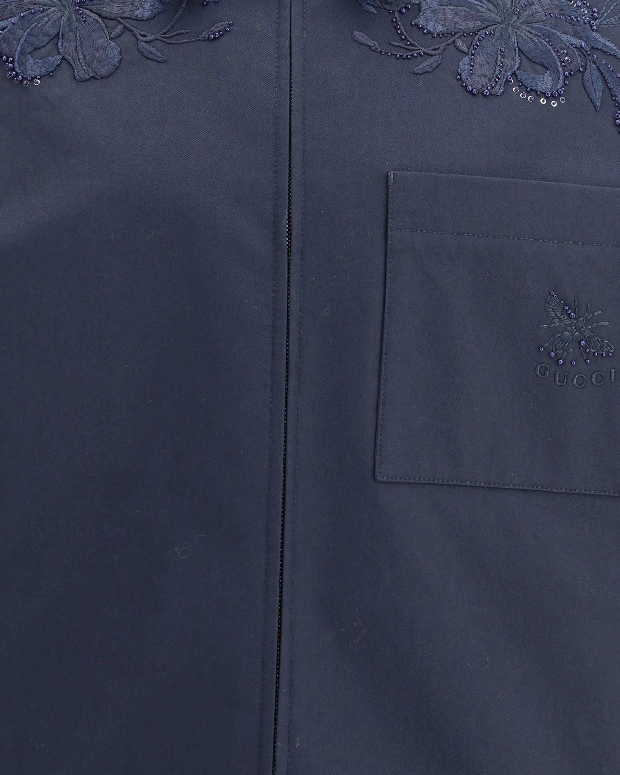 Gucci's cotton Jacket with embroidery is made of black cotton twill, featuring a Web detail on the back and an embossed Gucci logo to highlight its identity. It features a pointed collar, functional front pockets and long sleeves, while the front zipper closure ensures practicality. A half lining completes the garment to ensure comfort and lightness.
