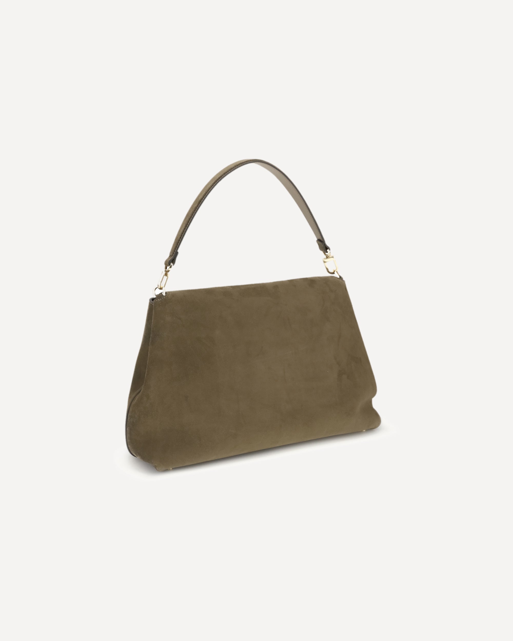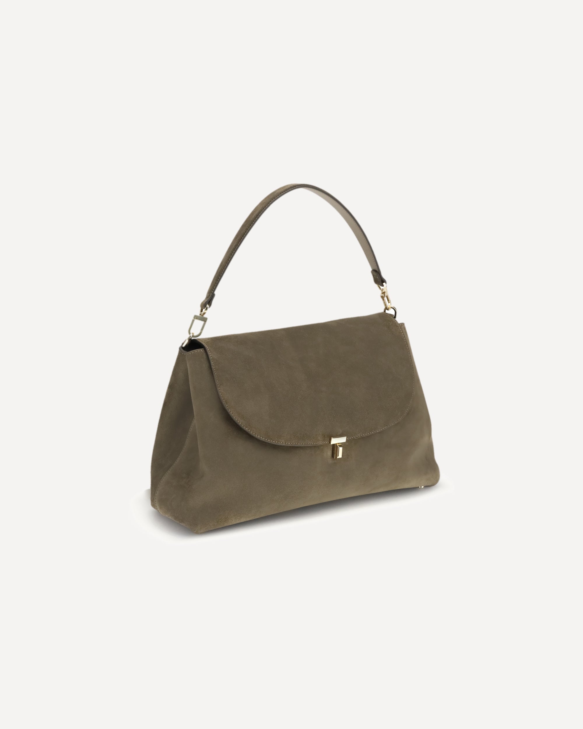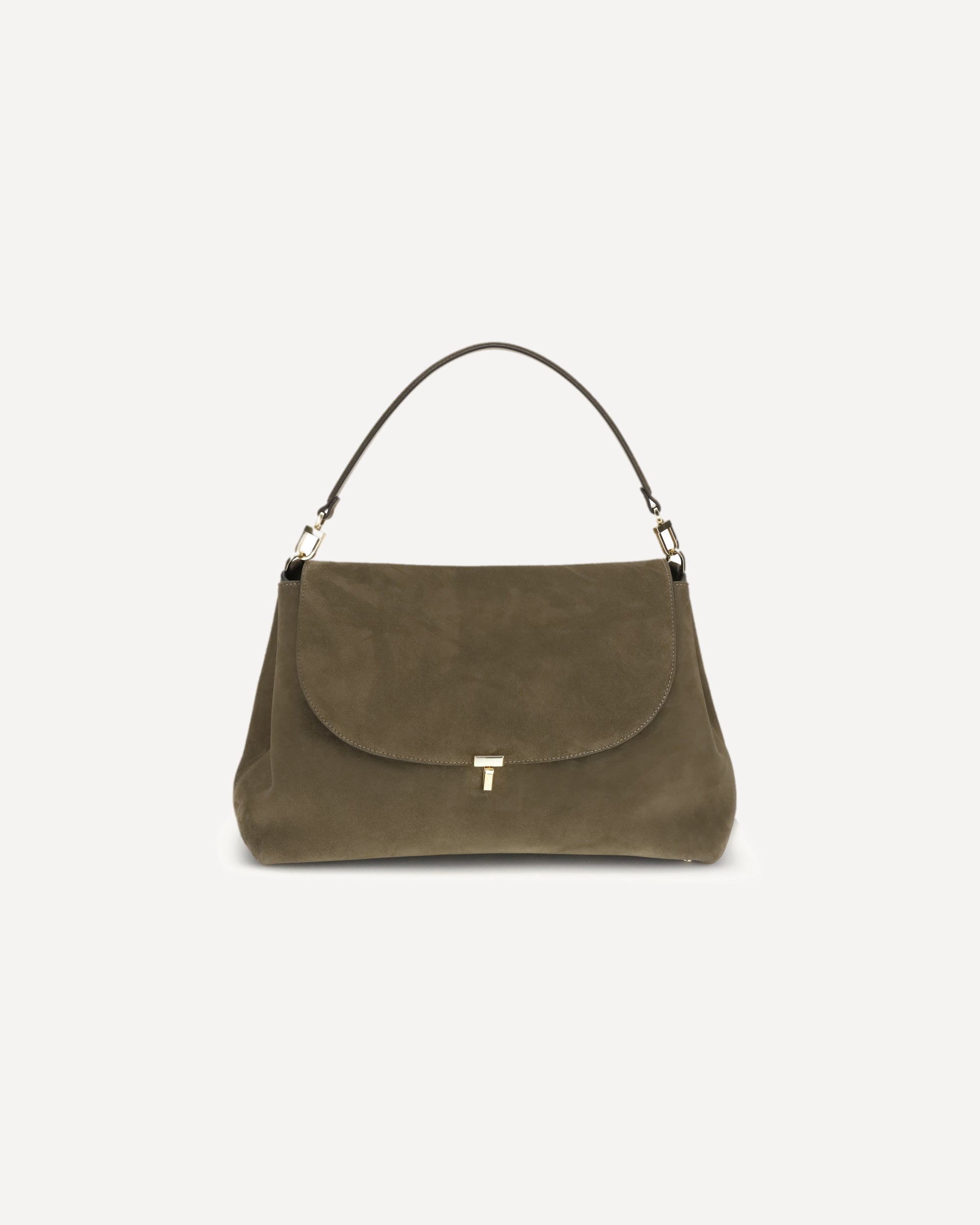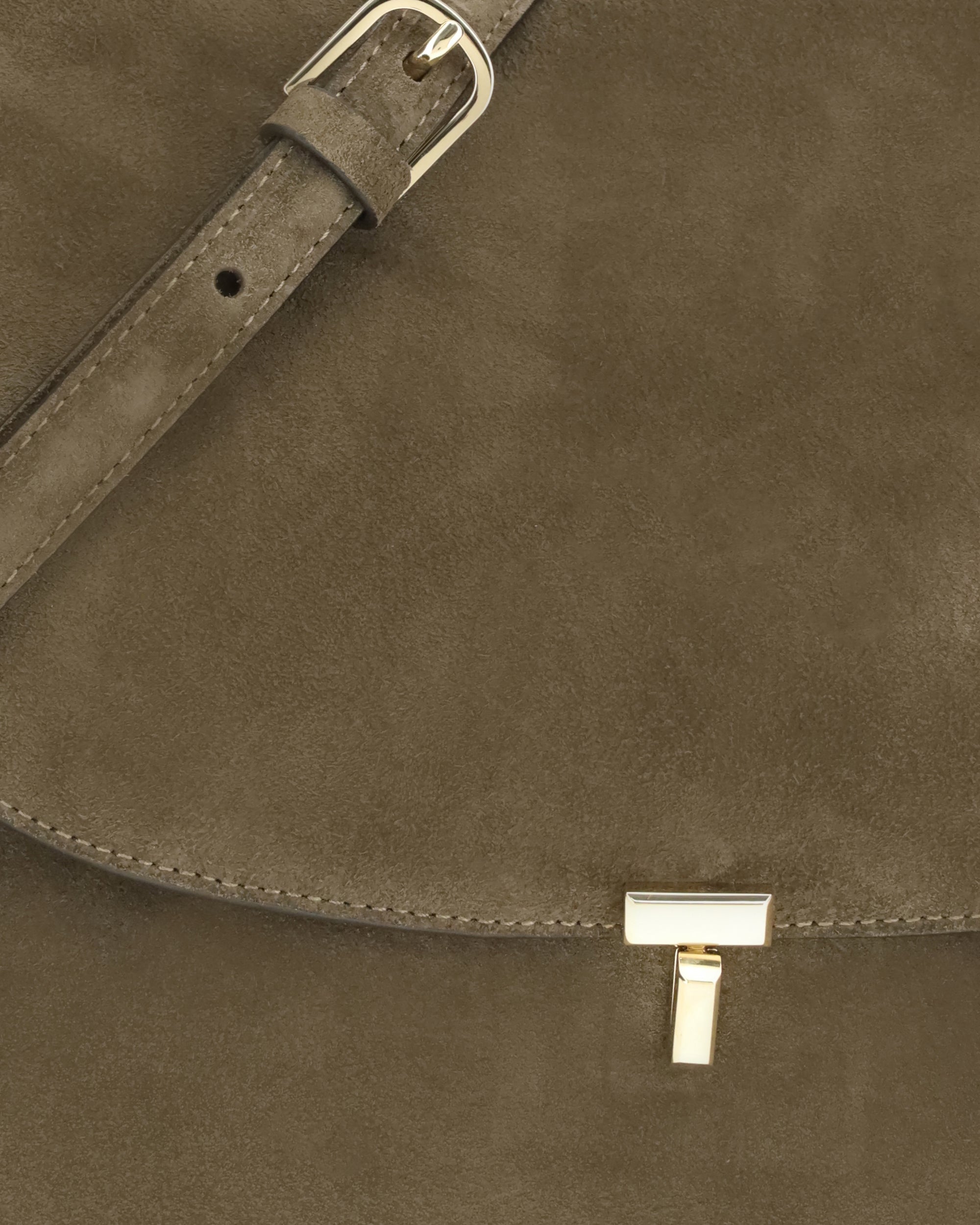 The T-Lock suede satchel Bag by TOTEME is a timeless bag crafted in Italy from soft suede, featuring a deconstructed silhouette designed for everyday use. It is finished with gold-tone metal details and TOTEME’s signature twist-lock closure. The bag comes with a detachable and adjustable shoulder strap and a detachable top handle, allowing it to be carried by hand, on the shoulder, or cross-body. The microsuede interior includes two slip pockets for added practicality.