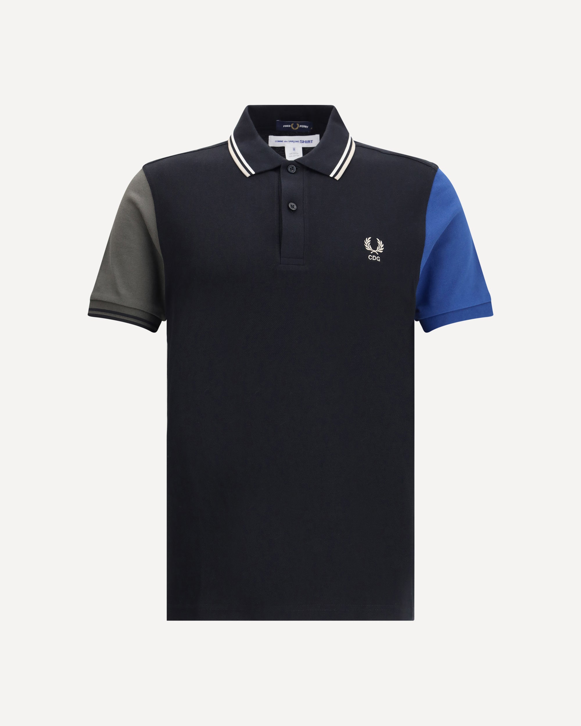 The Comme Des Garçons X Fred Perry Polo features a regular fit and is crafted from high-quality smooth fabric. The black design with a green right sleeve and a blue left sleeve creates a bold, contemporary contrast. An essential piece for a modern wardrobe, combining sophistication with an avant-garde touch.