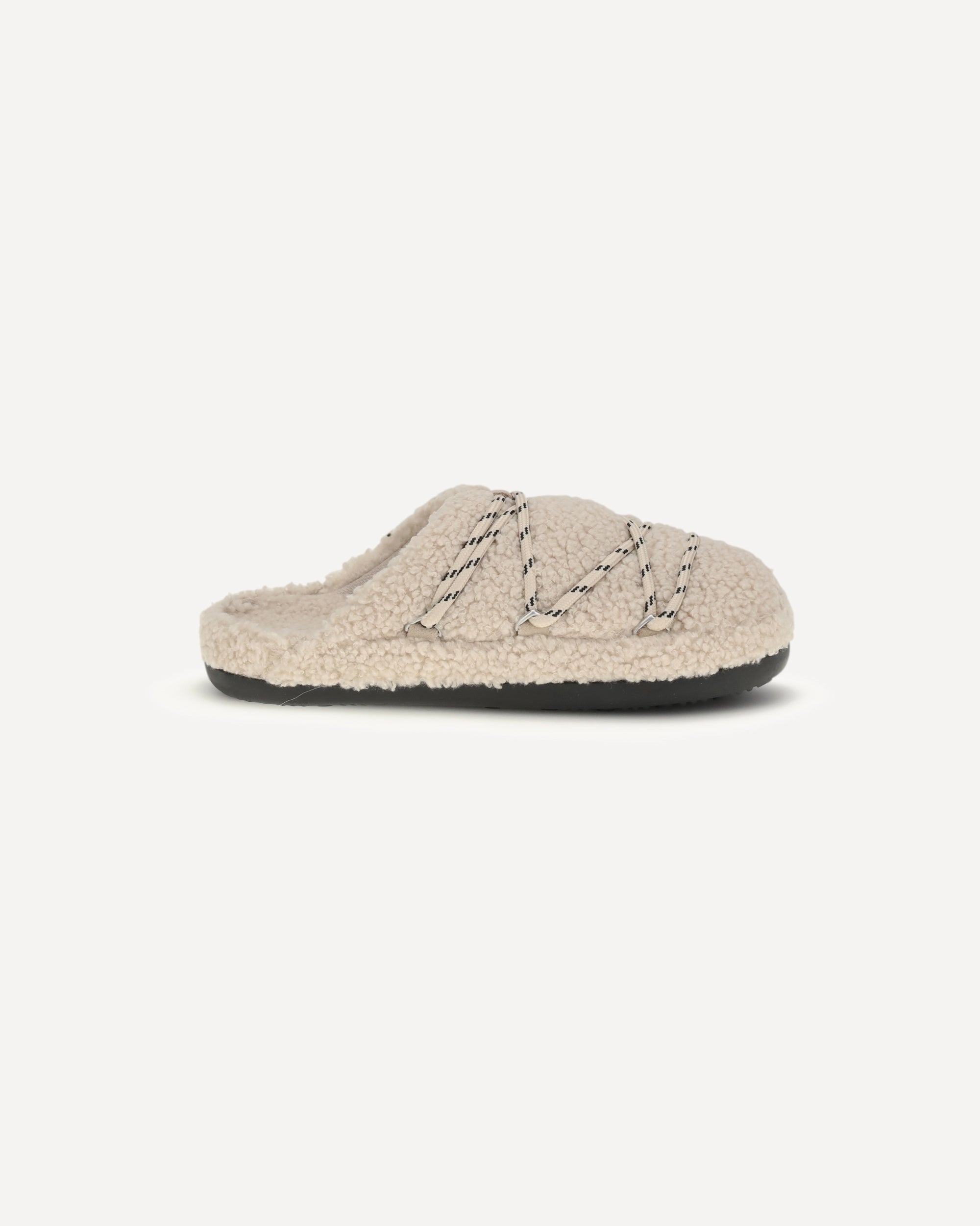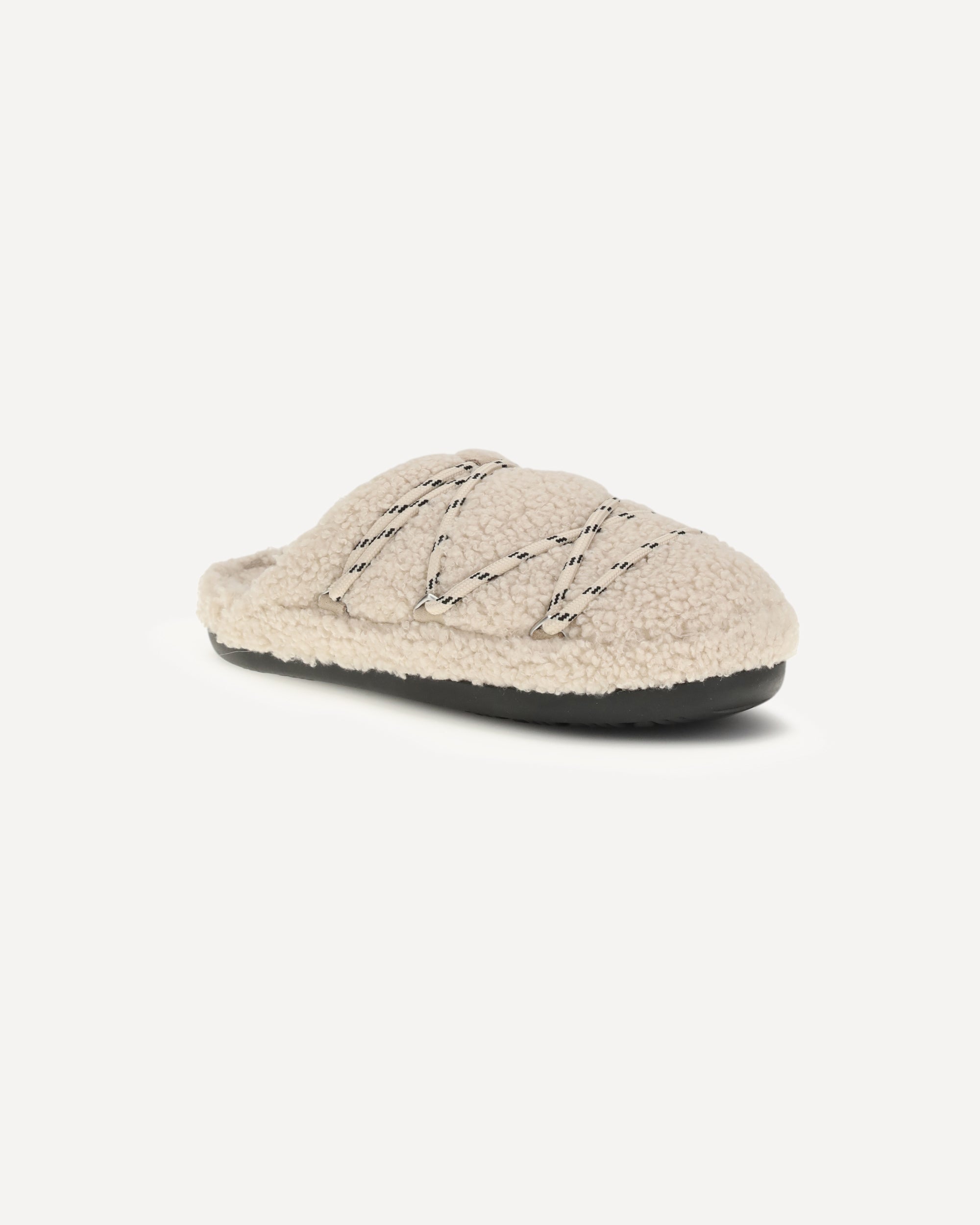 The Teddy Slipper by Moon Boot blends elegance, comfort, and cosmic coolness. Featuring the brand’s iconic lacing, a soft teddy finish, and a non-slip rubber sole, this genderless slip-on adapts effortlessly to indoor and outdoor settings, or wherever life takes you. The design includes crossed tubular laces, metal eyelets, a branded heel counter, and a cushioned midsole that ensures a soft, stable step.