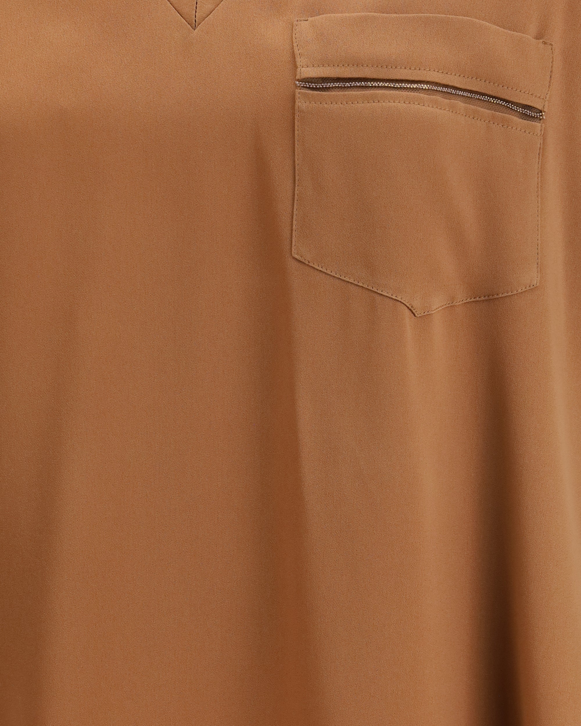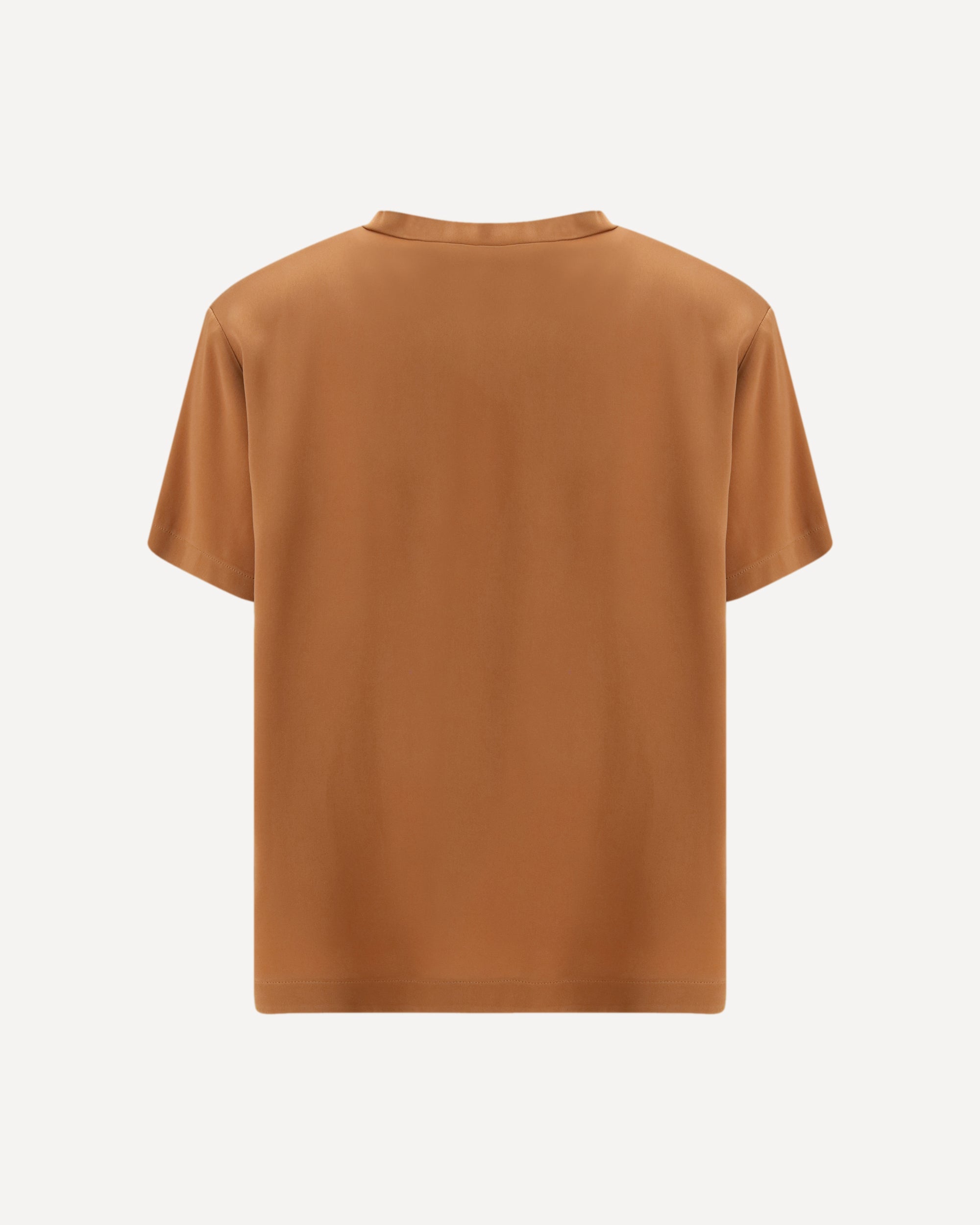 The short-sleeved T-shirt by Fabiana Filippi features a clean V-neckline and a single trompe-l’oeil front pocket, enhanced with subtle sparkling details that bring a refined touch of shine. Crafted with the brand’s signature artisanal quality, it offers a polished, versatile silhouette ideal for understated everyday elegance.