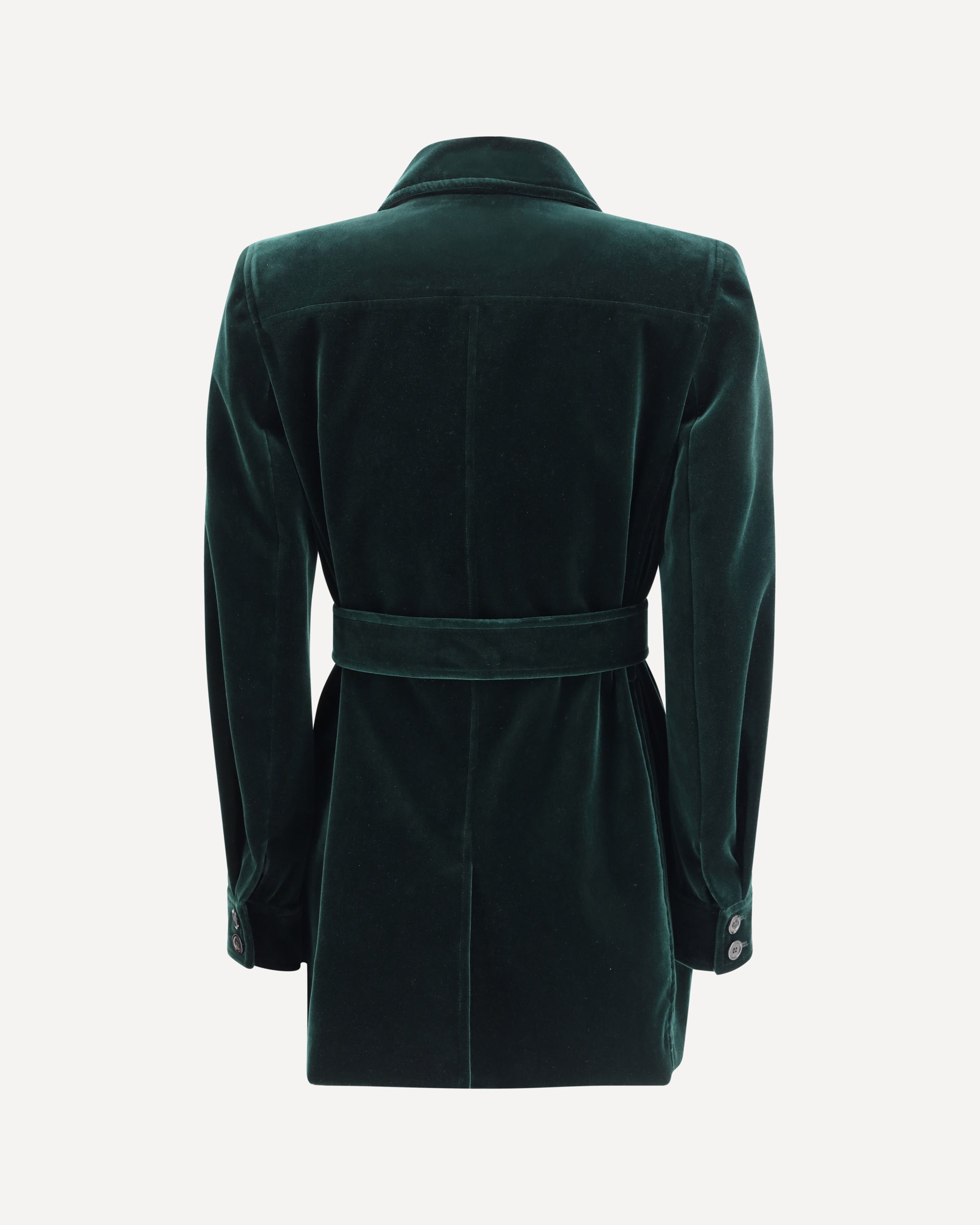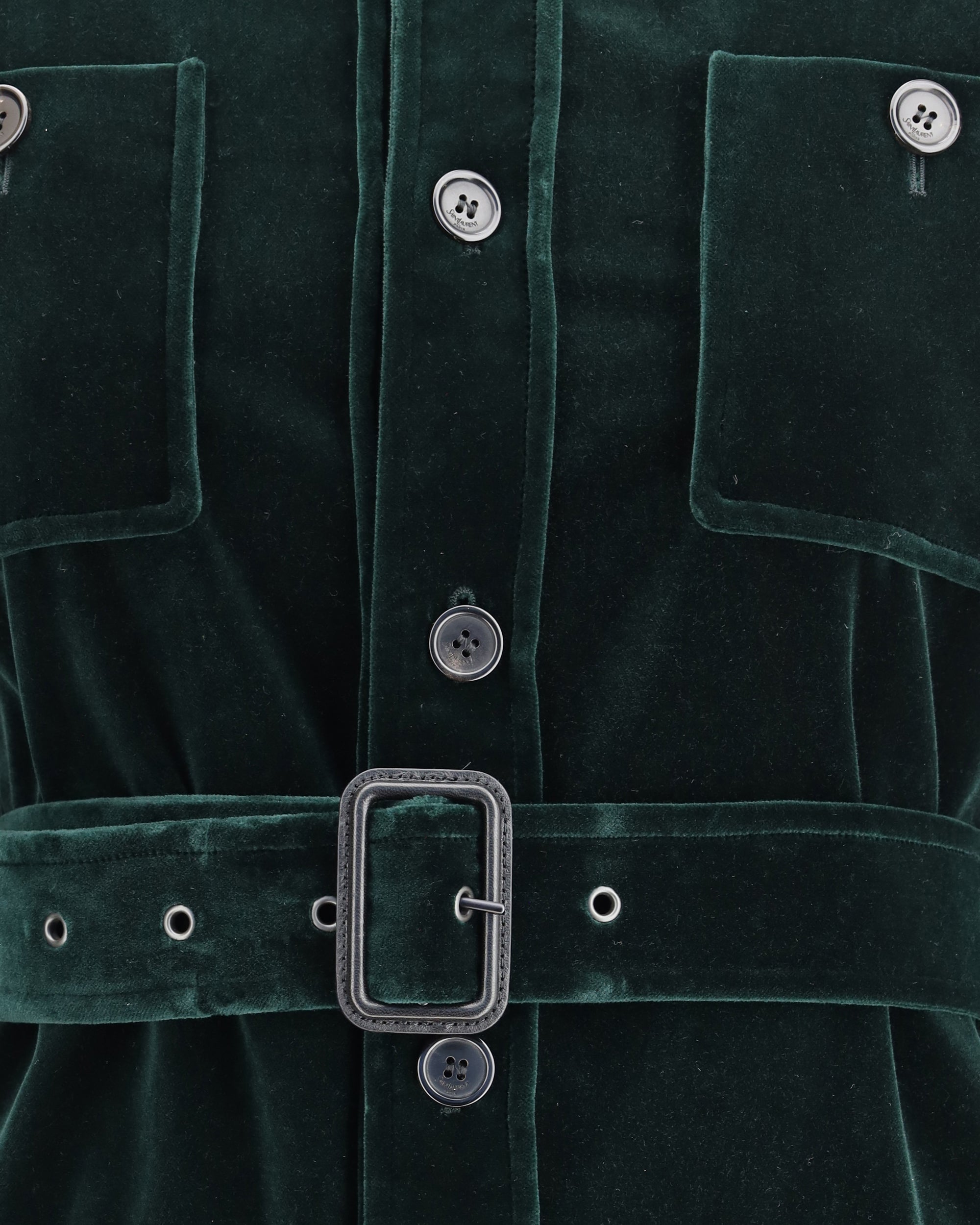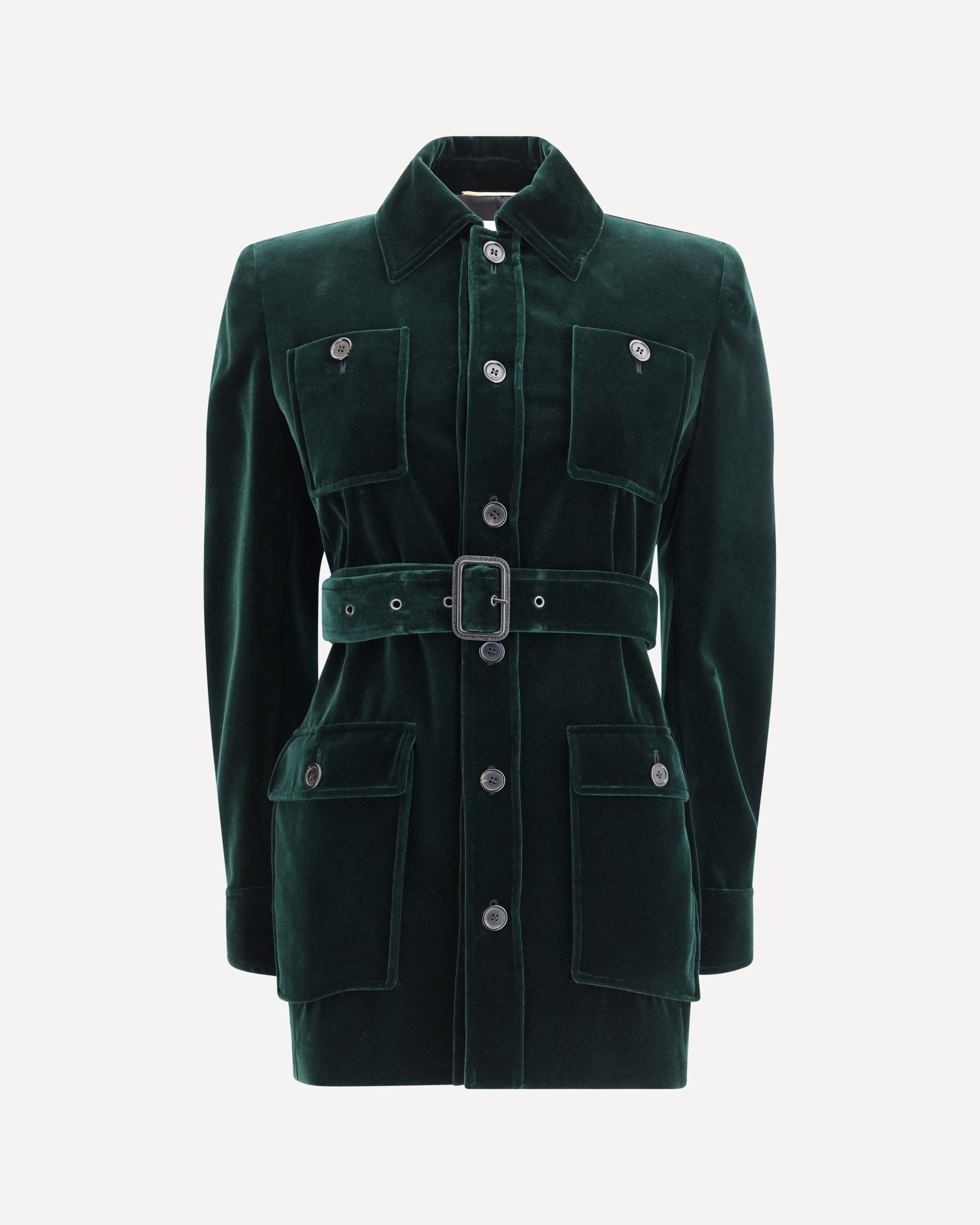 Saint Laurent's velvet saharan Jacket is a garment of decisive elegance and timeless style. Made of soft velvet, it features a front button closure, pointed collar and double-button cuffs. The four patch pockets, two on the chest and two on the front with flap and button, along with the two inside welt pockets, offer practicality and functionality. Completing the design is the adjustable and removable belt, which defines the silhouette with a refined and versatile touch.