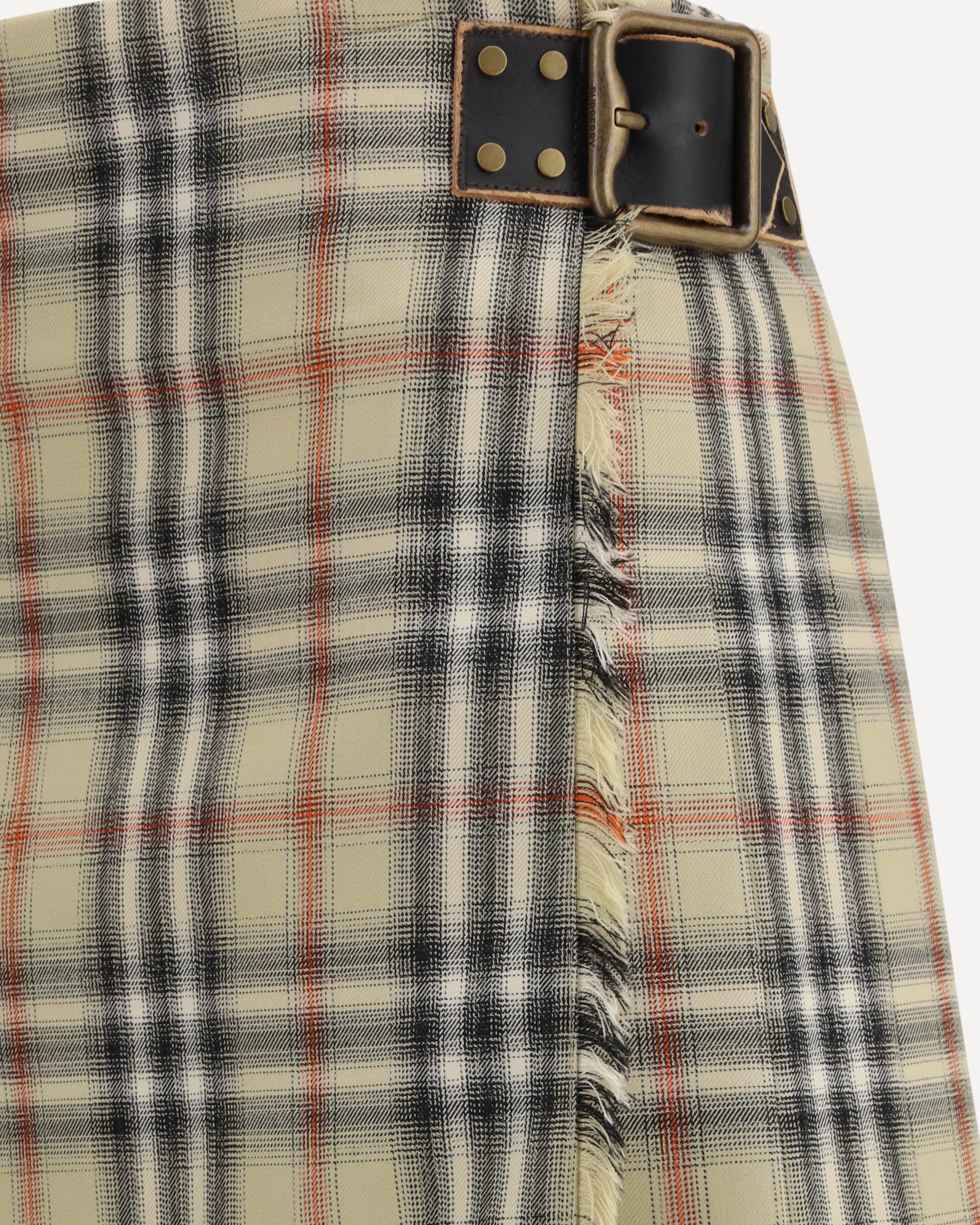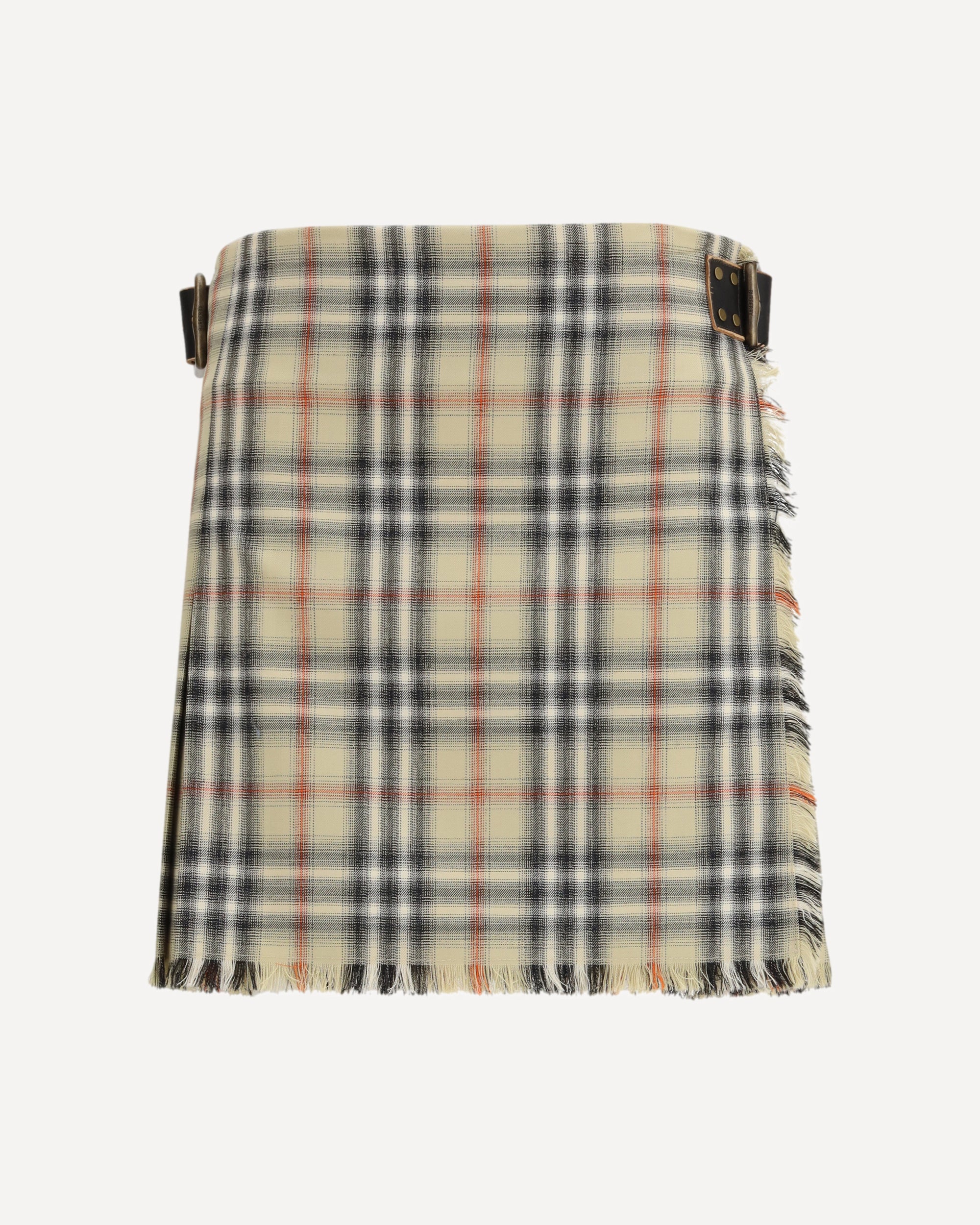 The Check wool mini Skirt by Burberry crafted in Scotland from wool twill and woven with a seasonal interpretation of the iconic Burberry Check. The straight silhouette features a mid-rise fit, soft pleats, and delicate fringed edges. The side leather strap and antiqued B-shaped buckles—engraved with the Burberry lettering—allow for an adjustable fit. A timeless piece blending British heritage with refined modern elegance.