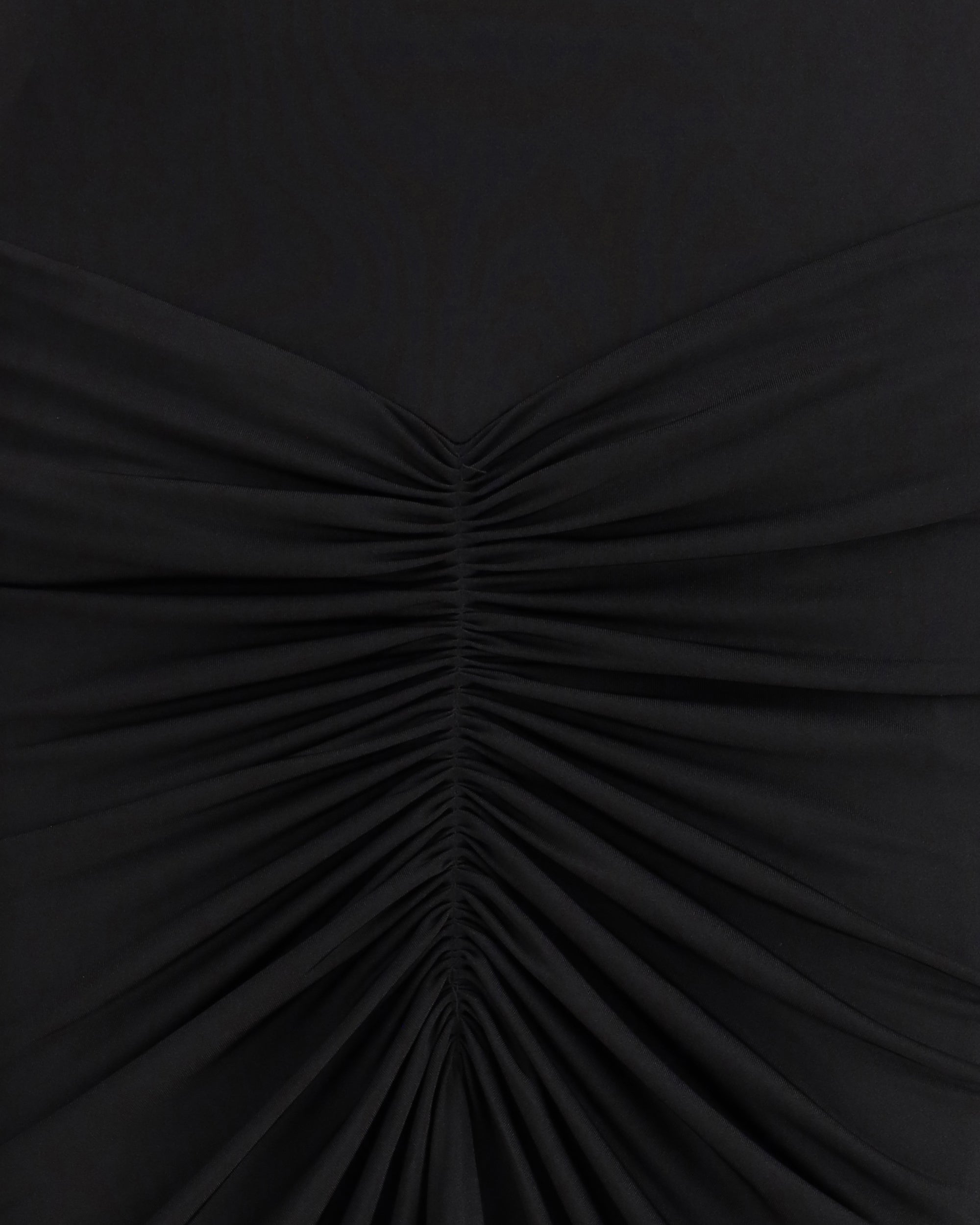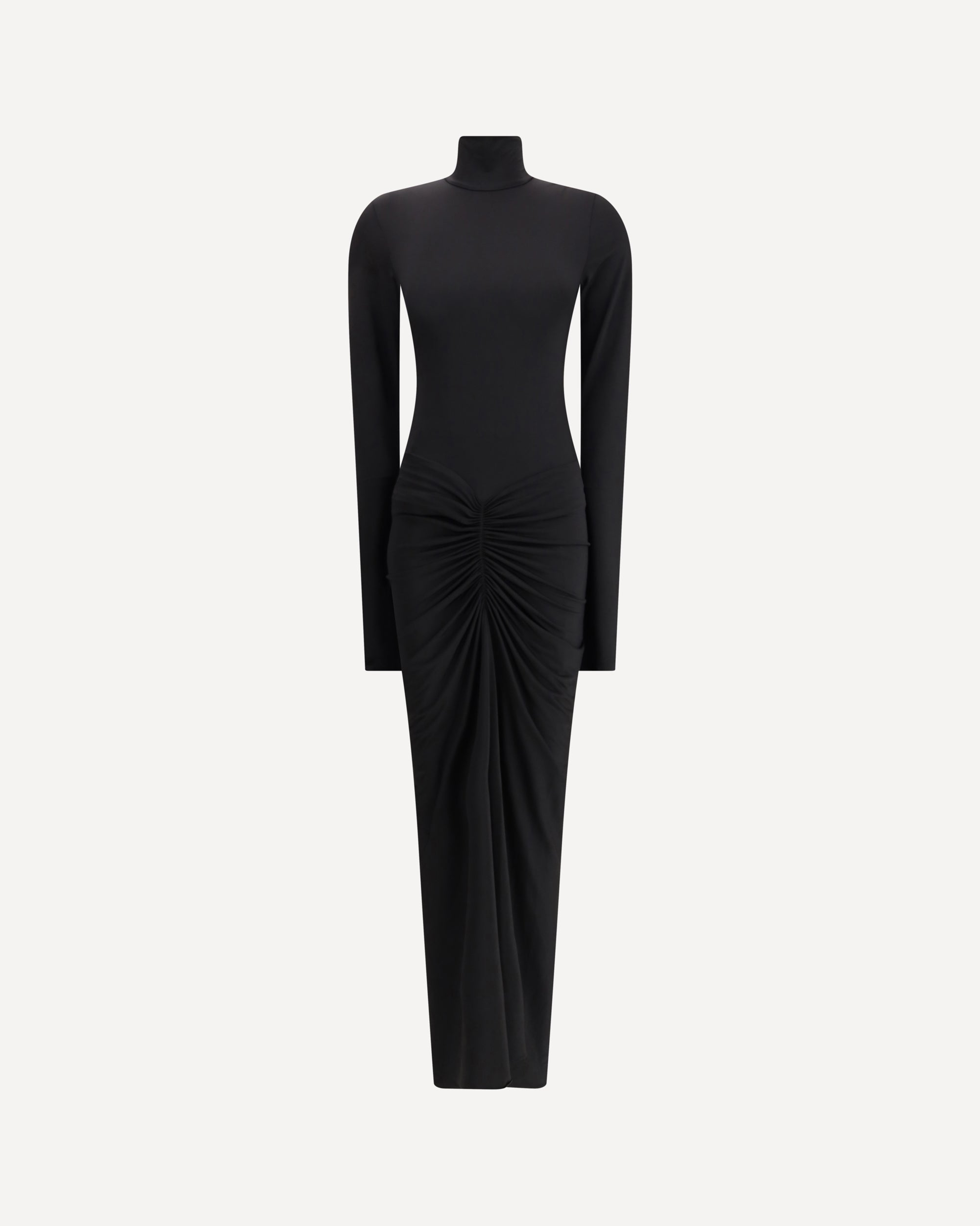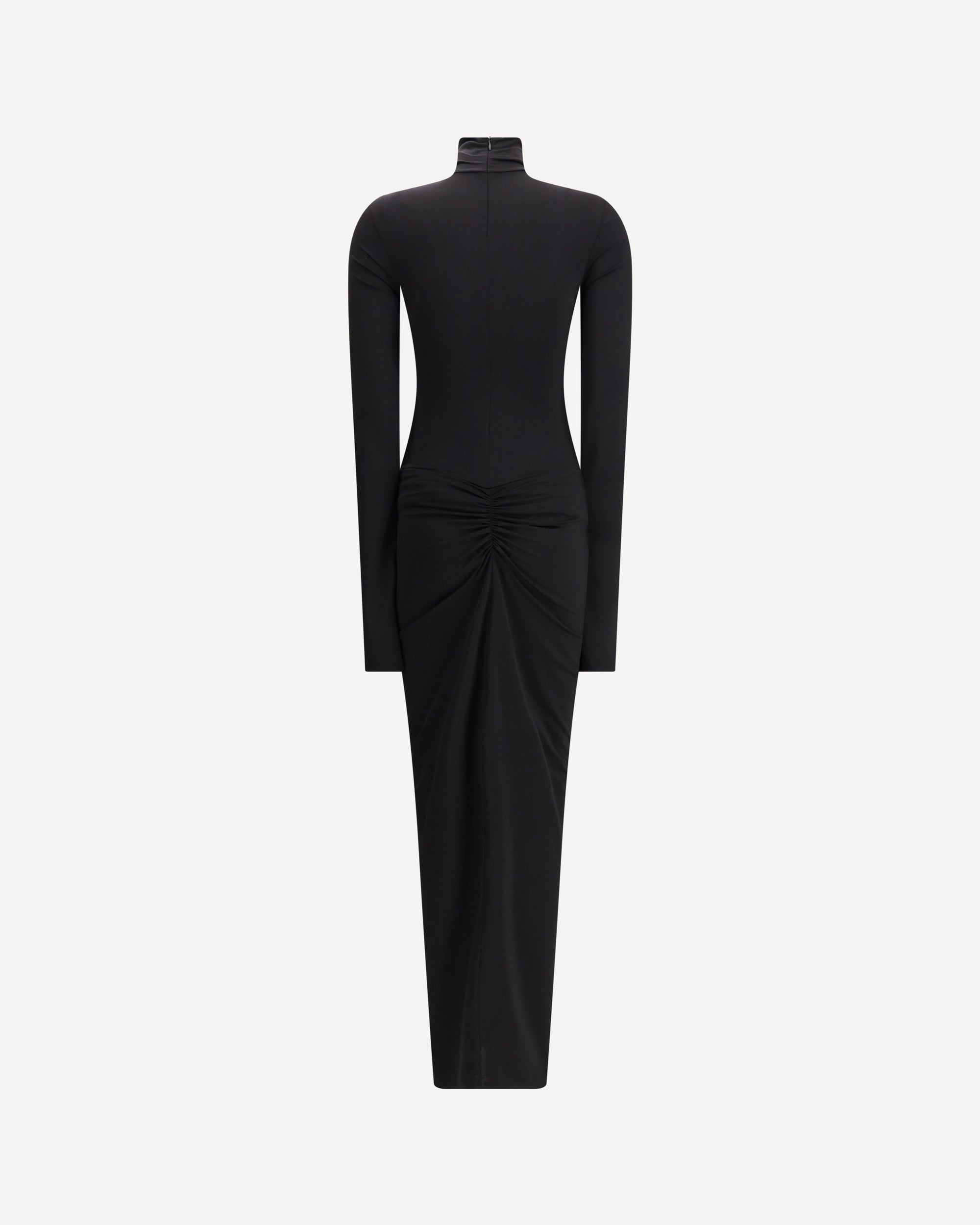 The Long Dress in Polyester by The Andamane embodies refined elegance through a slim fit silhouette that naturally enhances the figure. A high neckline and long sleeves lend a composed, contemporary character, while ruching at the back and along the parallel section adds movement and femininity to the design. A piece that blends comfort with sophistication, created to accompany life’s most special occasions in style.