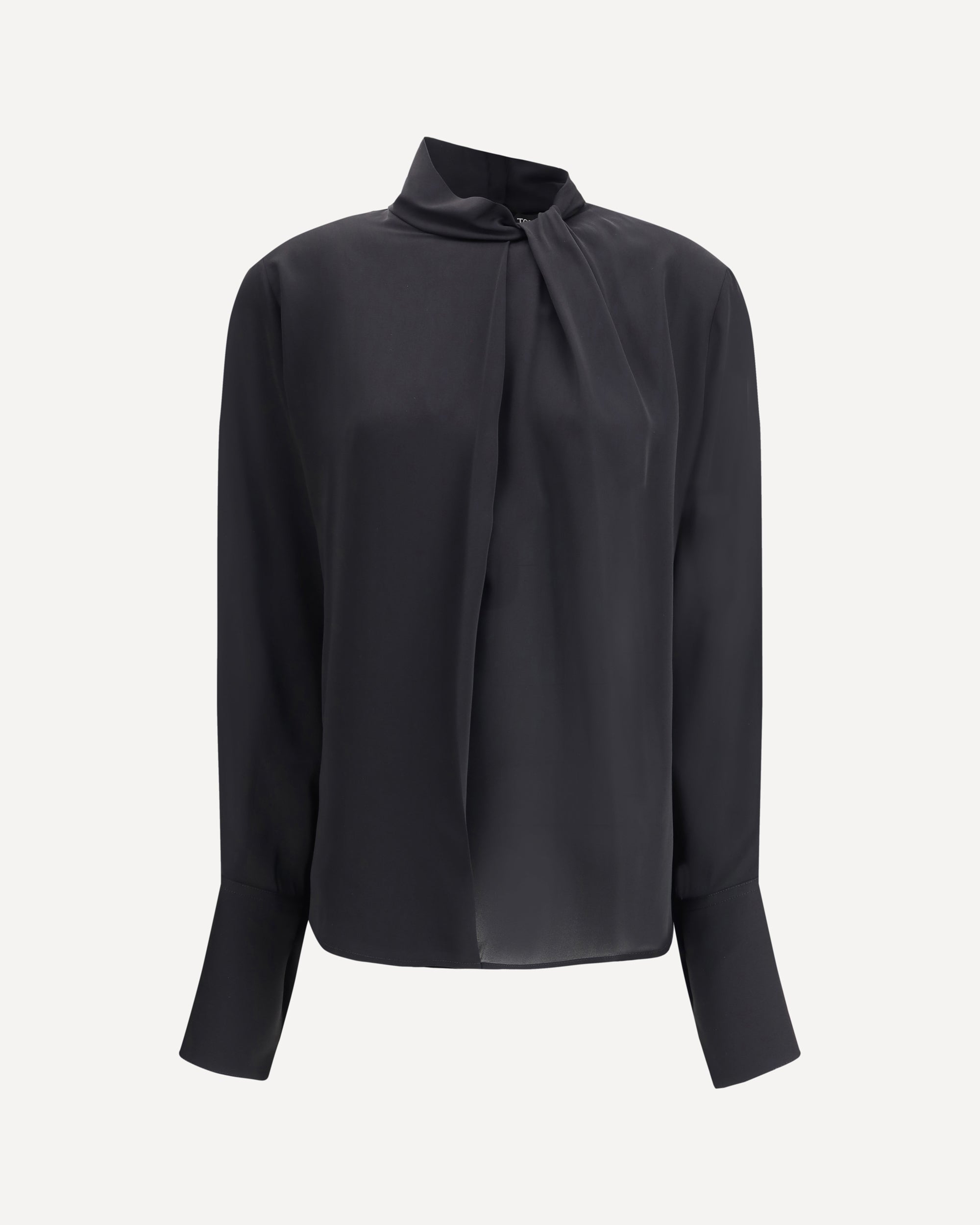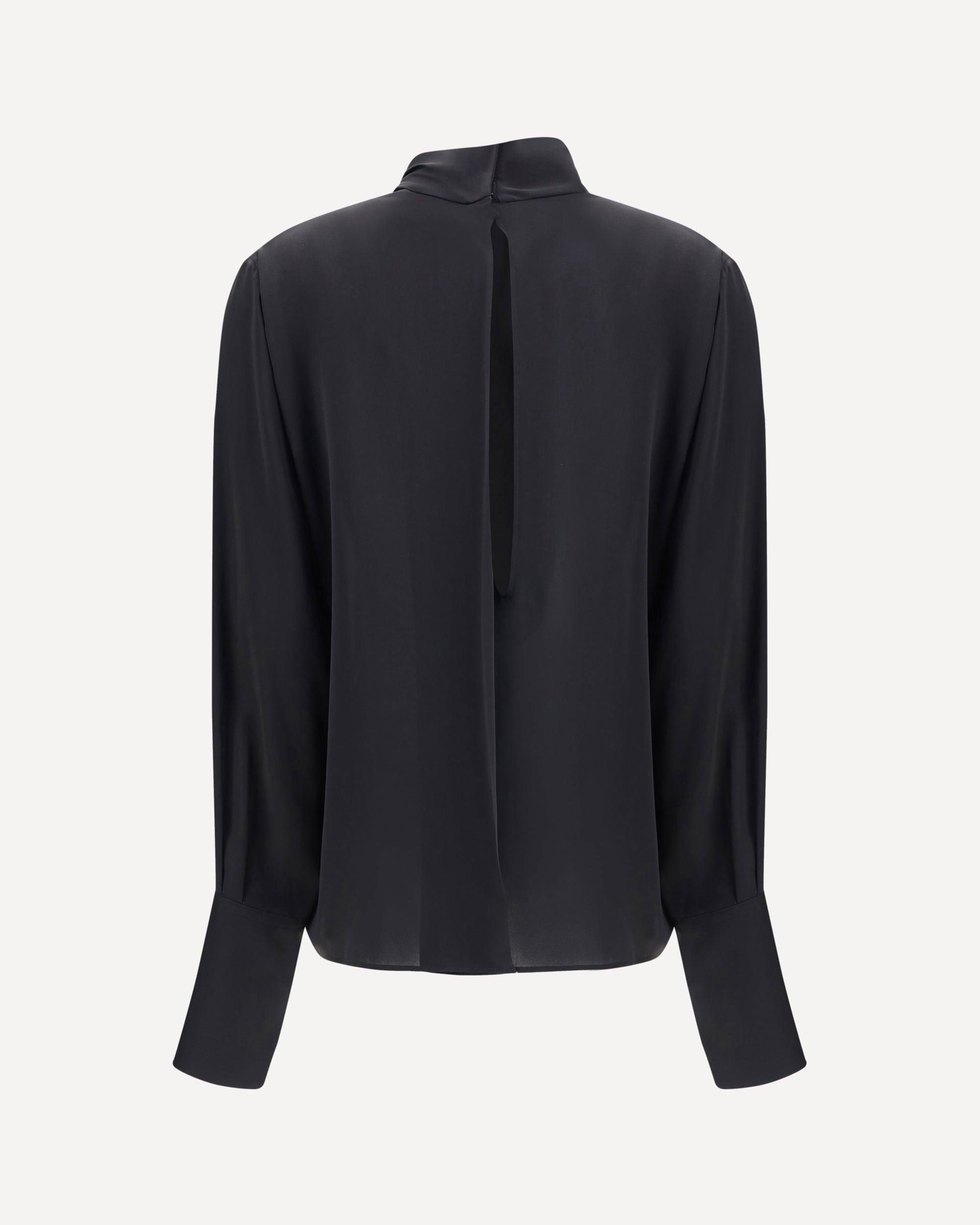 Tom Ford's silk georgette Blouse is an elegant and sensual piece perfect for special occasions. Featuring a refined high neck, it is distinguished by cut-out details on the front and back, which add a bold and sophisticated touch to the design. The back closure with snap buttons completes the garment discreetly, enhancing the slender and feminine silhouette. An iconic model that combines light transparencies and tailored details, typical of Tom Ford's decisive aesthetic.