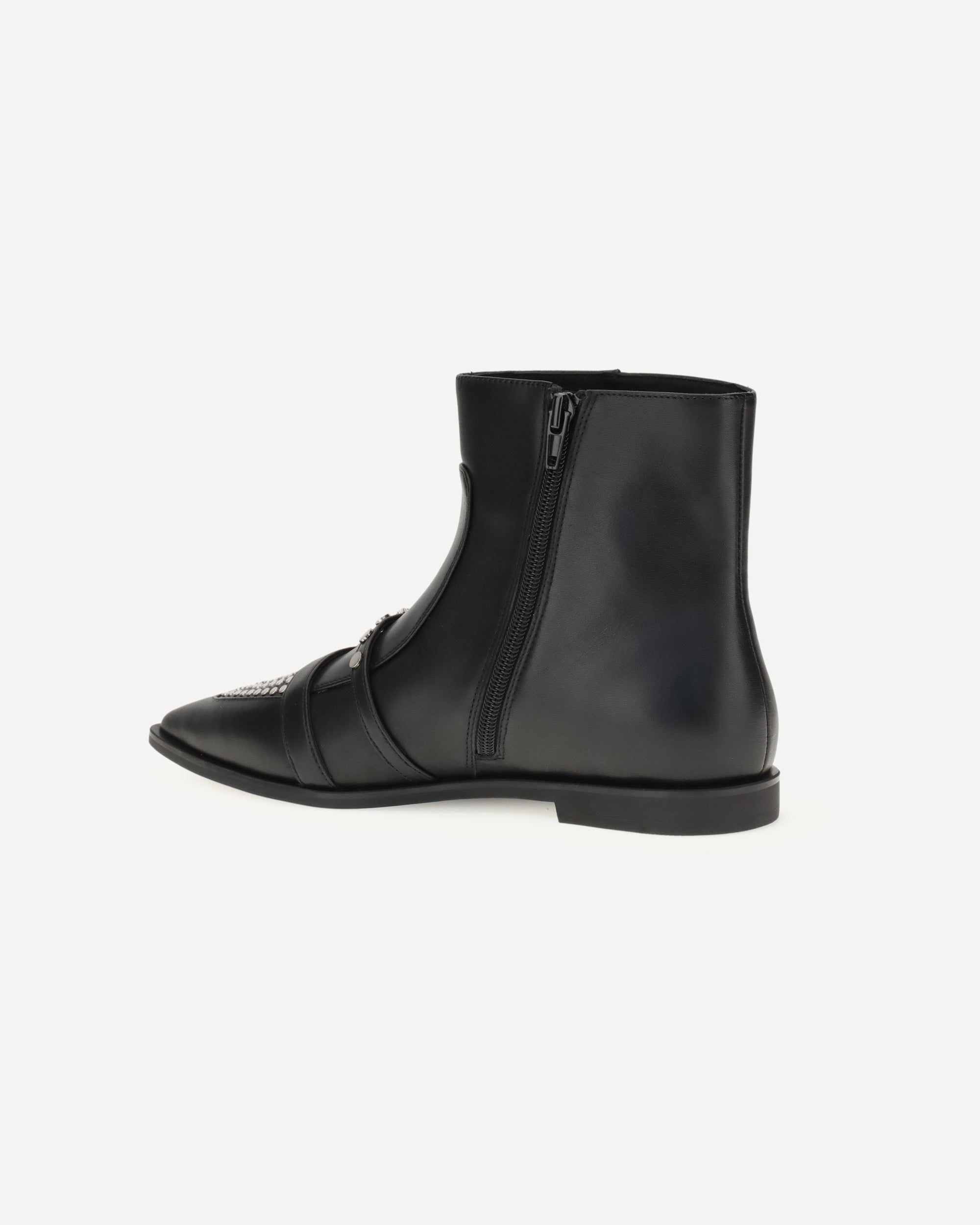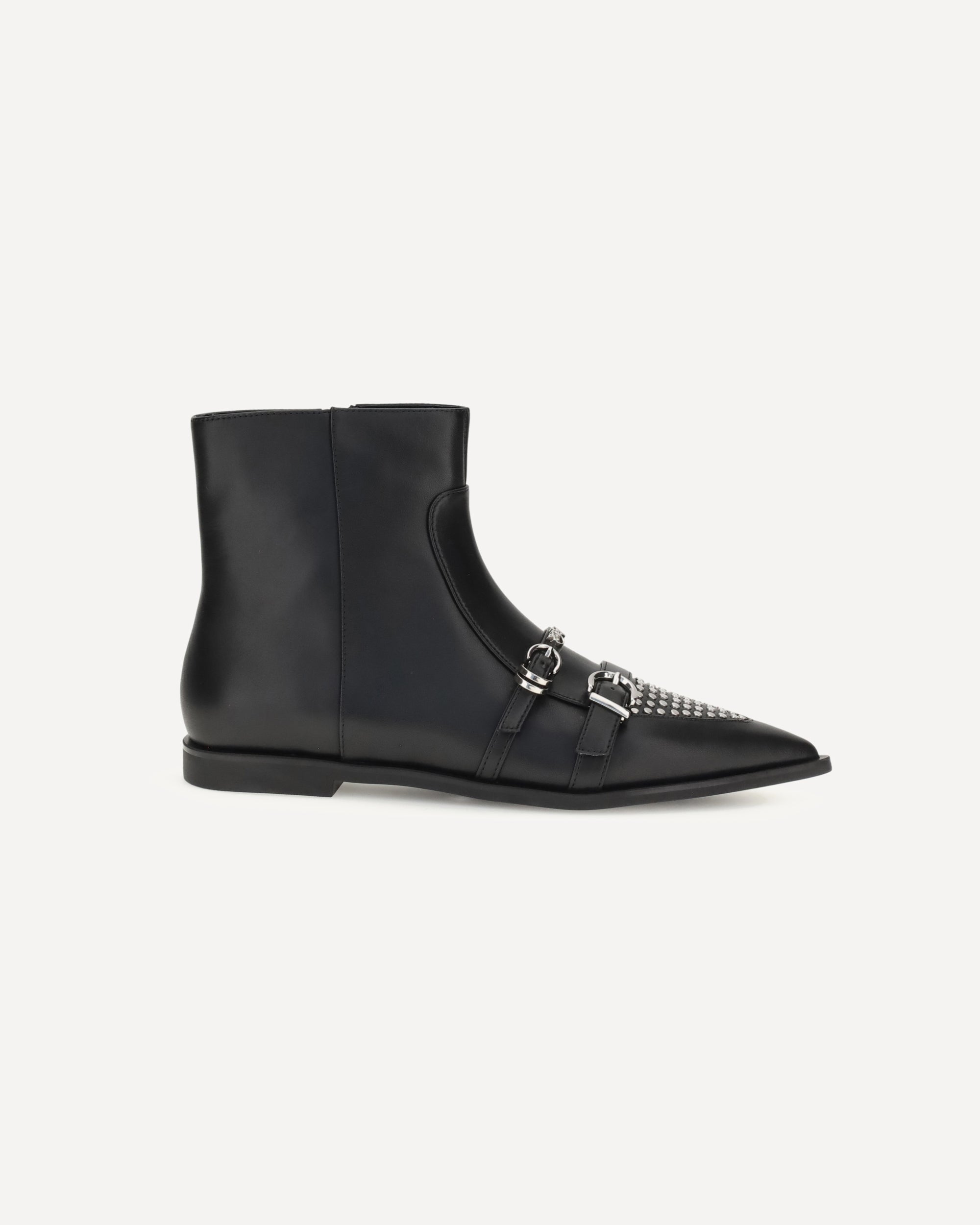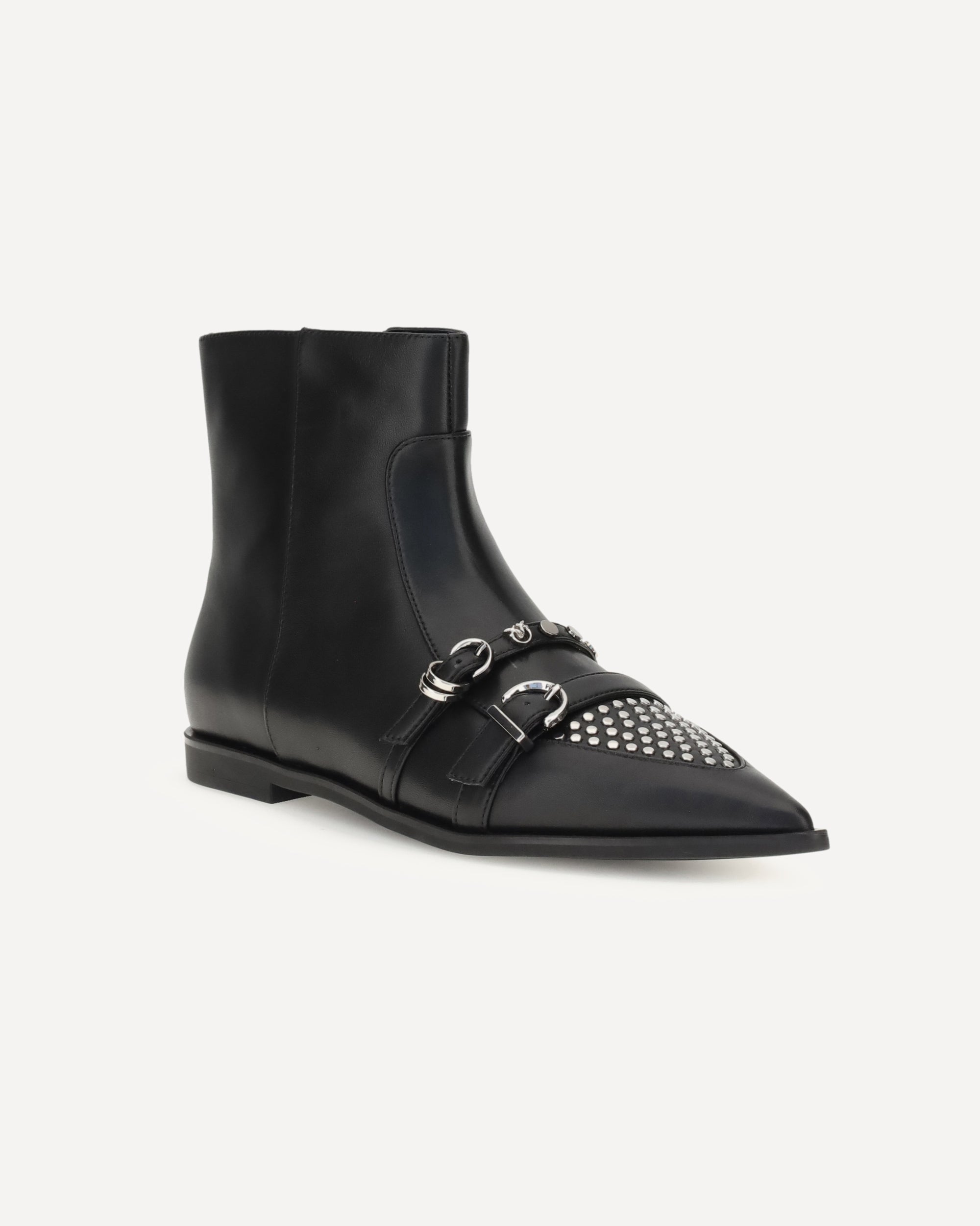Pinko's Ankle Boots stand out for their bold design and contemporary character. With a height that exceeds the ankle, they offer a snug fit and urban-chic style. The almond toe gives balance between elegance and grit, while the two buckles at the top add a rock and structured touch. On the upper, studs create an interplay of metallic details that enhance the look with a bold accent. The side zipper ensures practicality in the fit, completing a perfect model for those looking for a versatile ankle boot with personality.