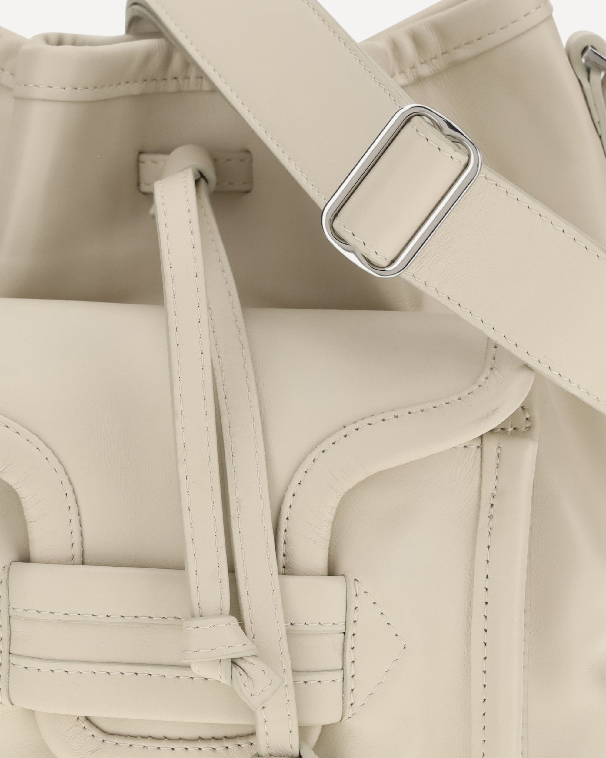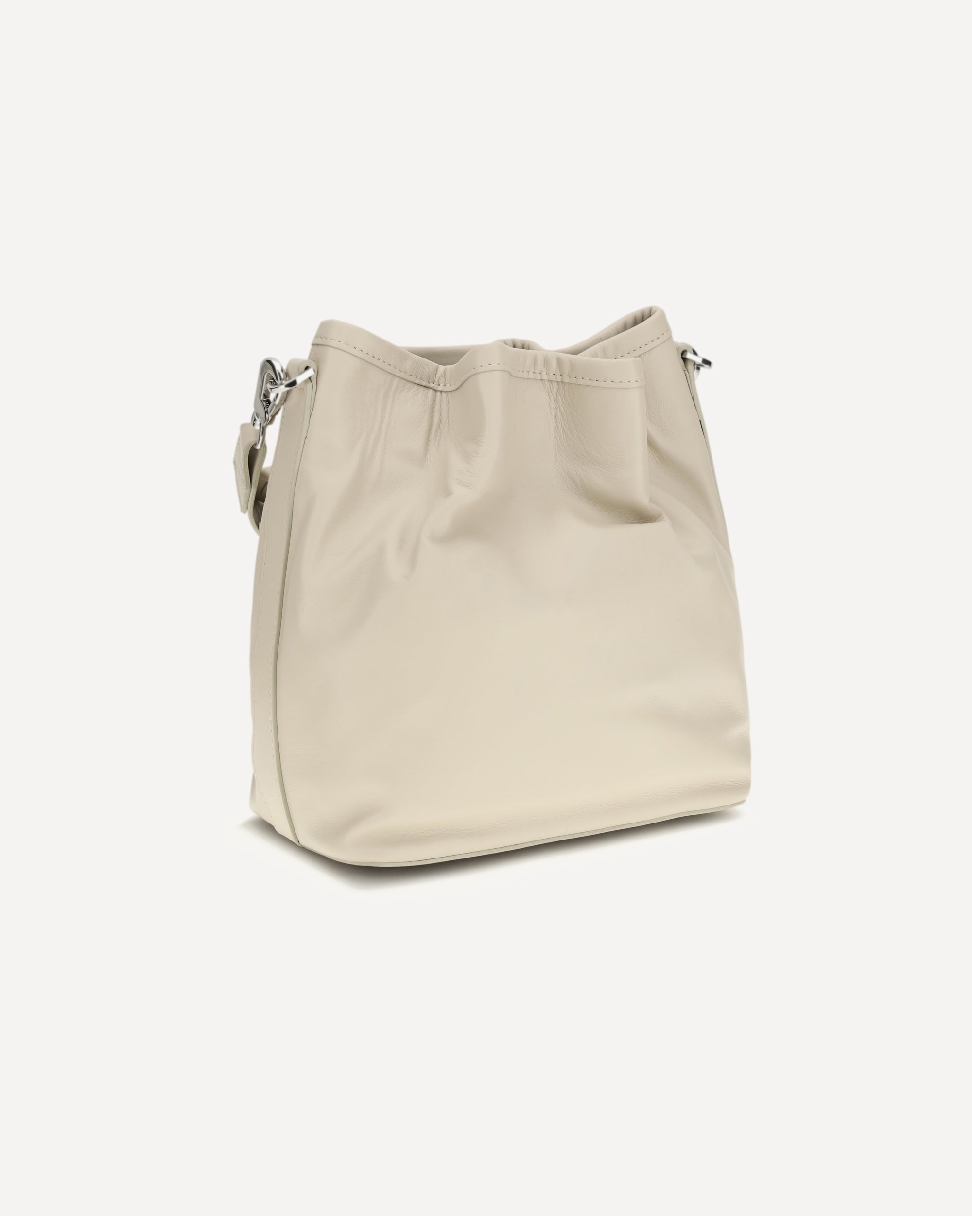 Calfskin Alpha Bucket Bag by Pierre Hardy, suede leather design, drawstring closure at top, adjustable and removable shoulder strap, single interior compartment, front patch flap pocket.