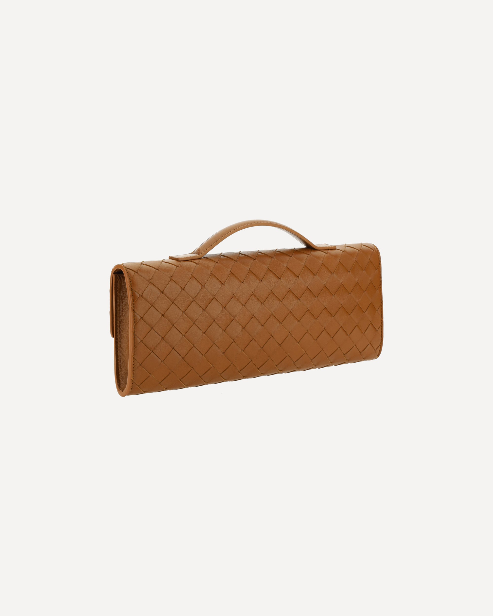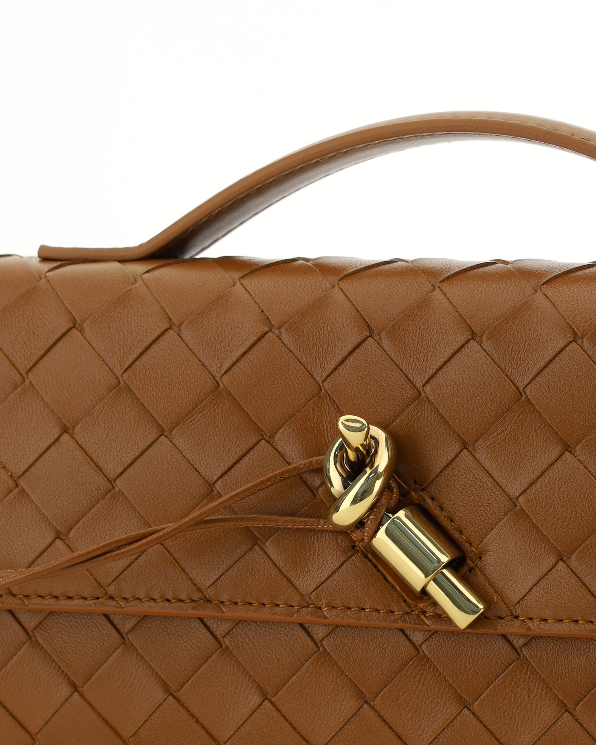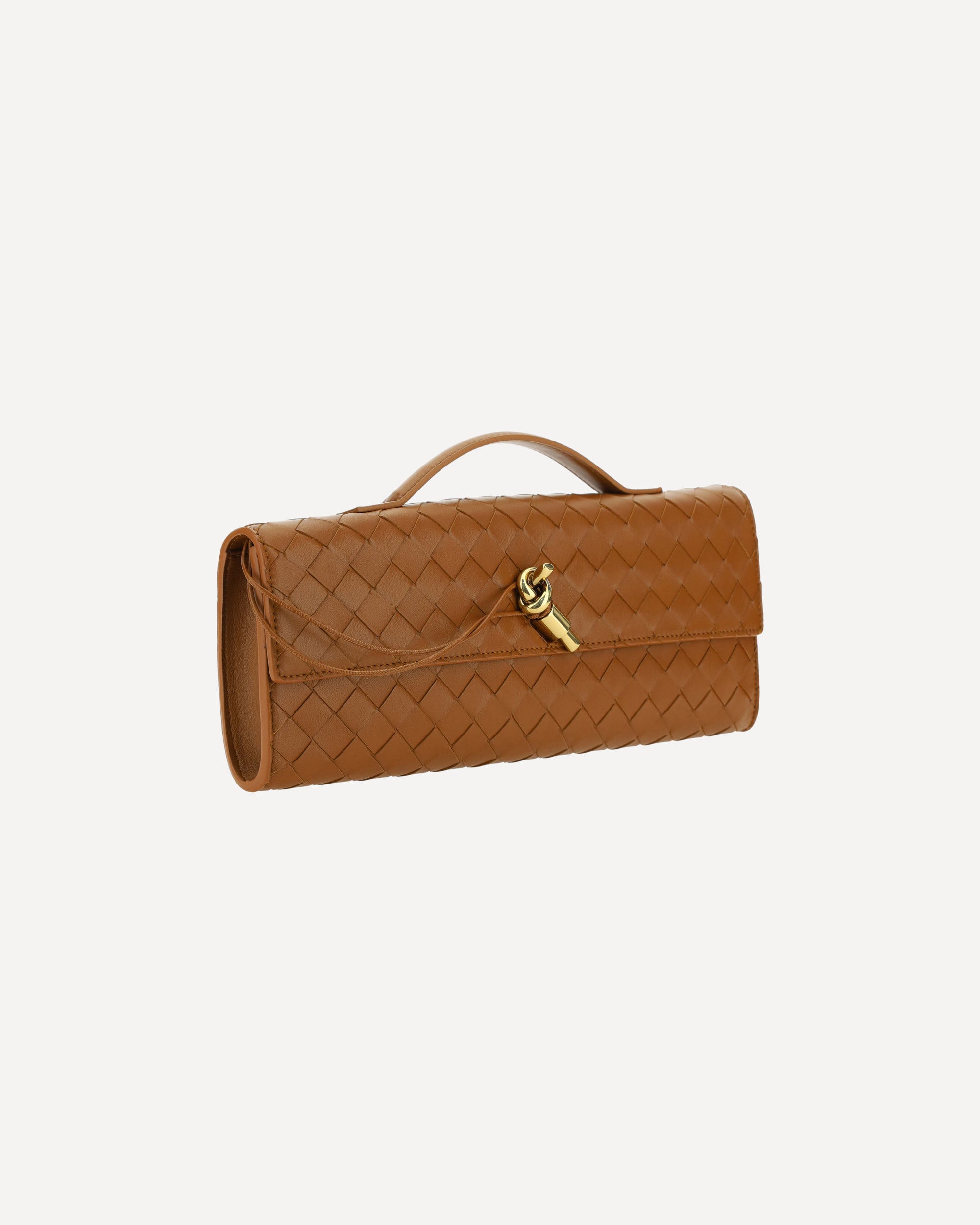 The Andiamo Handbag in lambskin leather by Bottega Veneta features a flat top handle that adds an elegant and practical touch. The bag features the brand's iconic woven workmanship, which defines its distinctive design. The front closure is secured by a magnetic flap and an iconic detailed Knot hook plated in antiqued brass. Inside, it offers a single compartment, perfect for holding everything neatly and elegantly.
