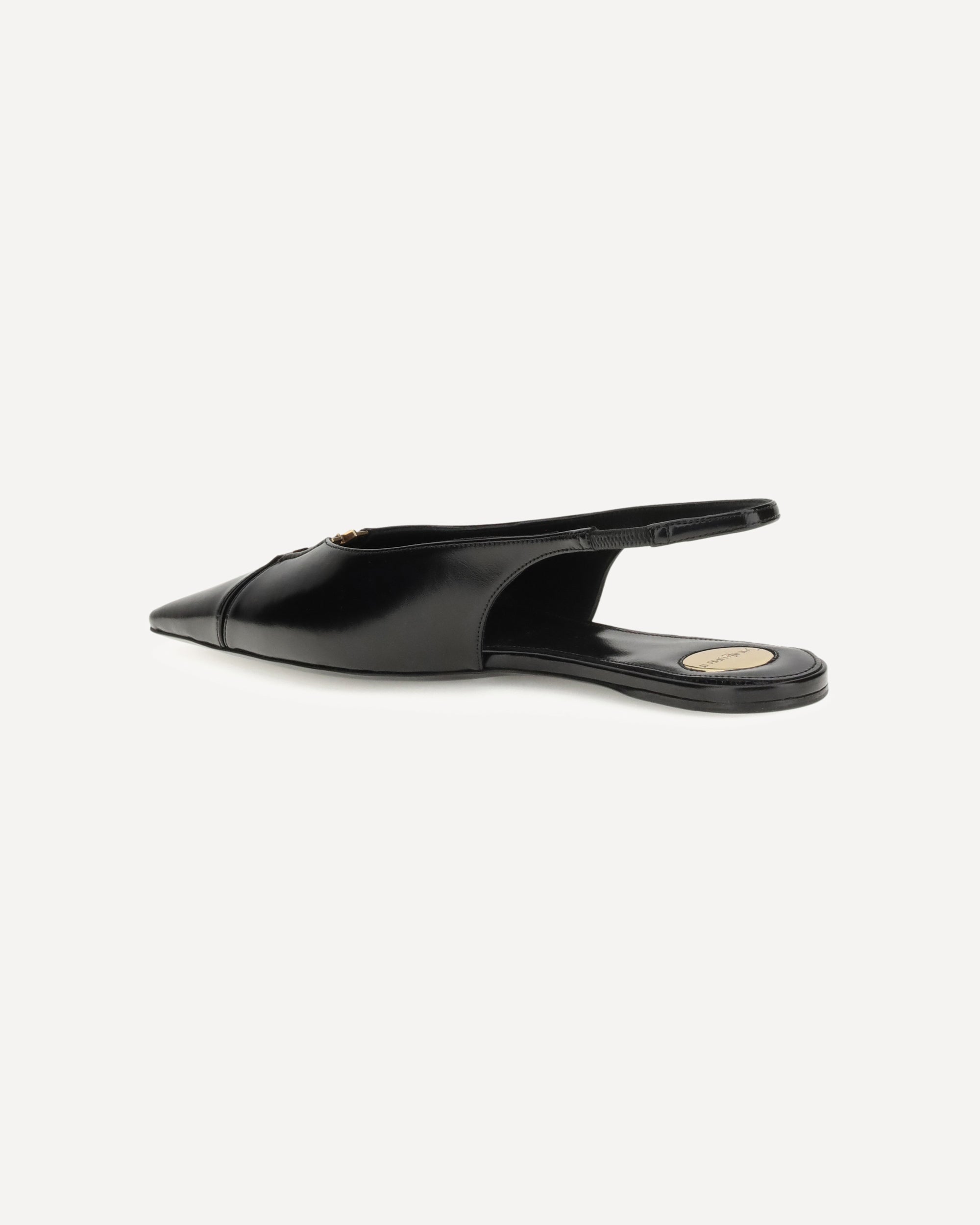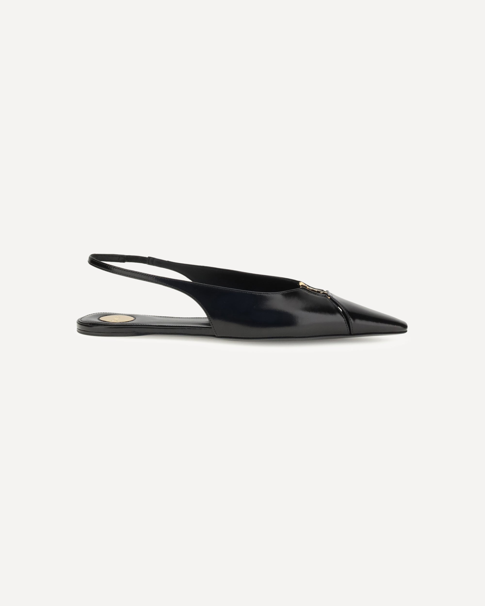 Saint Laurent's Babylon Ballerinas reinterpret classic elegance with a distinctive modern twist. Open at the back, they feature a sleek silhouette thanks to an elongated cut-out toe, embellished with the iconic CASSANDRE signature in bronze-colored metal. The elasticized strap ensures a snug and comfortable fit, while the round Saint Laurent engraved plaque on the insole adds a refined and recognizable detail. Perfect for chic, casual style.