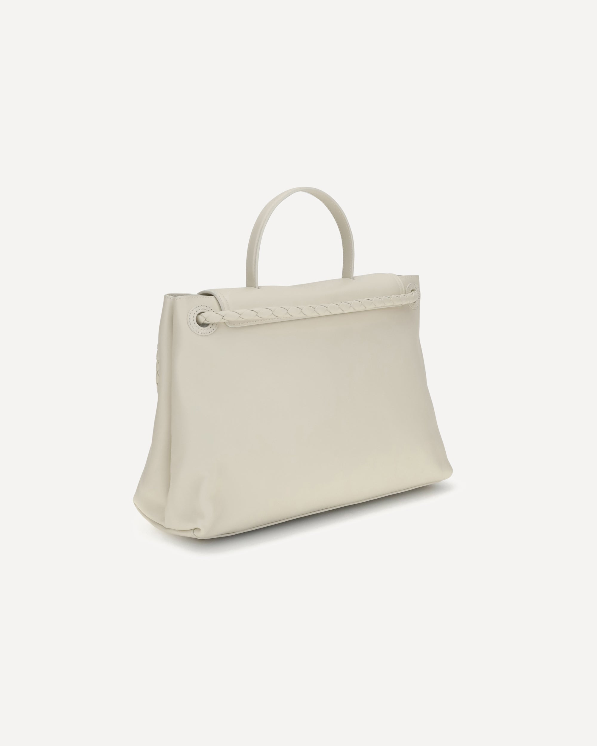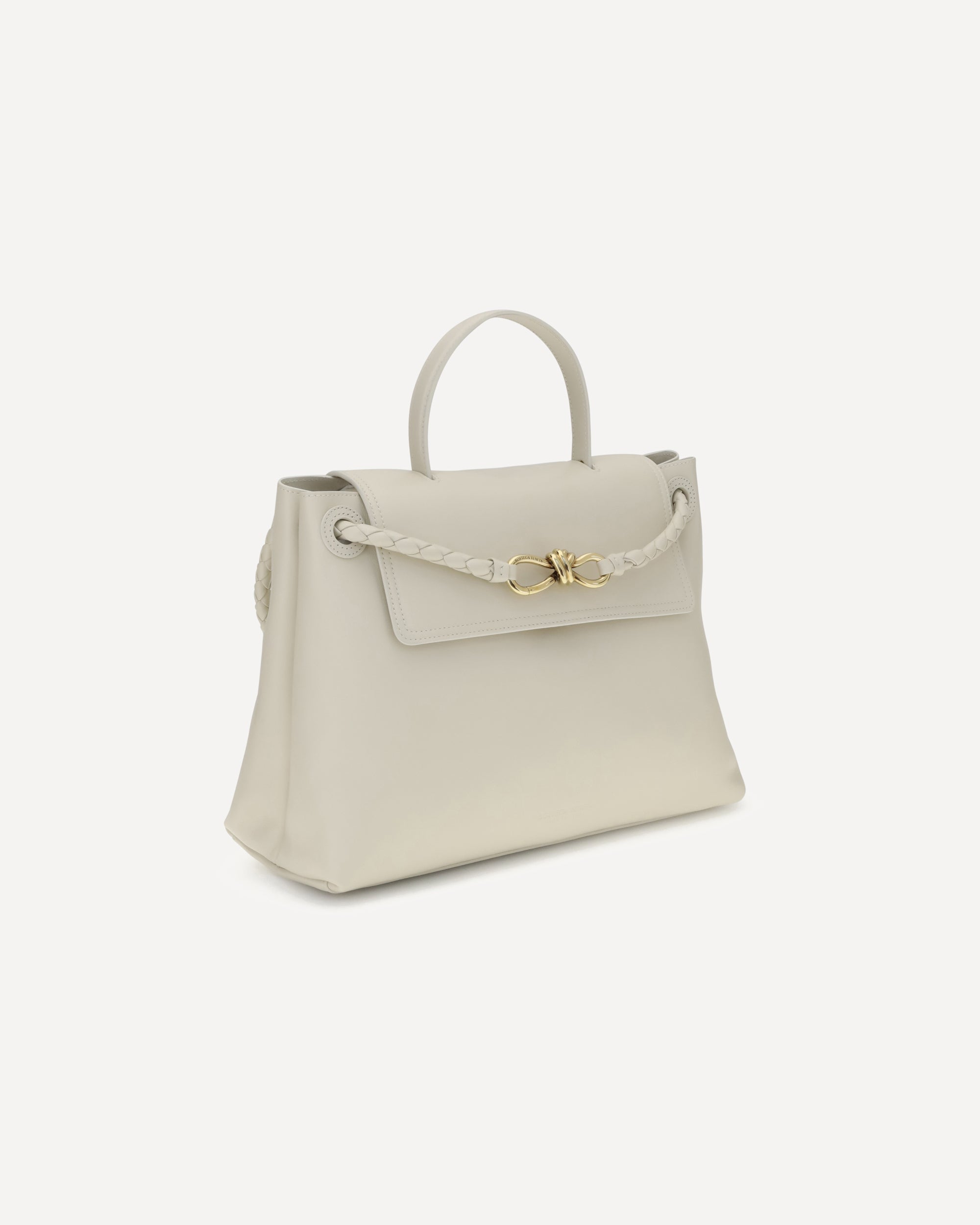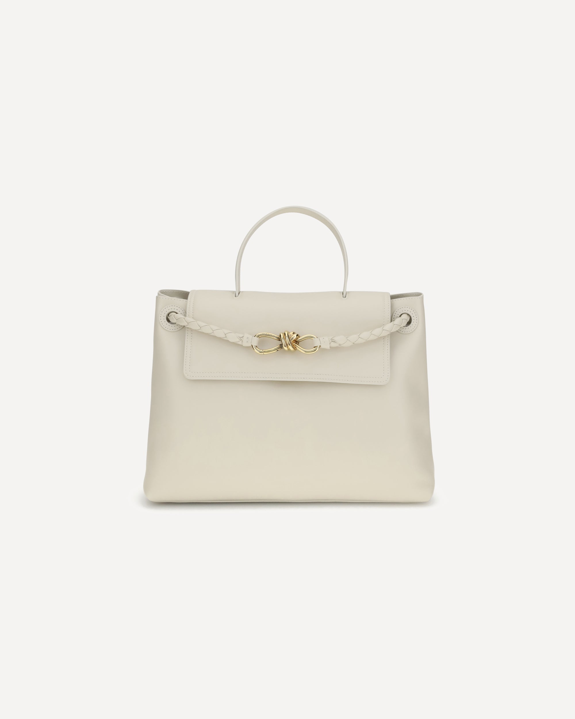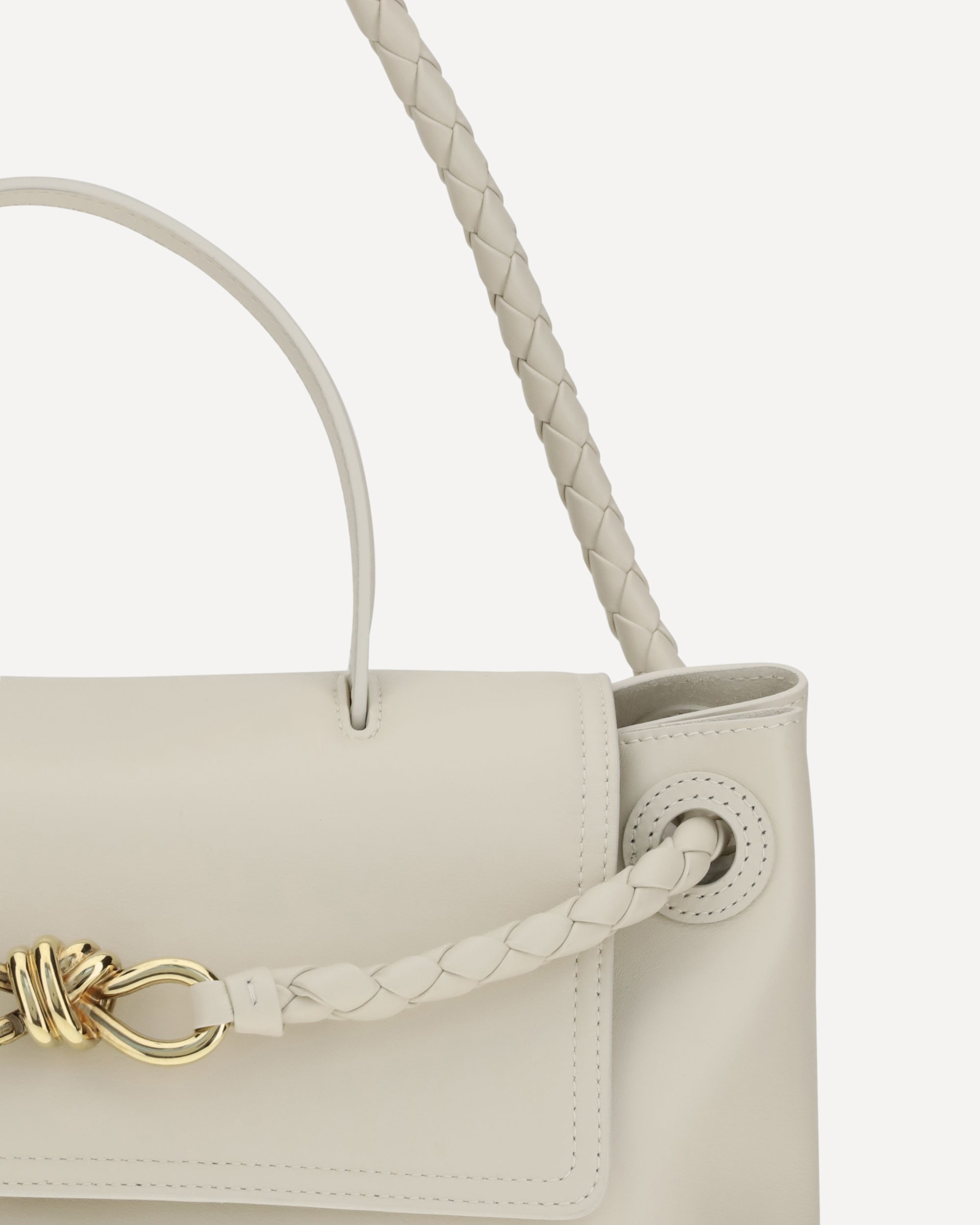 Ciao Ciao Handbag by Bottega Veneta is a perfect example of fine craftsmanship. It features a flat top handle and an adjustable braided shoulder strap for added versatility. The front flap closure, embellished with the iconic brass knot, adds a distinctive and sophisticated touch. An elegant and functional accessory, ideal for those seeking timeless style.