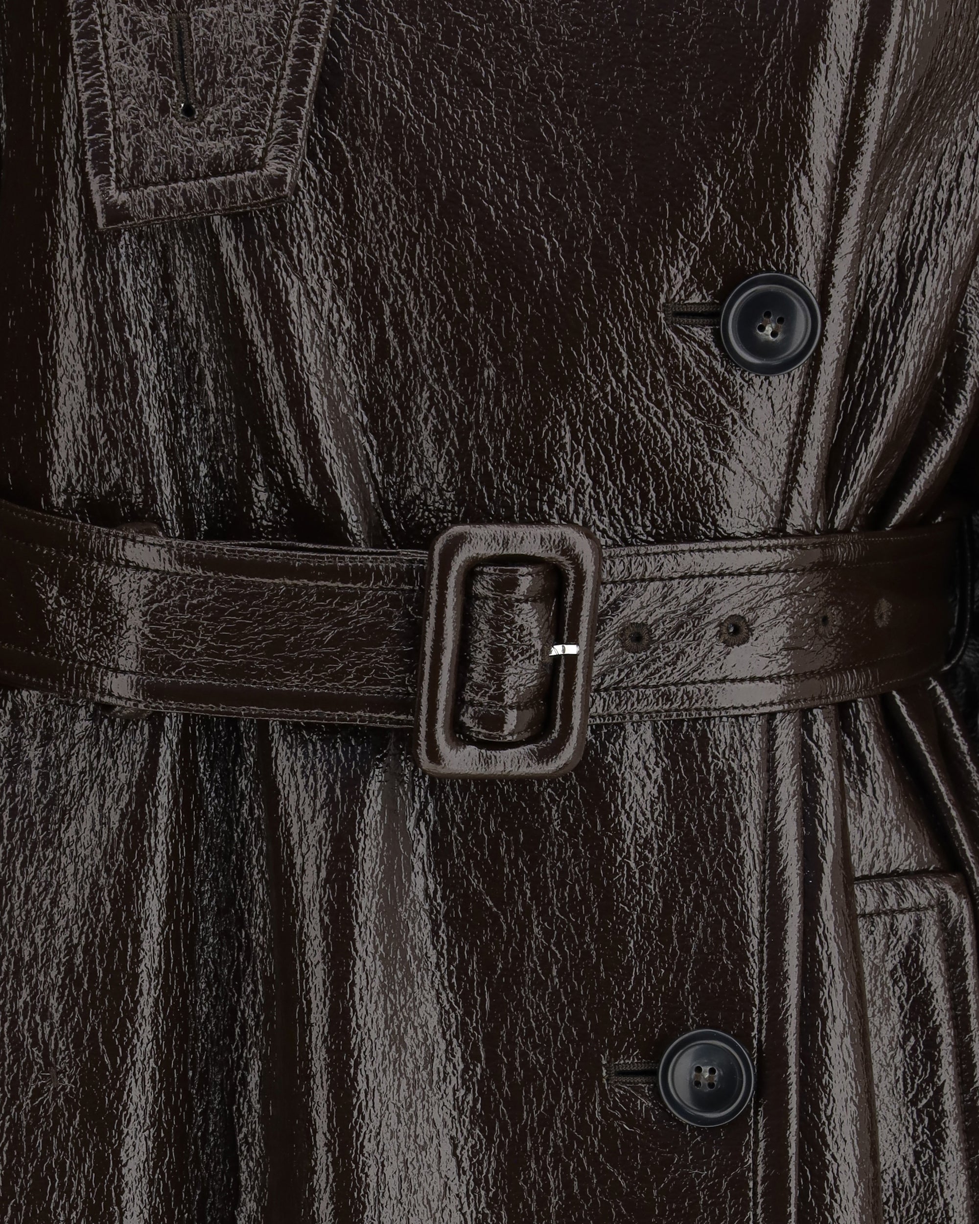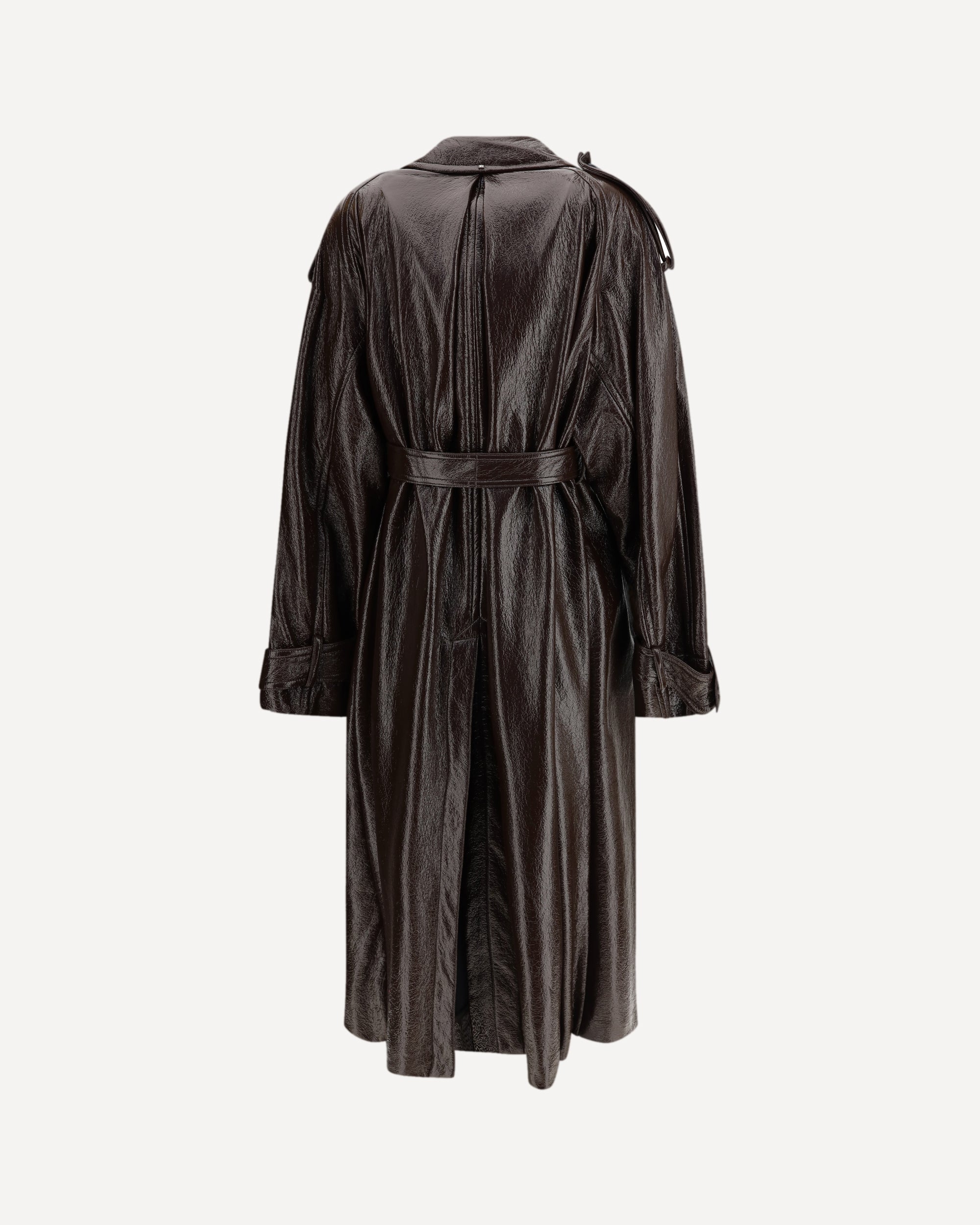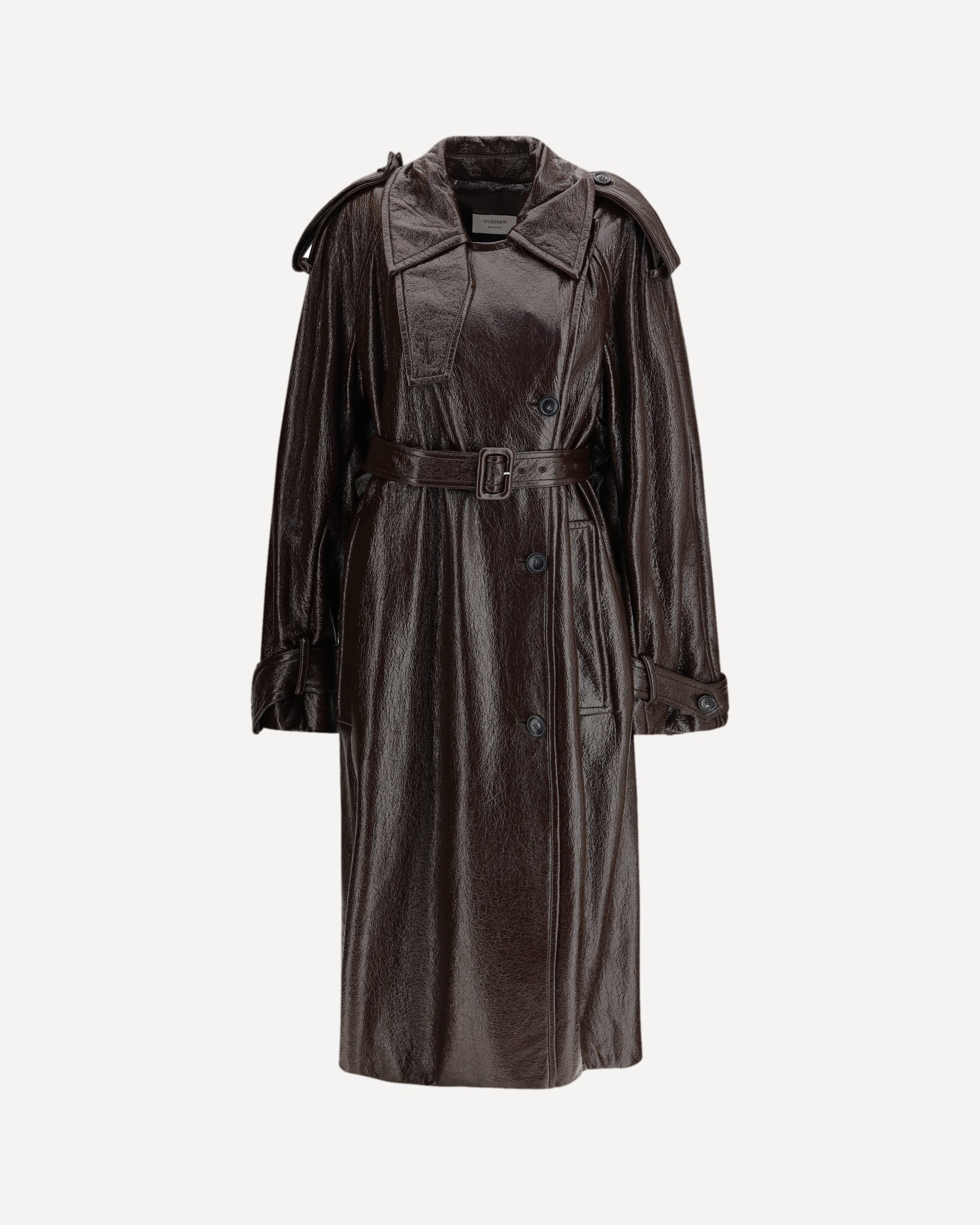 The Bairo long trench Coat by Sportmax reimagines a classic outerwear icon with a modern glossy finish. Crafted from coated brown fabric, it features a shirt collar with throat latch, visible side button closure, and military-inspired details such as shoulder and cuff epaulettes. A covered-buckle belt defines the waist, while the relaxed, fluid silhouette enhances movement, embodying a refined yet confident sense of style.