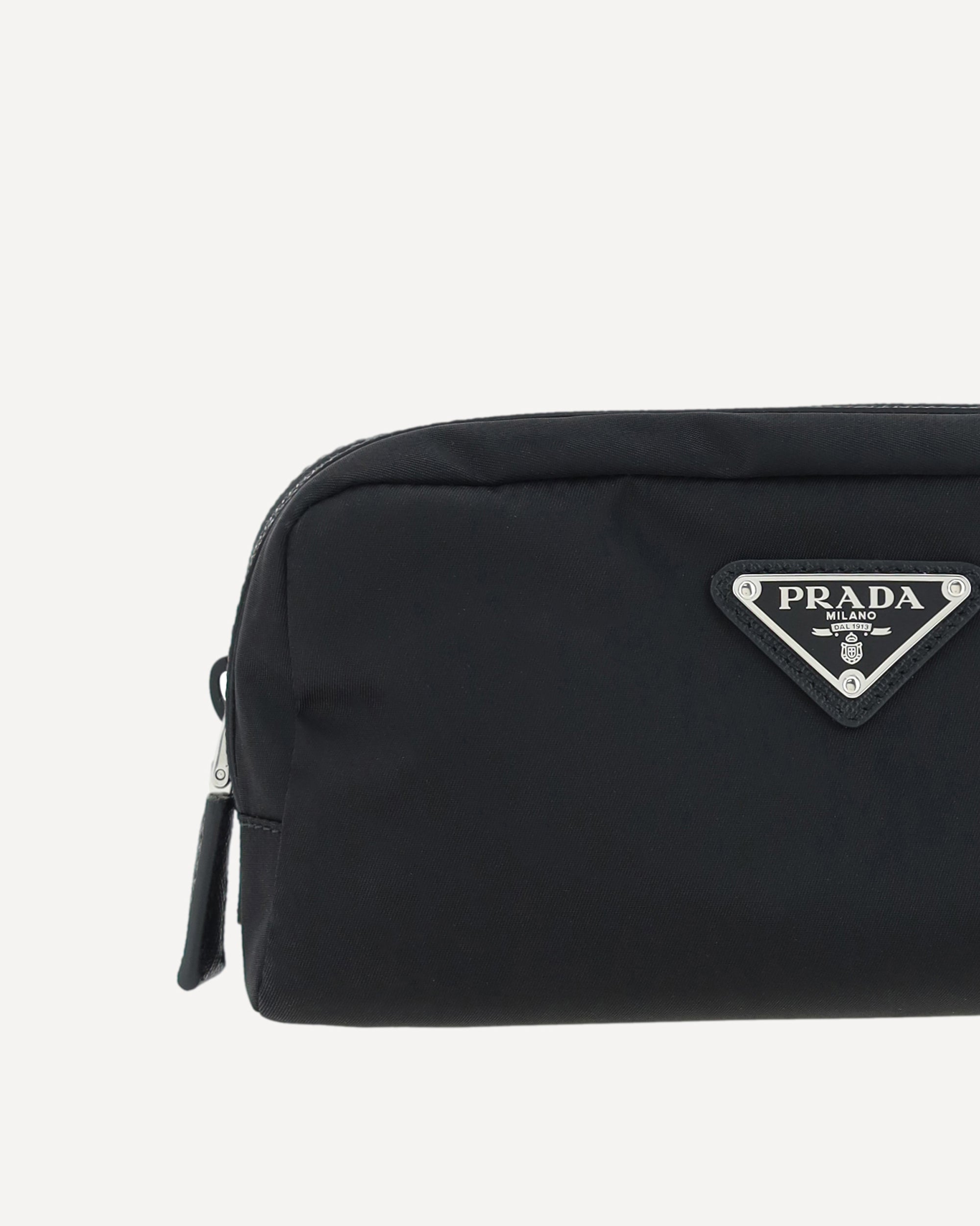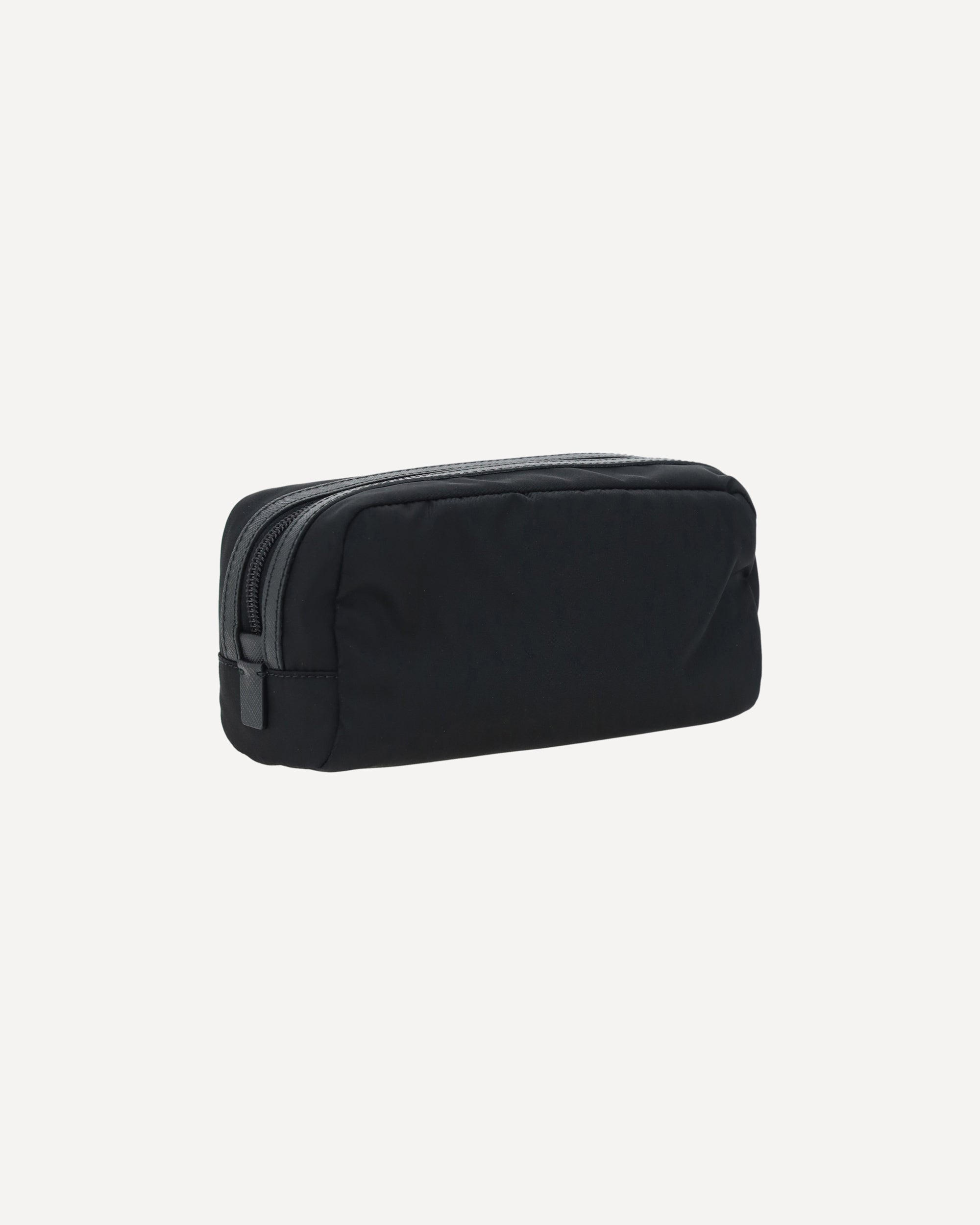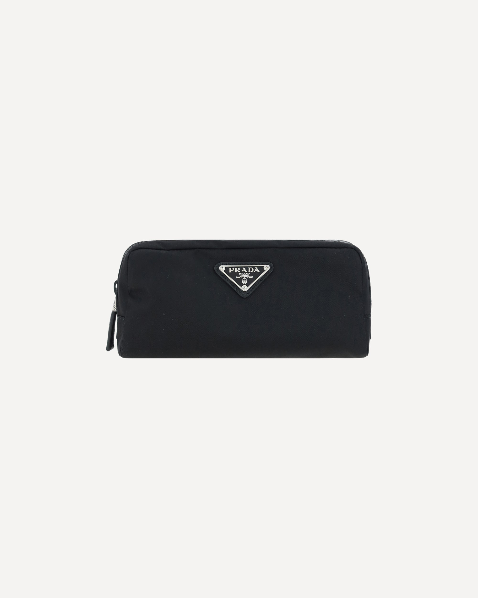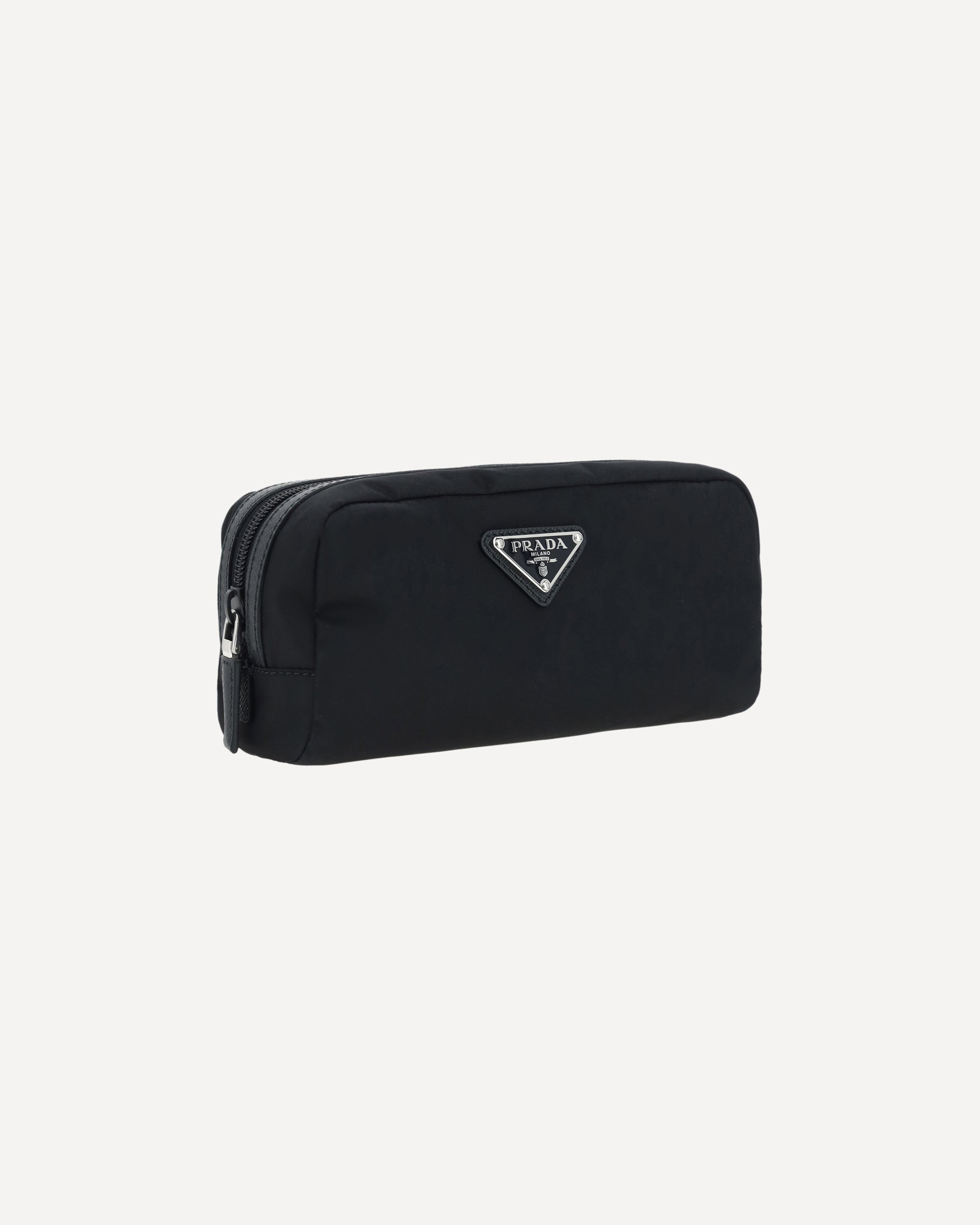 Re-Nylon Beauty Case by Prada, top zipper closure, triangular logo plaque applied to front, leather details.
