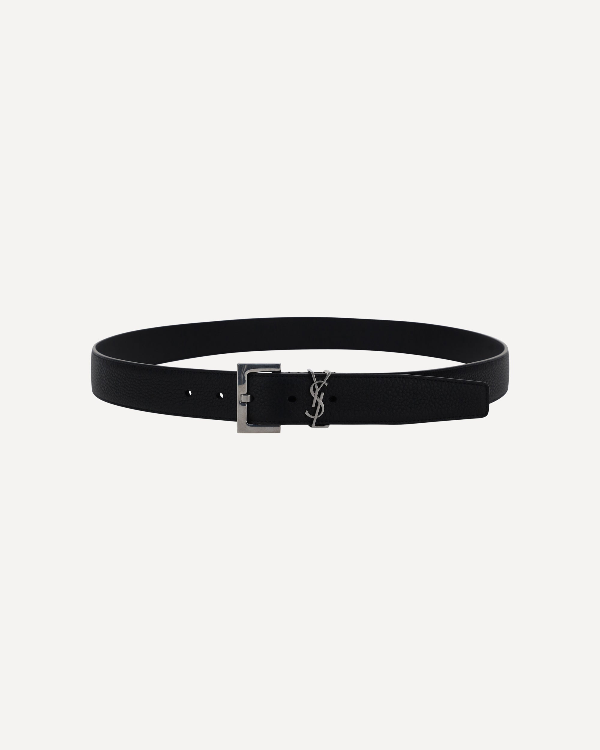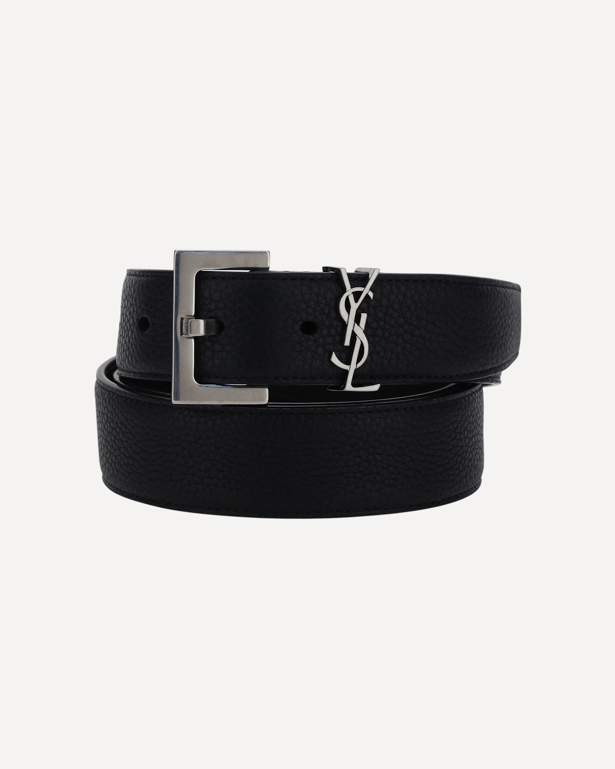 Calfskin Belt by Saint Laurent, loop detail with iconic YSL logo, square metal buckle, adjustable closure.