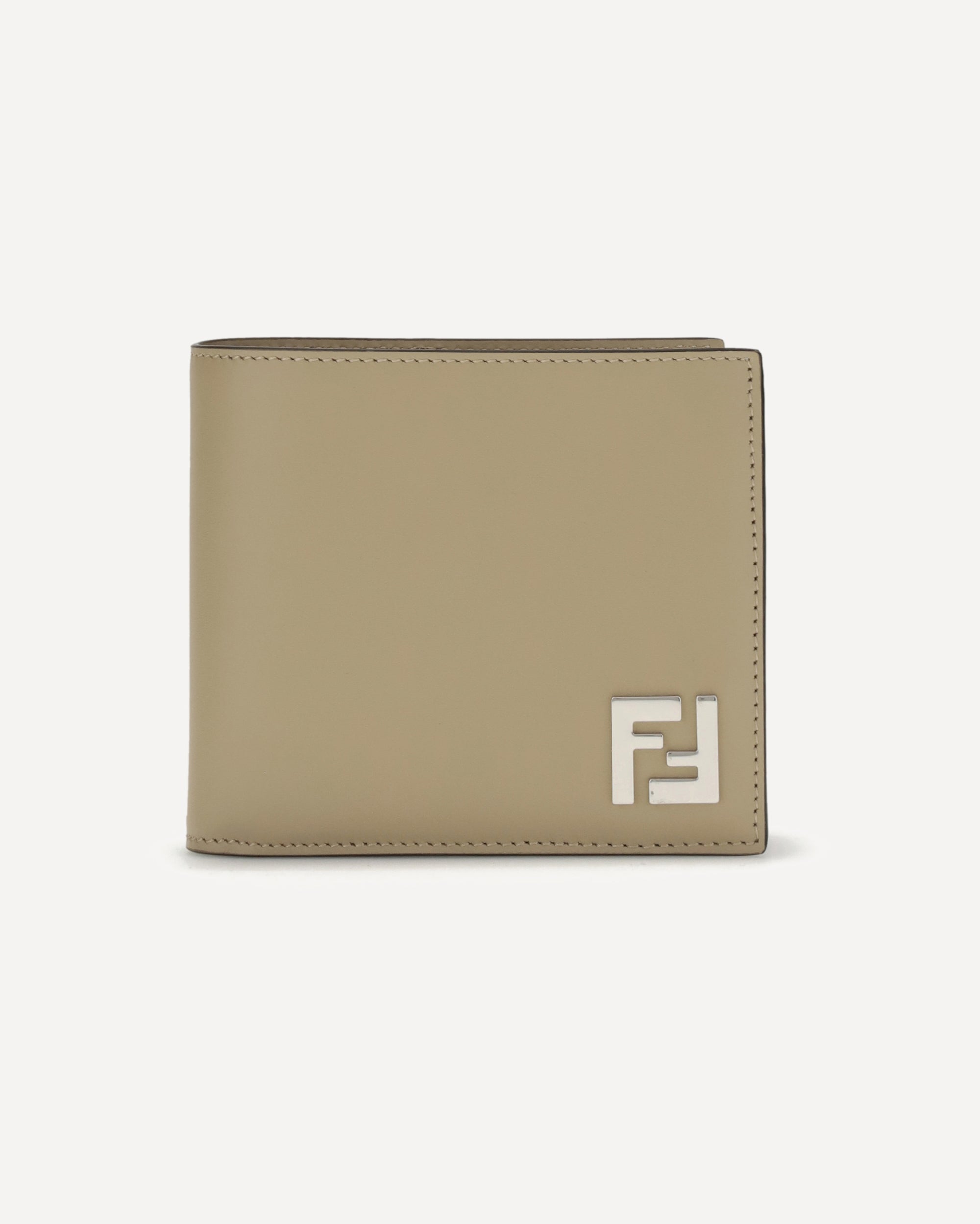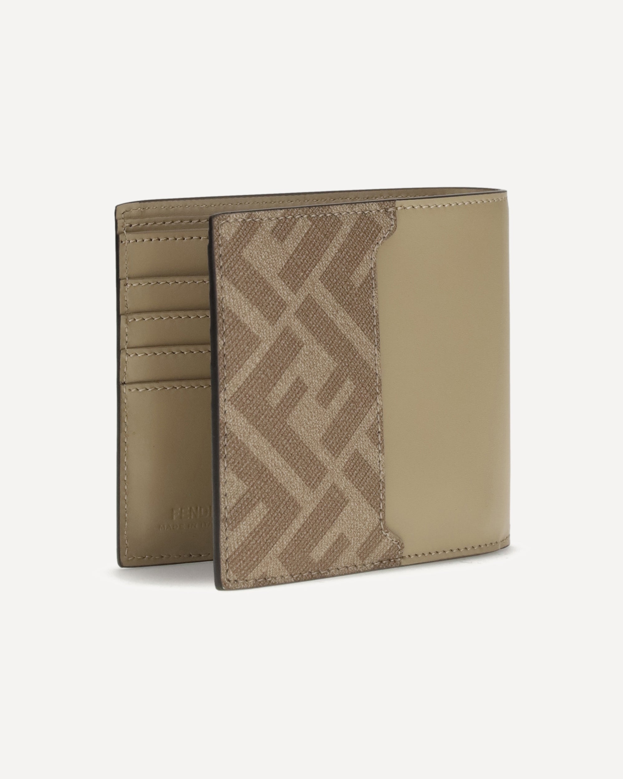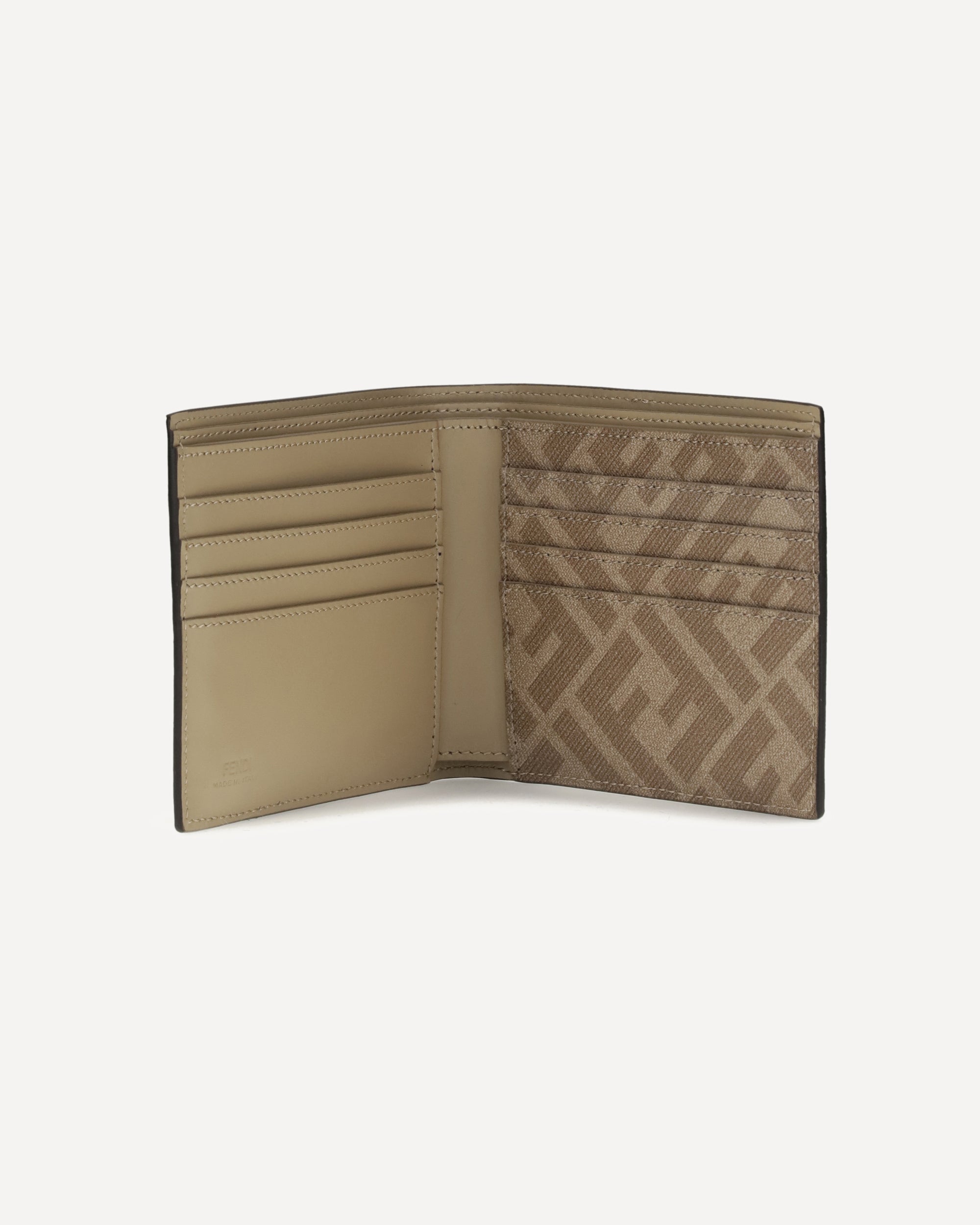 Fendi's FF leather and canvas bifold Wallet combines functionality with refined style. The interior is organized with 8 card slots, two bill compartments and a flat back pocket. Made of beige leather with tone-on-tone FF Canvas details, it is embellished with the Squared FF motif in palladium-finished metal.
