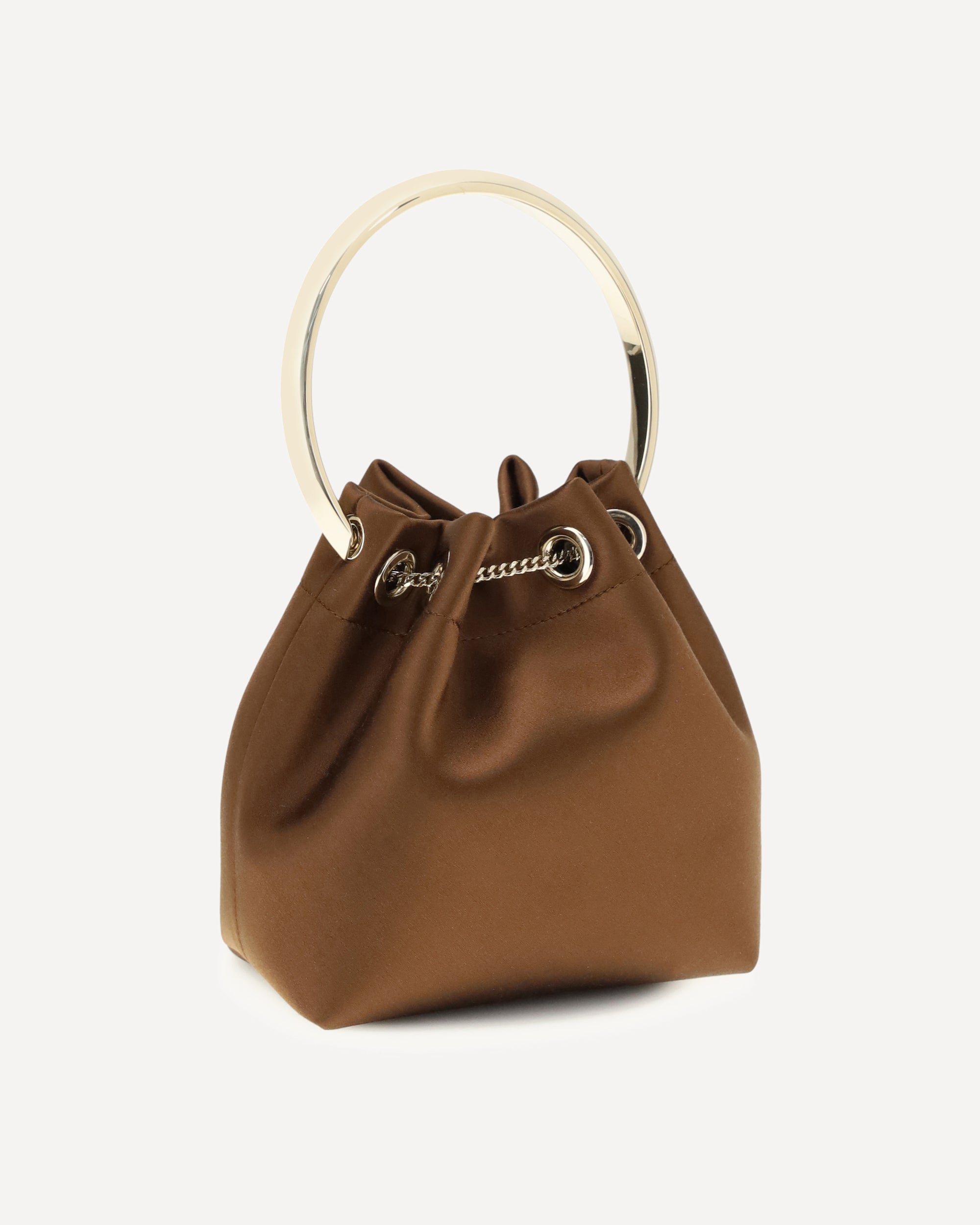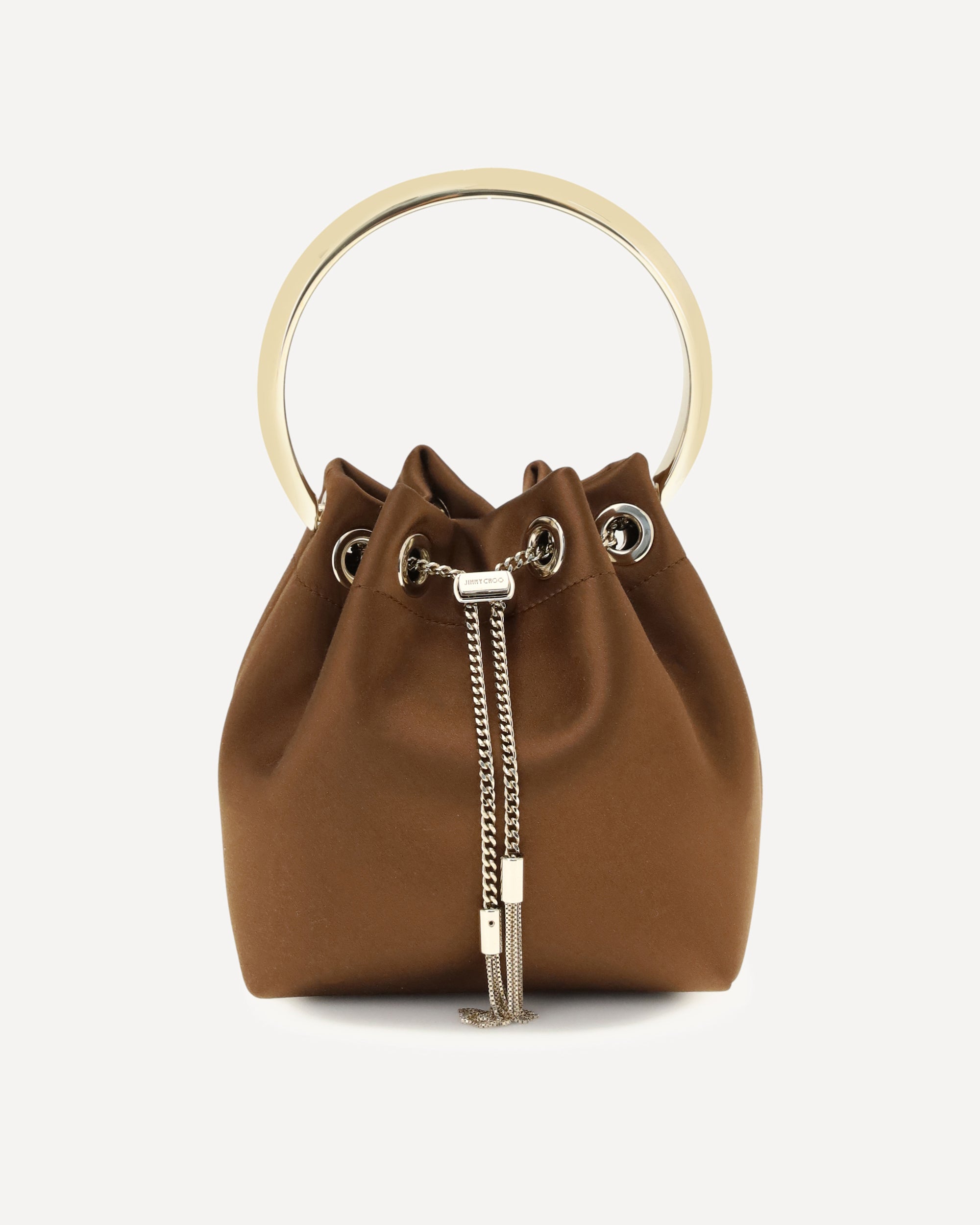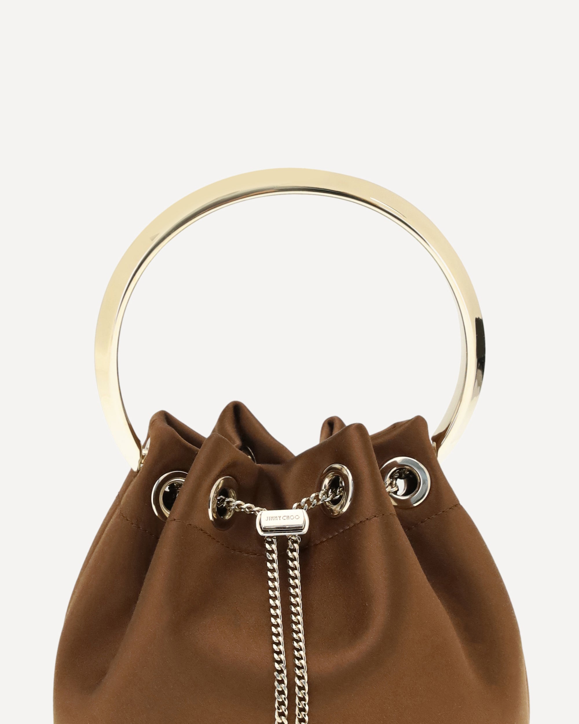 Bon Bon Bucket Bag by Jimmy Choo is an elegant and striking accessory. Made of silk, it features a round metal handle and a chain drawstring closure that adds a sophisticated and contemporary touch. The single interior compartment provides essential space for essentials, making it perfect for evening events and special occasions.
