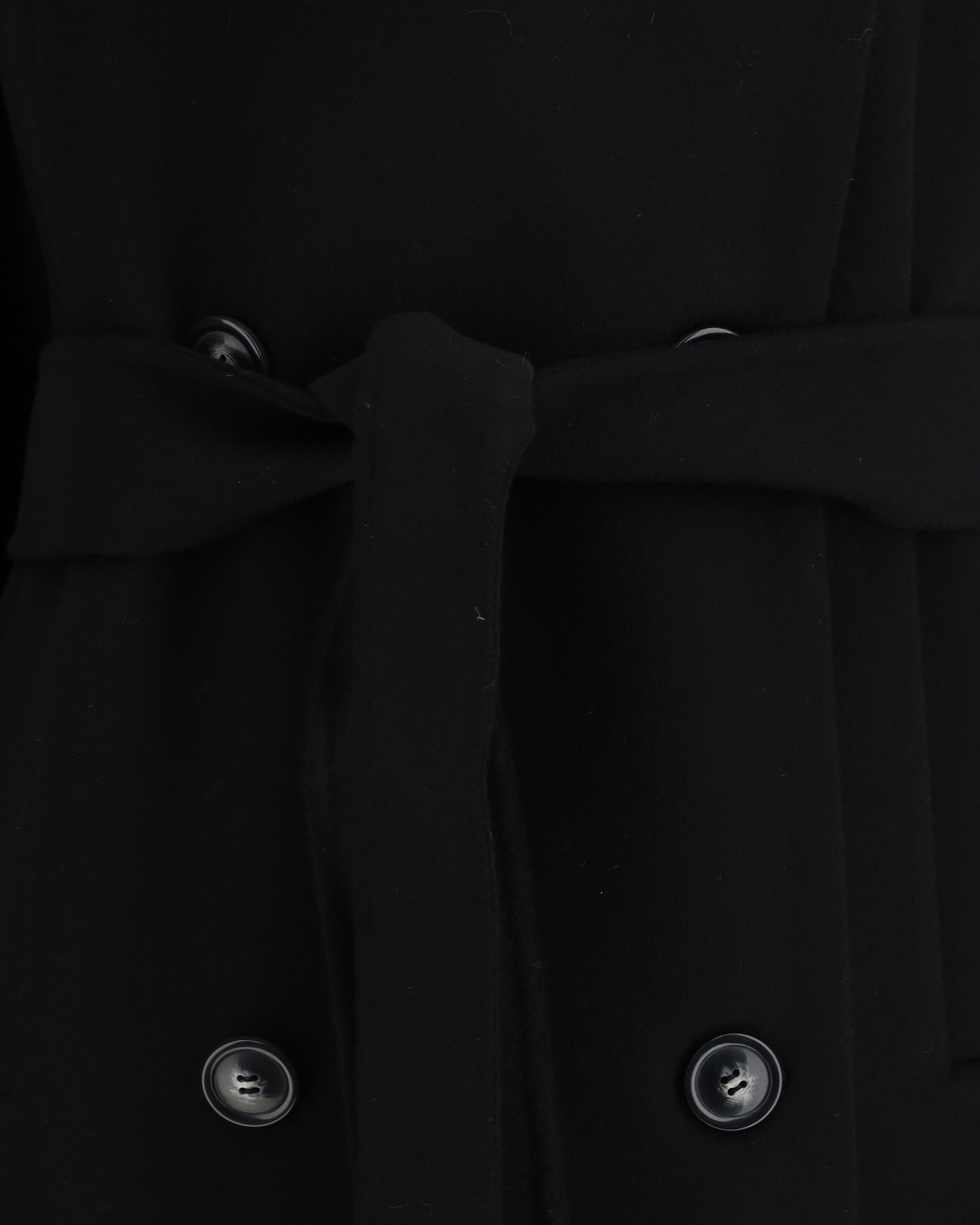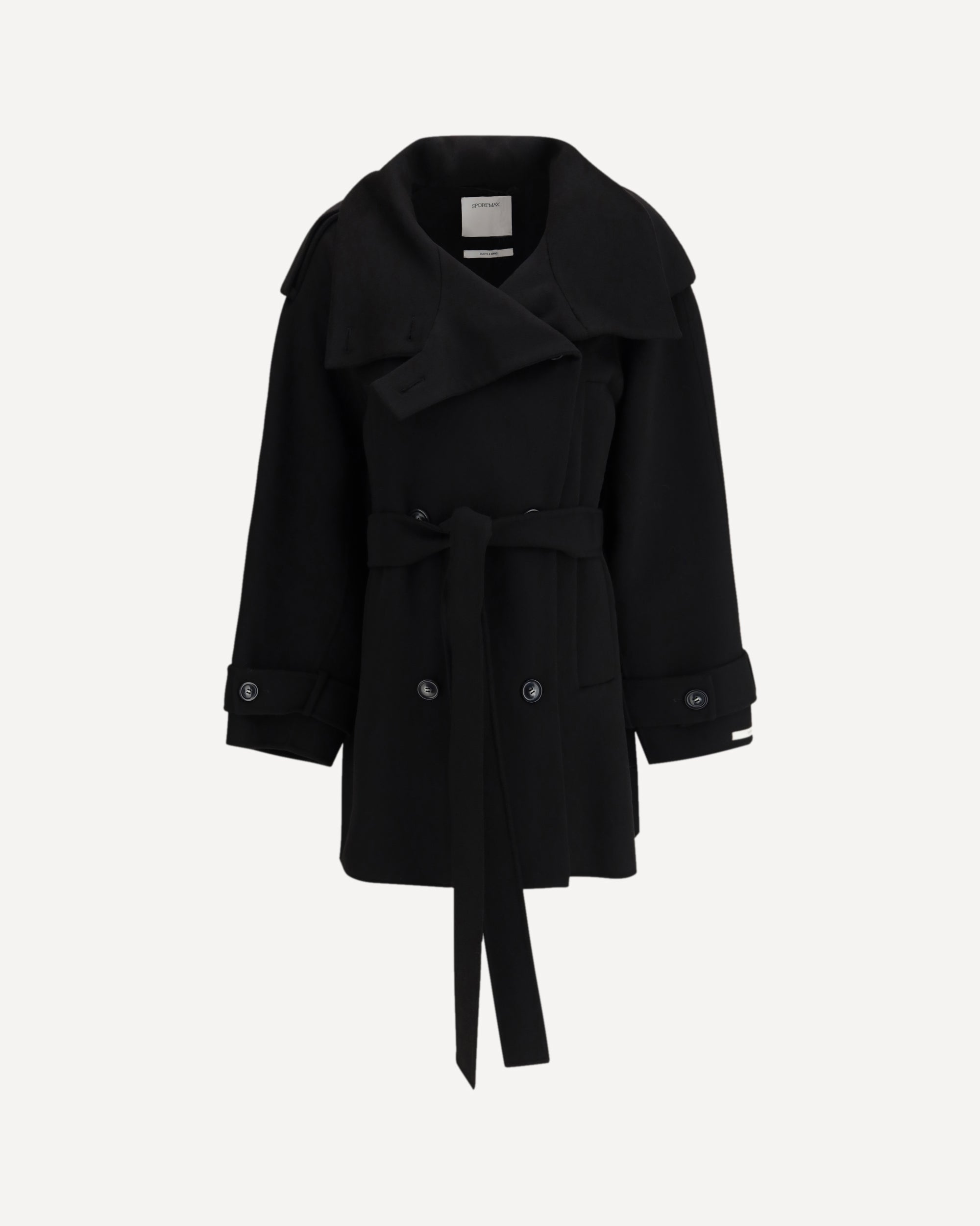 The short wool Trench Coat by Sportmax is crafted from pure double-faced wool, offering a soft structure that enhances its wide, flowing silhouette. The stand-up collar with double button detail and the asymmetric button closure lend a sharp tailored character, while the waist belt allows for adjustable shaping. Large welt pockets complete this essential yet refined design, a modern reinterpretation of the timeless trench coat.