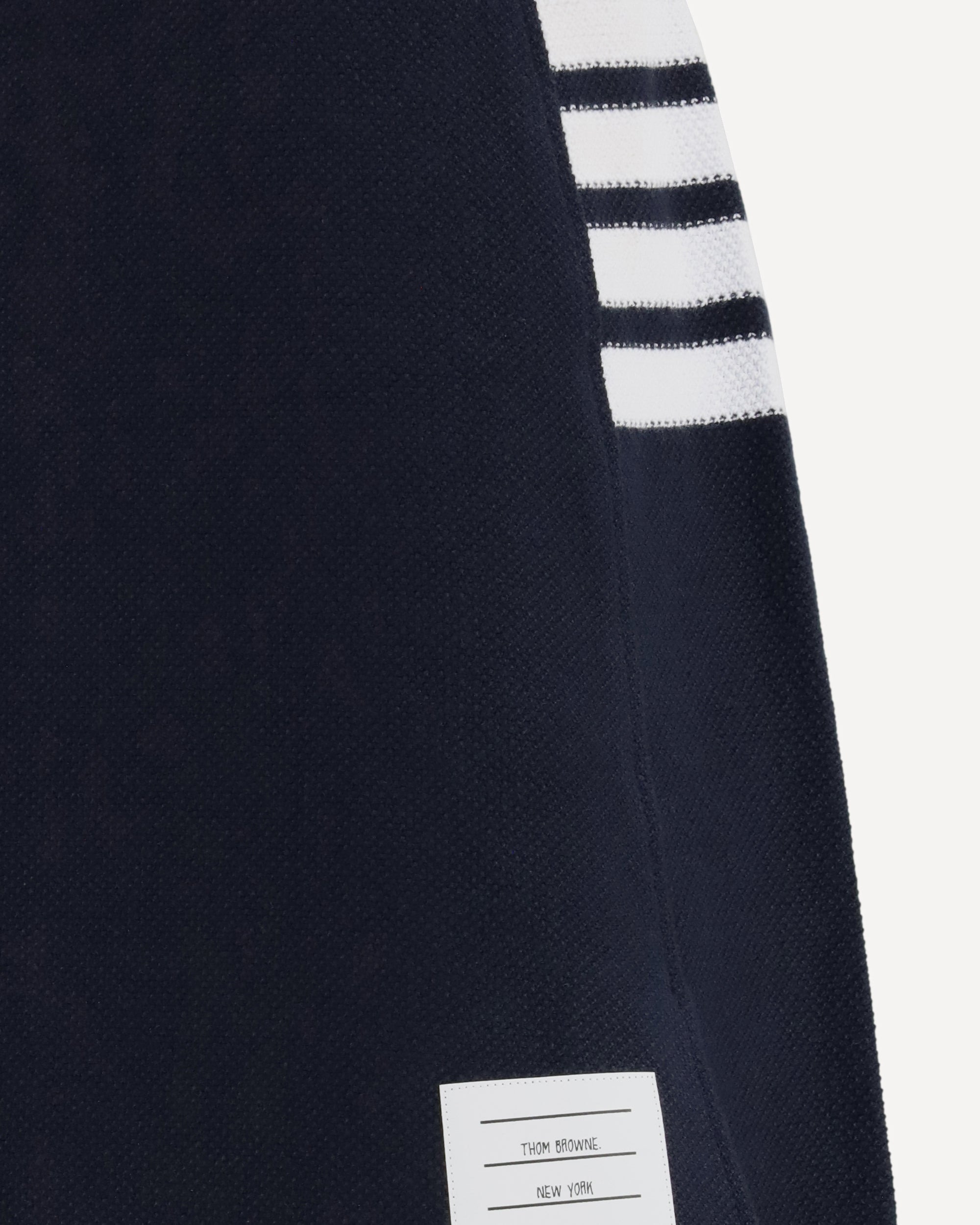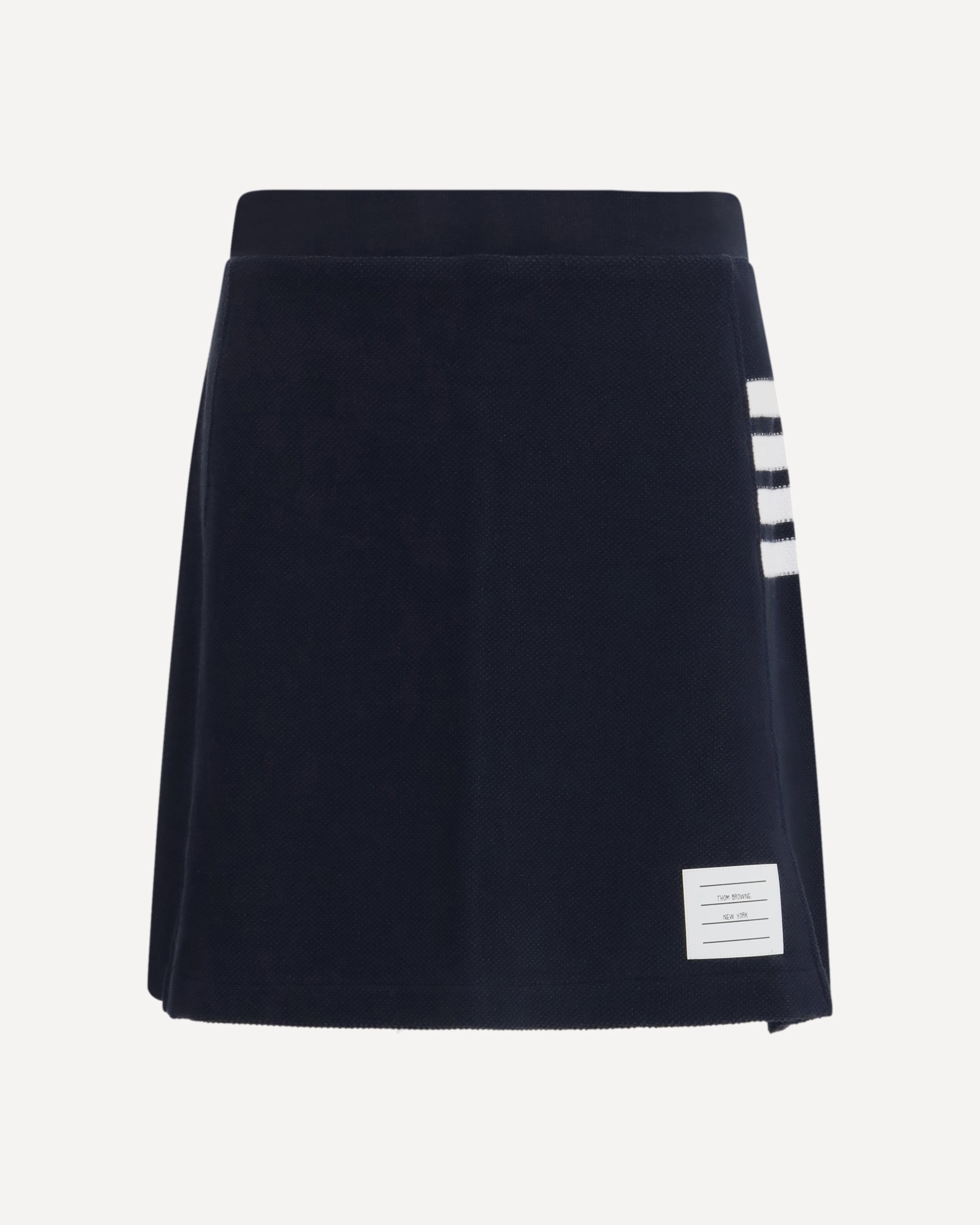 The 4-bar piqué mini Skirt by Thom Browne features box pleats that add volume and movement. The 4-bar detailing, a distinctive symbol of the brand, and the name tag appliqué add a touch of recognizability. The grosgrain striped loop tab with signature completes the look, creating a mix of elegance and sportiness. A sophisticated and modern garment, perfect for a preppy and contemporary look.