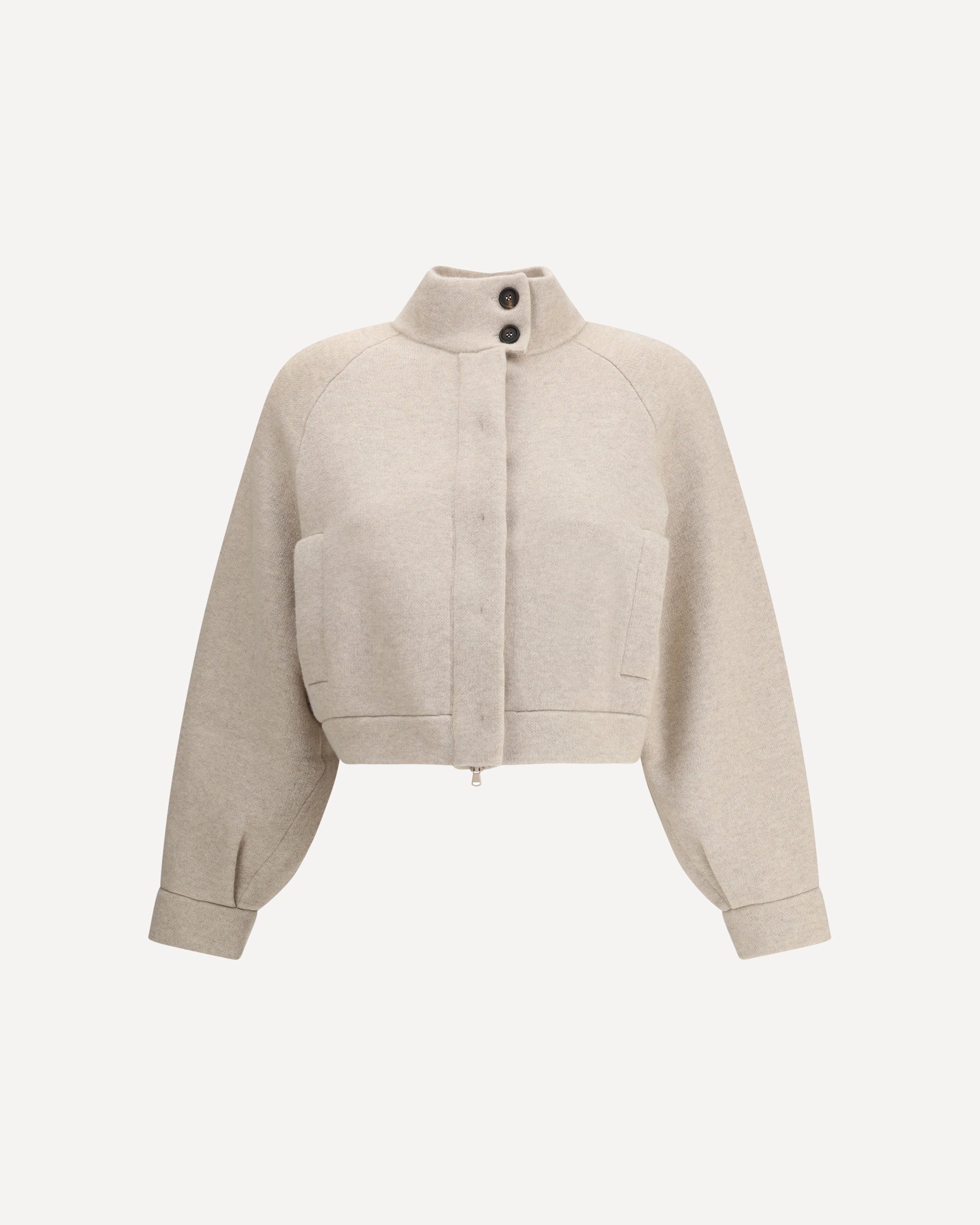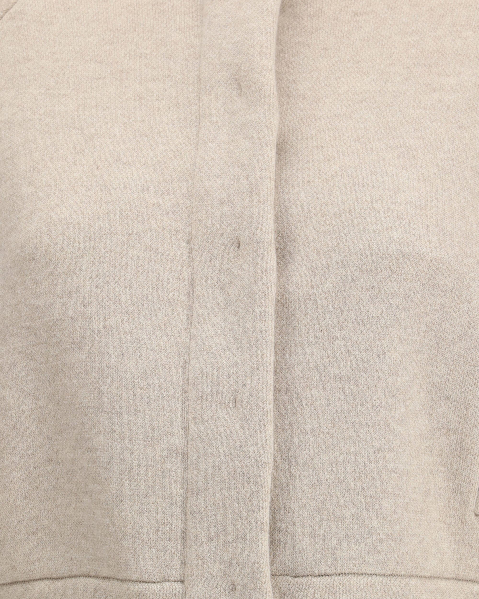 The Cashmere Cardigan by Brunello Cucinelli features a combined button and zipper closure, long sleeves with buttoned cuffs, and two welt pockets at the front, combining functionality with contemporary style.
