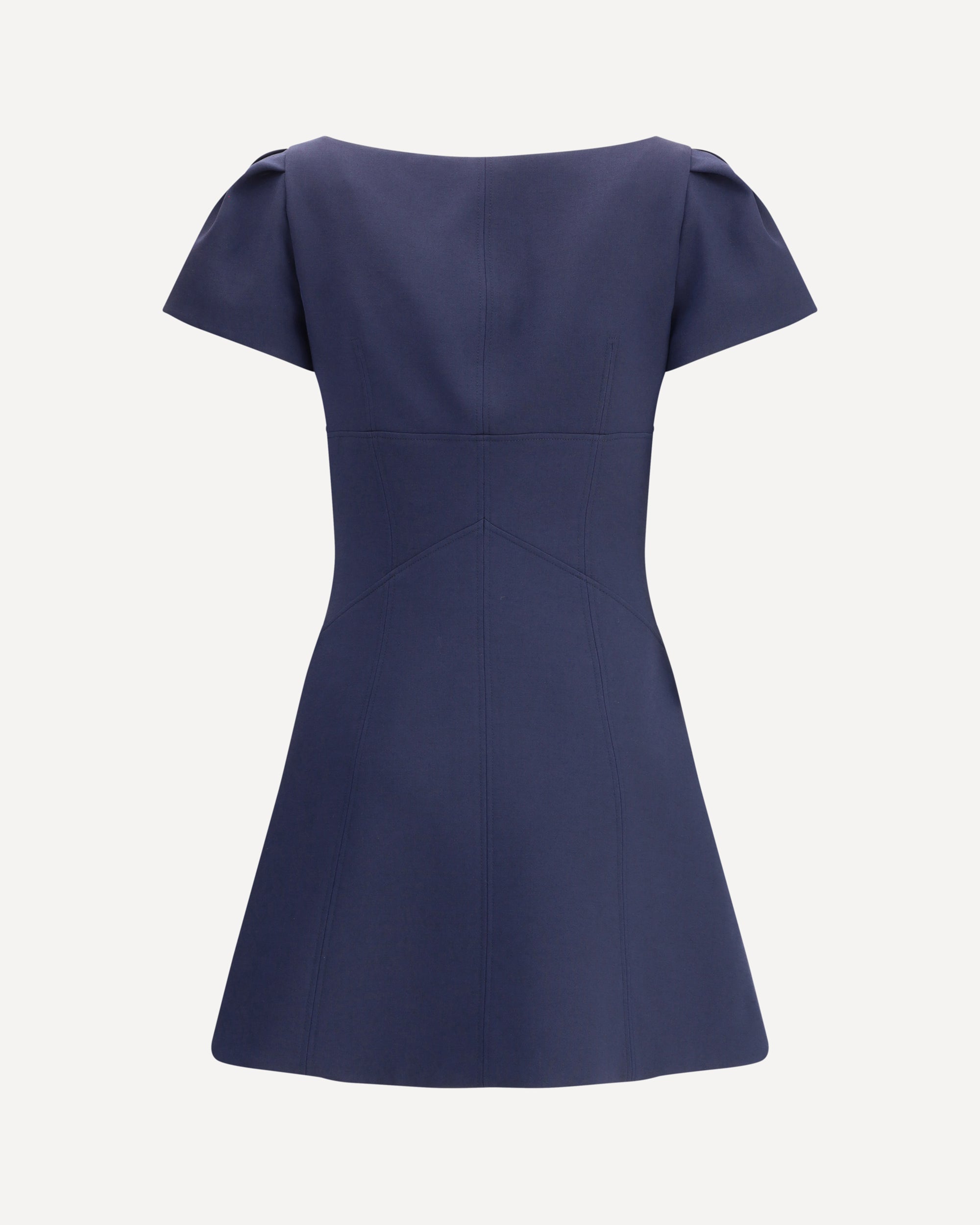Alexander McQueen's Short Dress is a garment that enhances the silhouette with bold, structured elegance. It features a distinctive square neckline that frames the décolleté and short gathered sleeves that add a touch of volume and romance. Corset-style seams flawlessly outline the figure, recalling the brand's sartorial craftsmanship and penchant for sculptural shapes. This dress perfectly embodies the Alexander McQueen aesthetic, combining strength and delicacy in a unique design.