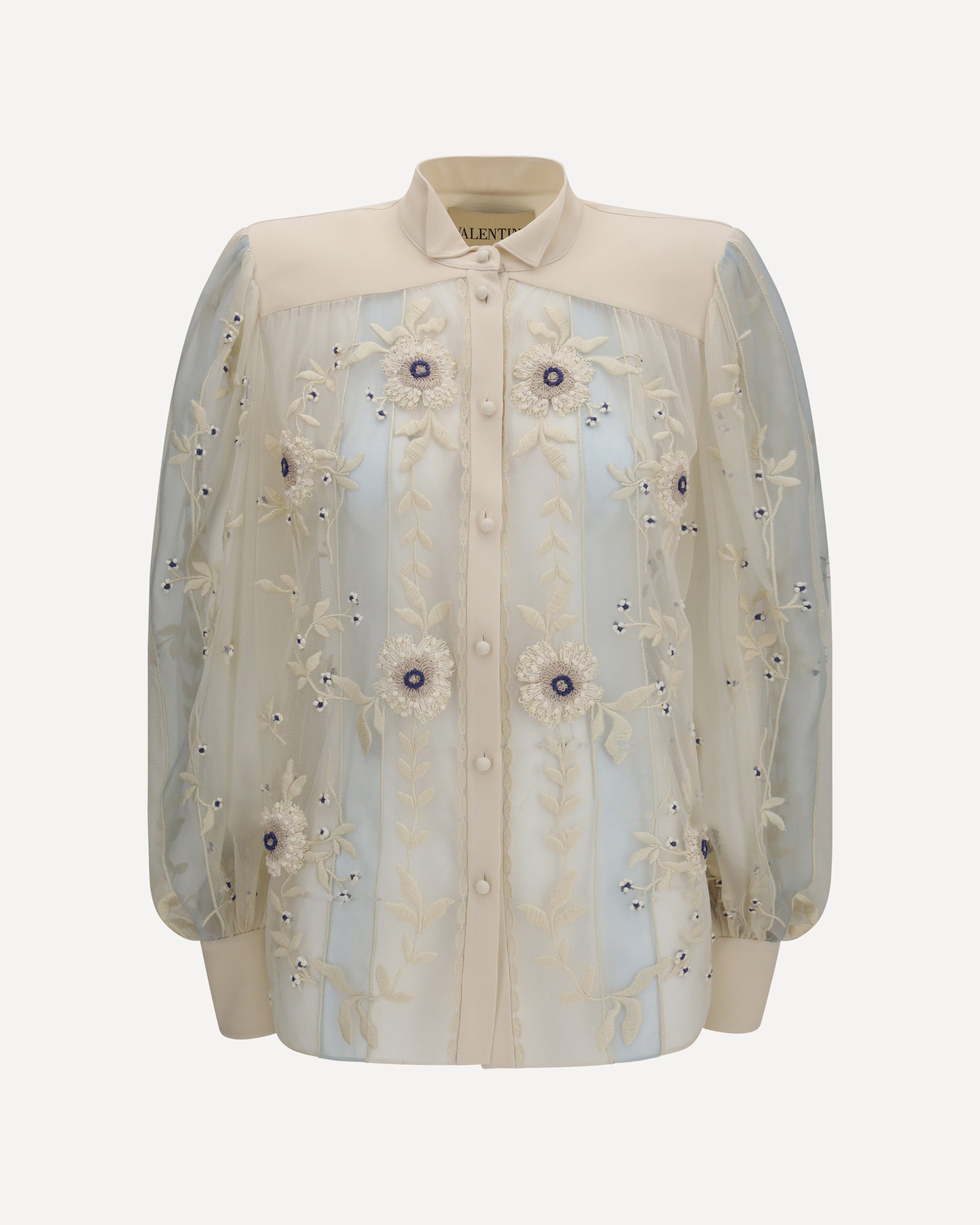 The embroidered tulle Shirt by Valentino Garavani stands out for its romantic and sophisticated design, reinterpreting the classic shirt through a feminine and refined aesthetic. Crafted from lightweight tulle, it features a delicate and sheer silhouette that adds lightness and elegance to the piece. The contrasting classic collar introduces structure and definition to the design, while the front fastening with fabric-covered buttons enhances the garment with a refined and harmonious detail. Contrasting silk cuffs complete the style, adding a luxurious and sophisticated accent that emphasizes the Maison’s distinctive elegance.