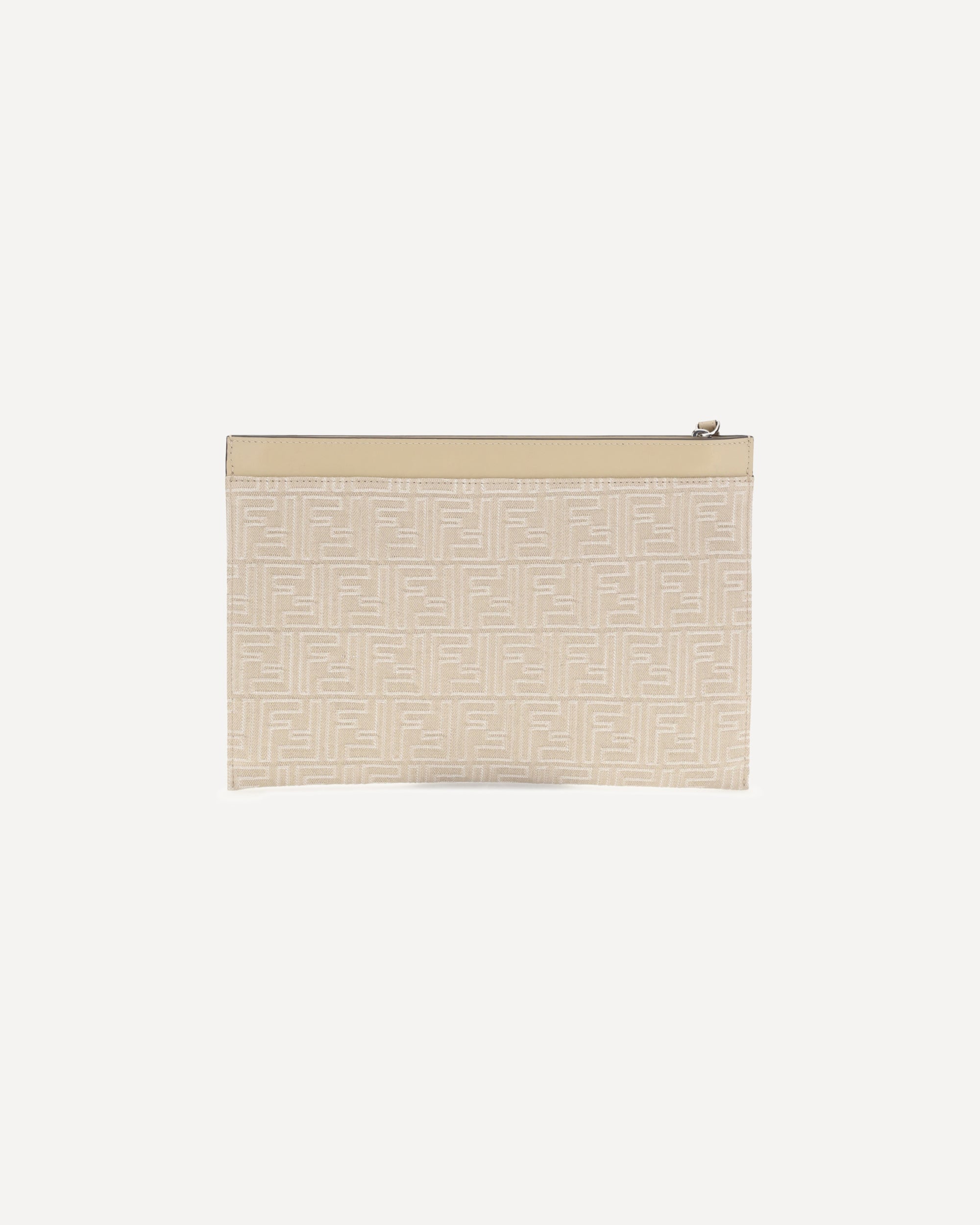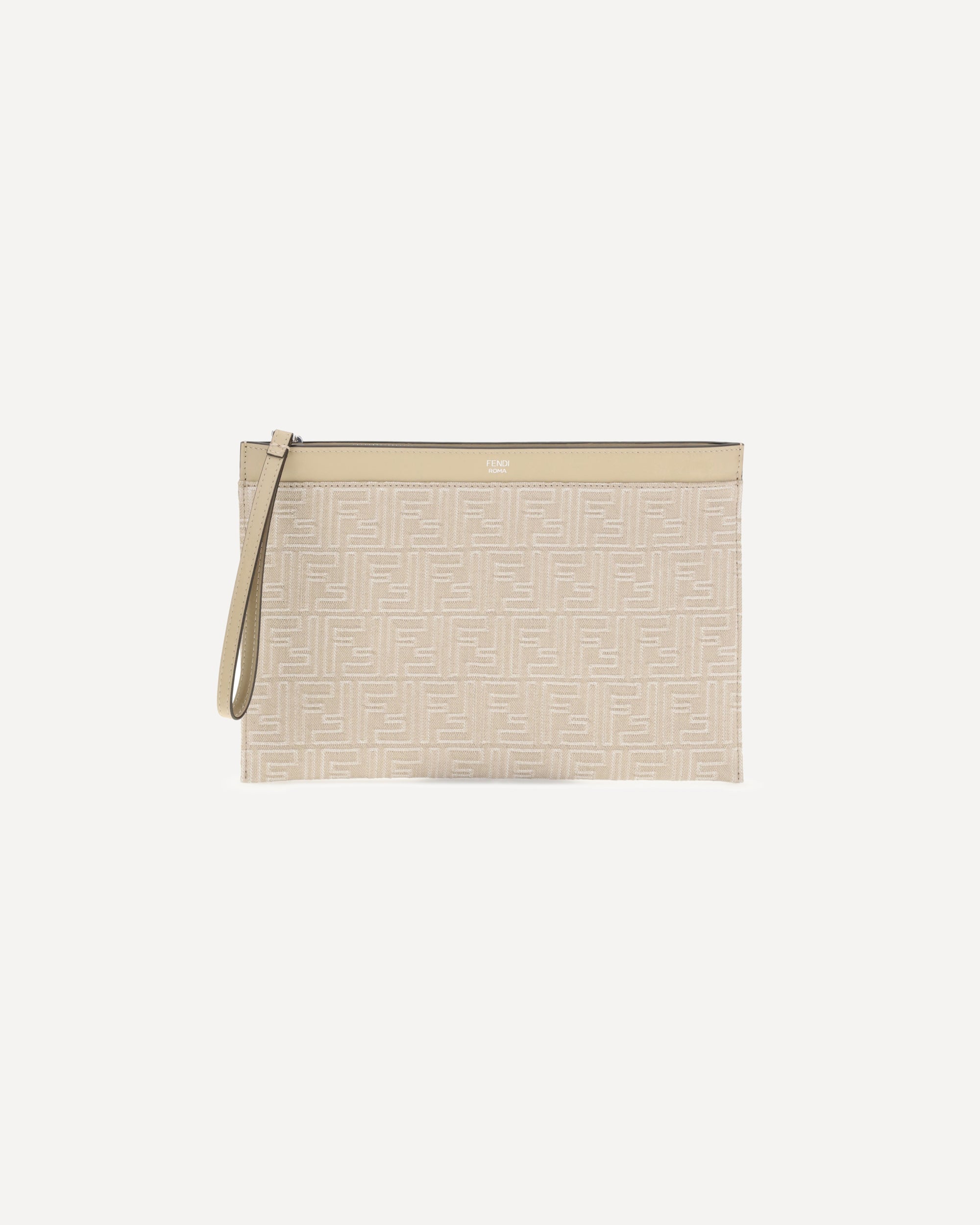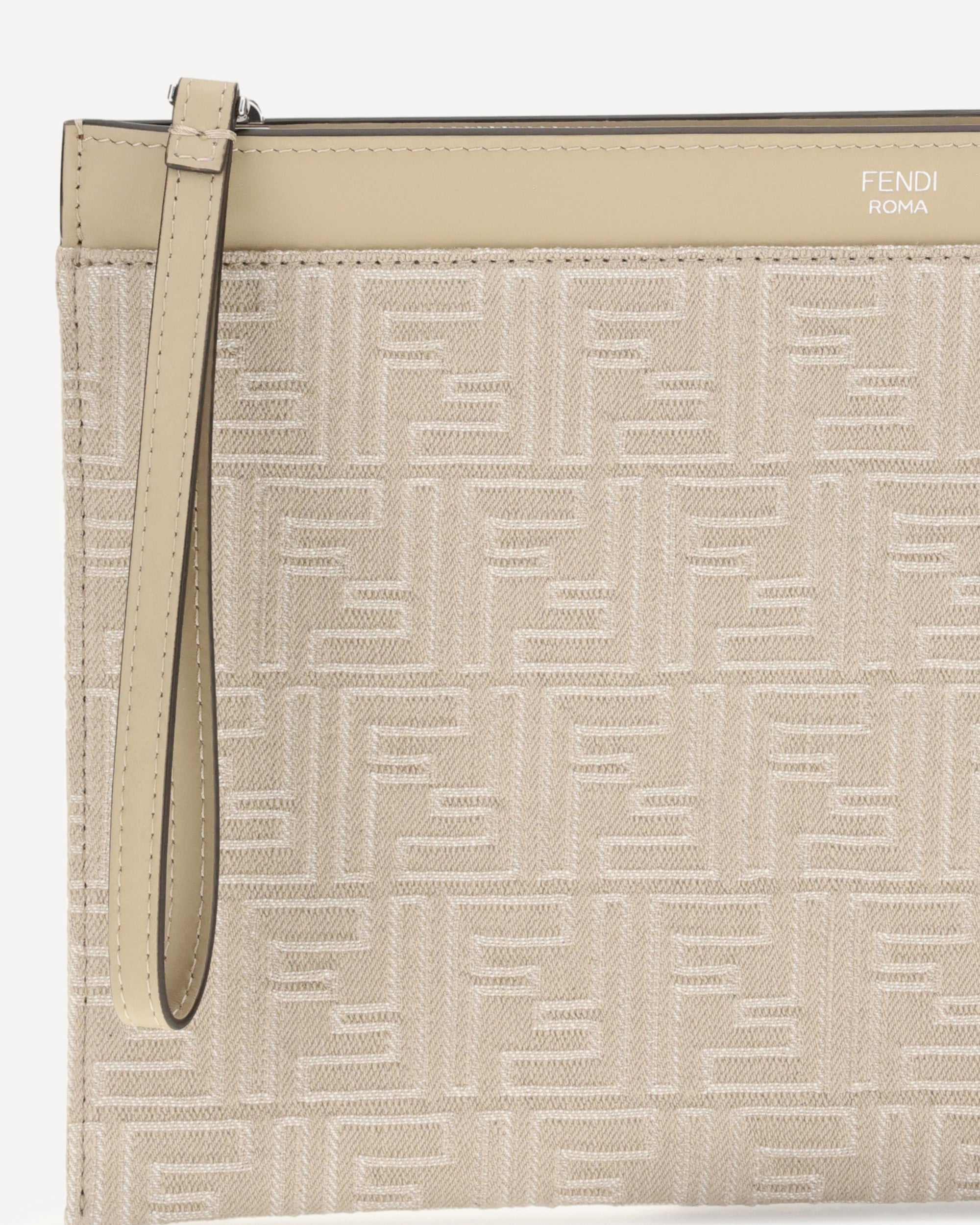 The Fendi denim Pouch is a compact and sophisticated accessory, crafted from denim with an all-over FF motif embroidery. The Fendi Roma print on the top highlights its distinctive identity. Completed with a leather wrist strap and a practical zip closure, it combines urban style and functionality in perfect Fendi spirit.