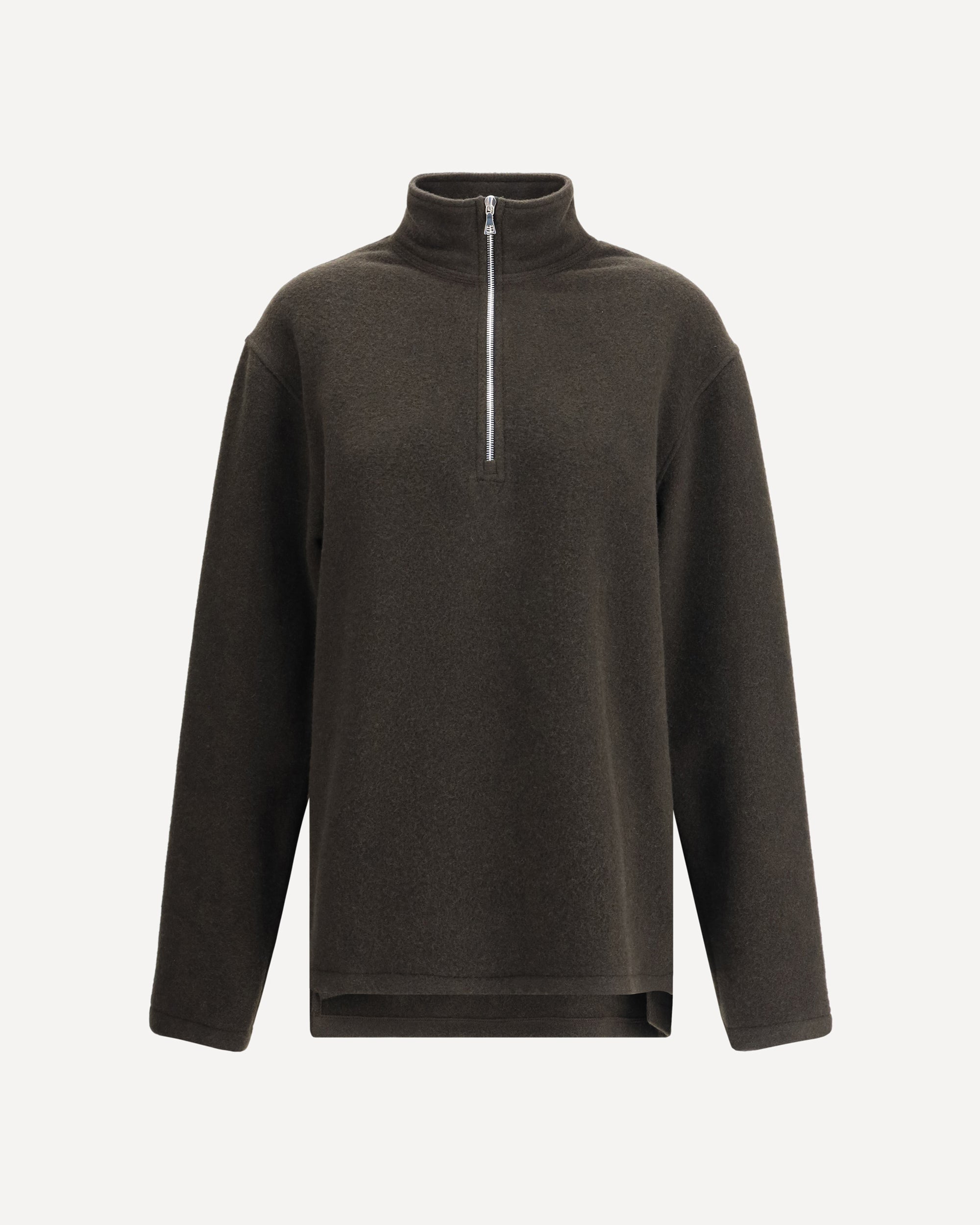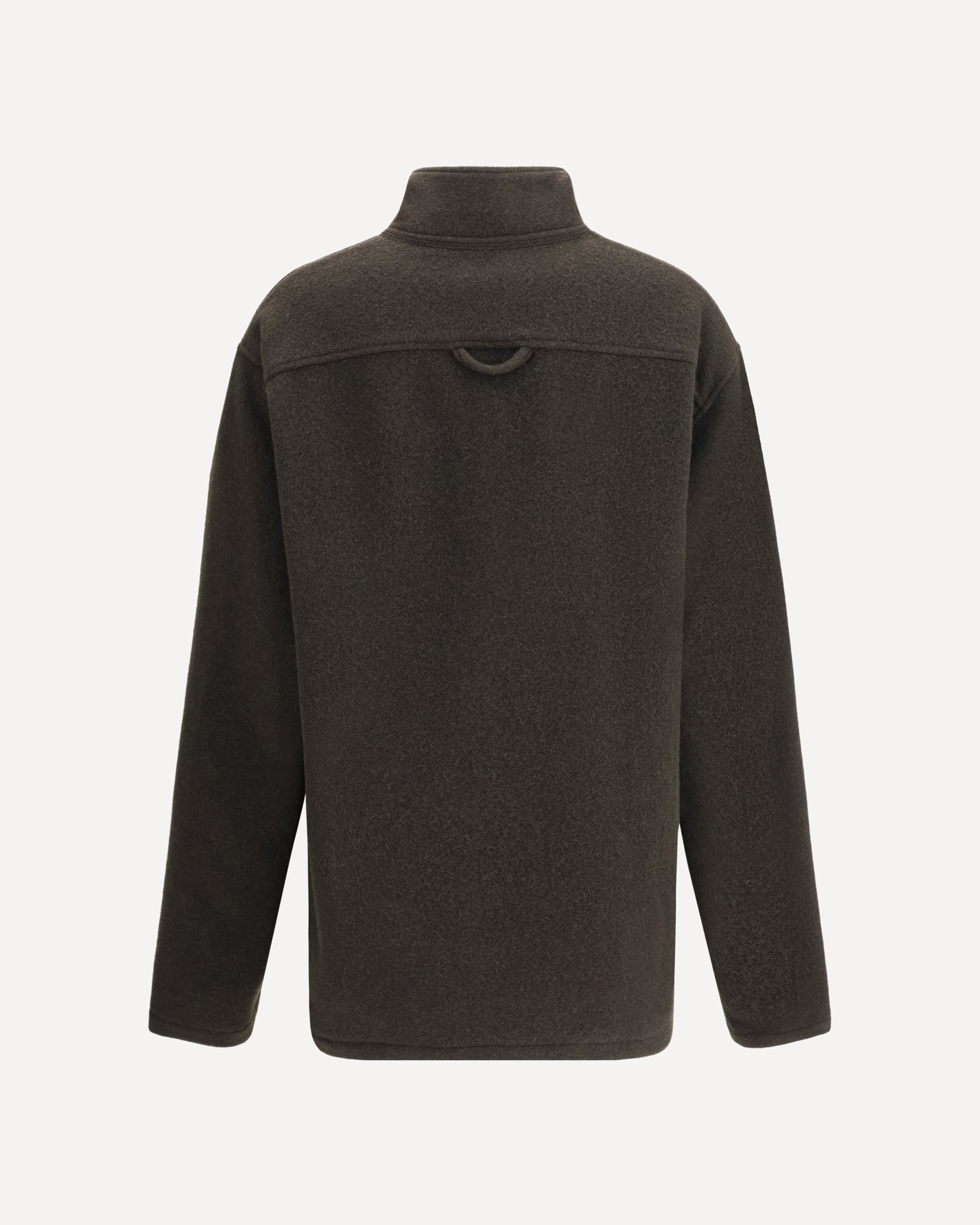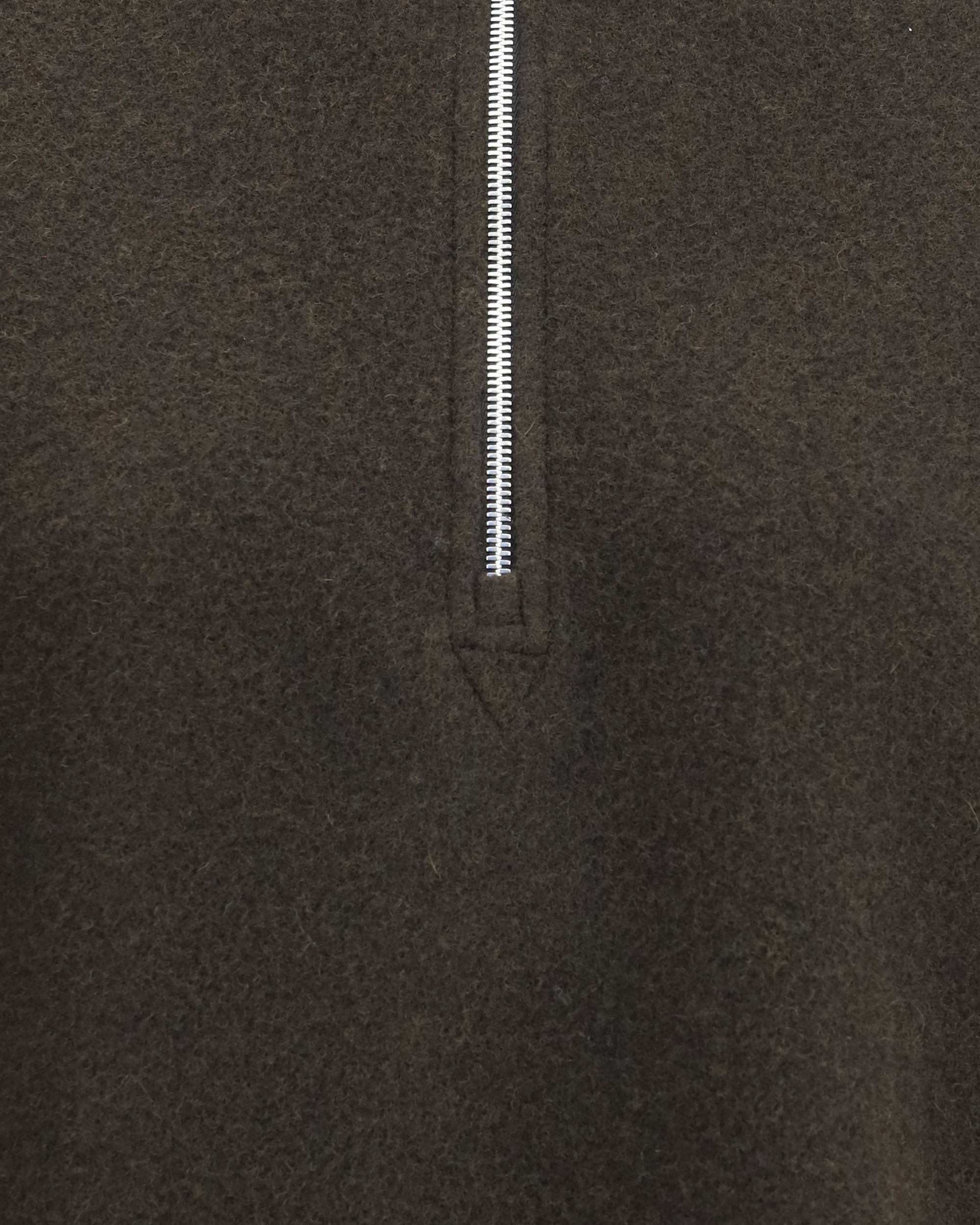 The Suede Wool Pile athletic Jacket is crafted from 100% natural wool, a biodegradable material that requires fewer washes. Ultra-lightweight with a soft, fluffy texture, it is the perfect piece for mid-season wear. Wool naturally regulates body temperature, ensuring constant comfort. This athletic-inspired design reflects Rier’s commitment to reducing microplastic release into nature. Made in Austria, it combines fine fabrics with precise tailoring, featuring a Riri® half zipper and standing collar. The unlined construction, with a slightly shorter front and longer back, is finished with side slits for greater ease of movement.