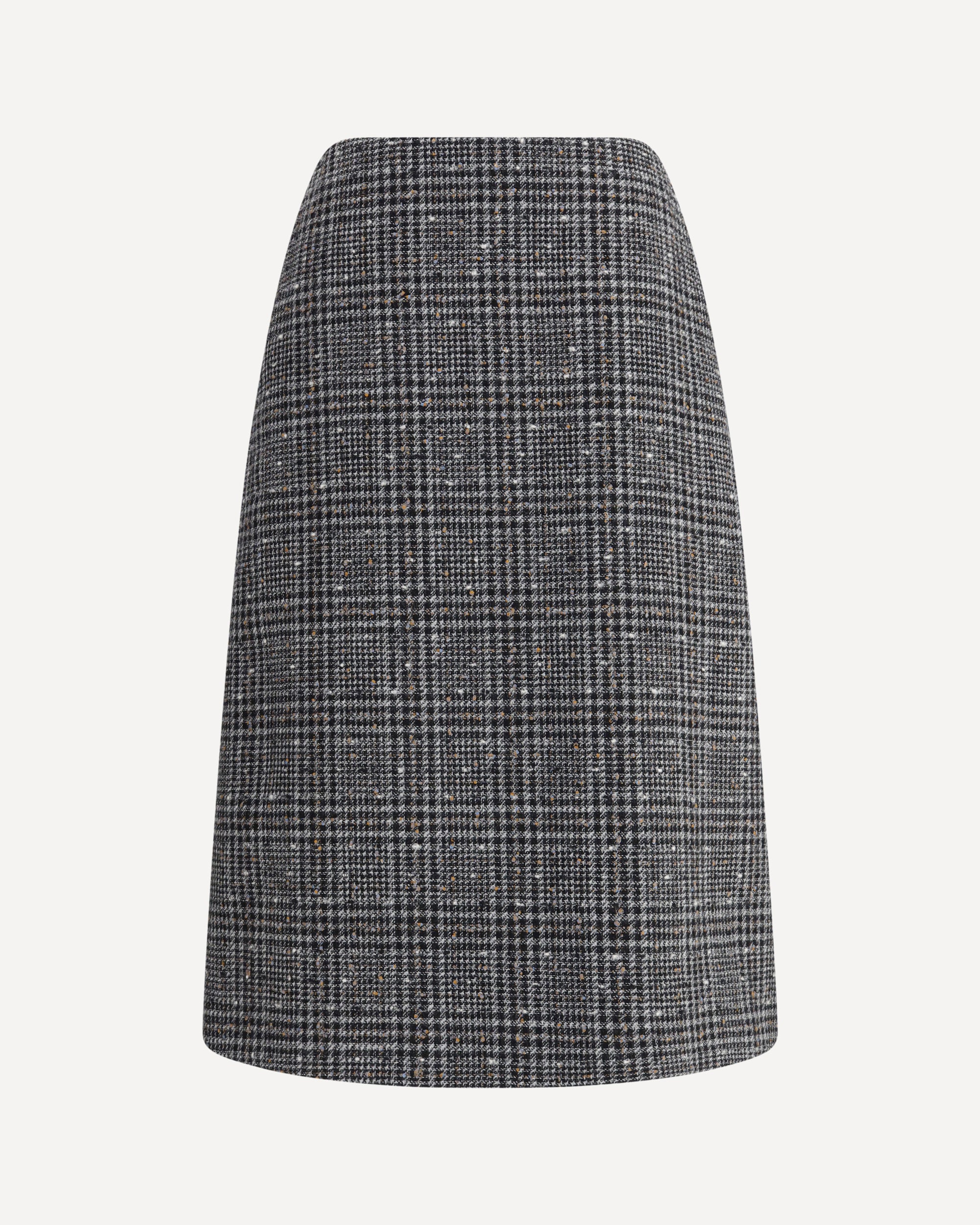 The Prince of Wales Tweed midi Skirt embodies timeless elegance through a flared silhouette that flows gracefully with every movement. A regular waist defines the figure with ease, while side pockets provide functional appeal. Finished with a zip closure for a clean line, the skirt highlights the refined texture of the wool-blend tweed, enhanced by the iconic Prince of Wales pattern.