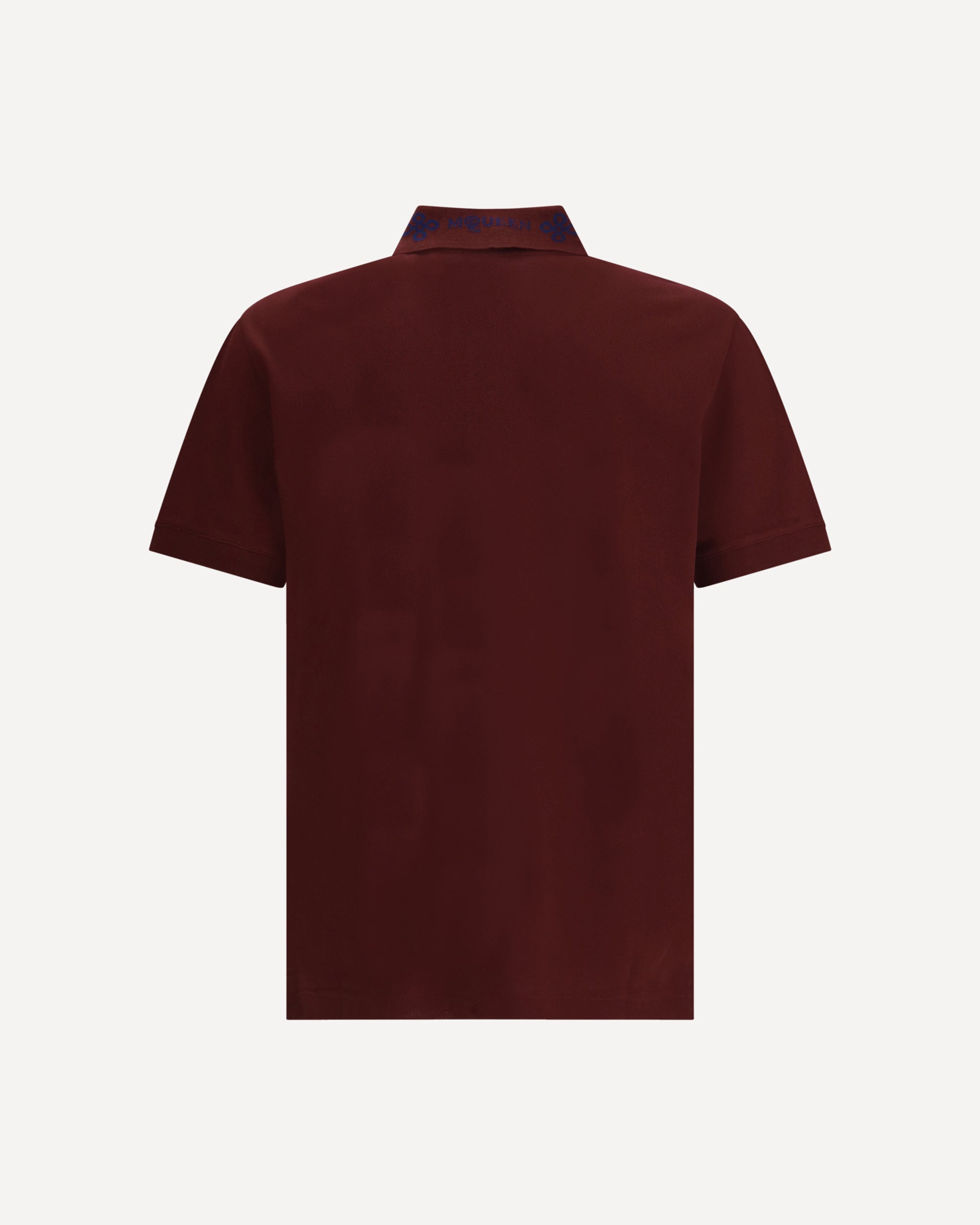 The Polo by McQueen with striped detail features a simple design enhanced by striped accents on the collar, adding a graphic and contemporary touch. The McQueen logo on the back provides brand recognition while maintaining a clean and modern style.